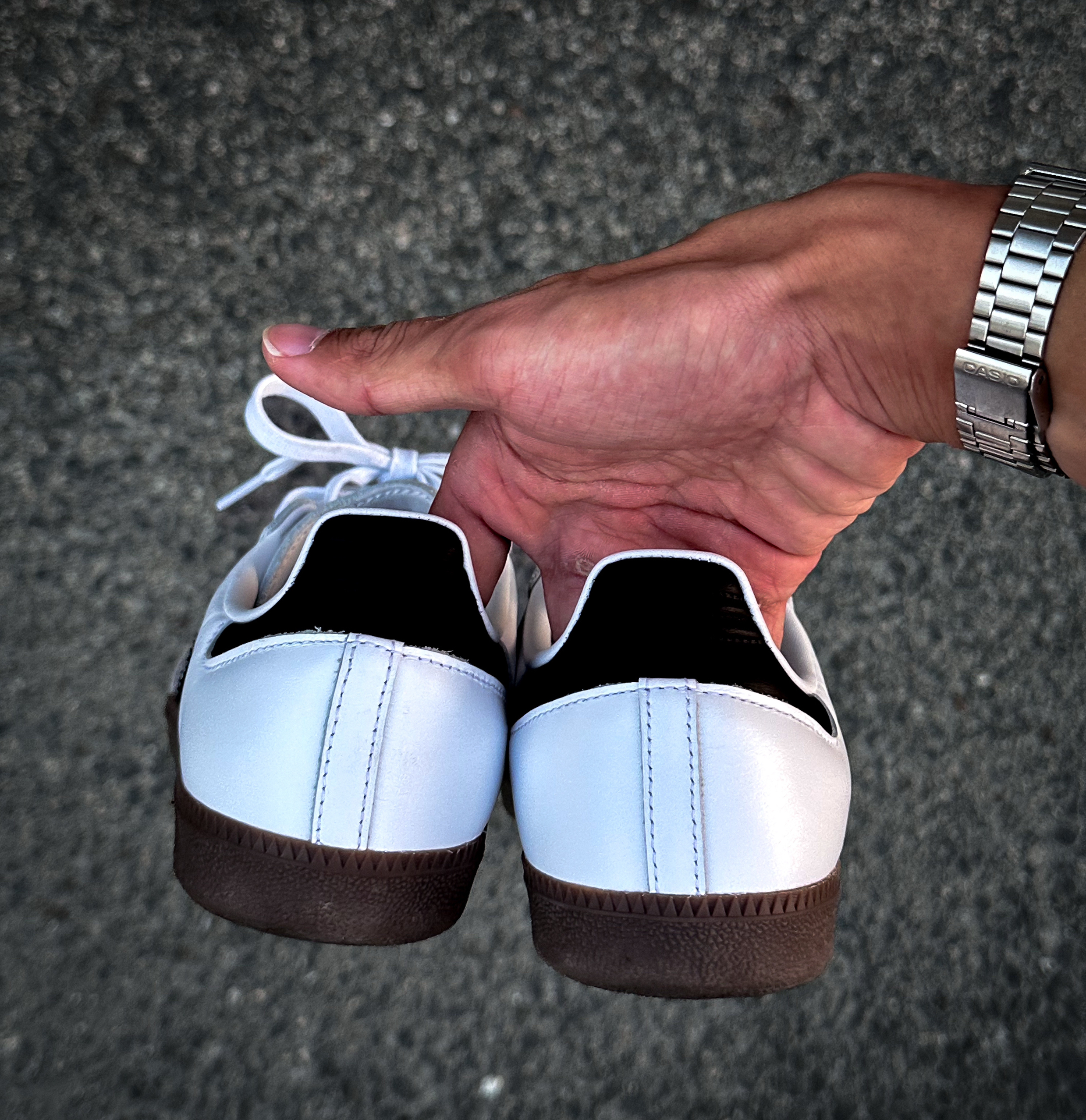 samba 外观采用了经典黑白色搭配,比较简洁 看着很干净 鞋面采用皮革材质 轻薄的鞋底 穿着的脚感略微偏硬 穿牛仔裤还是运动裤 也是hold的住的