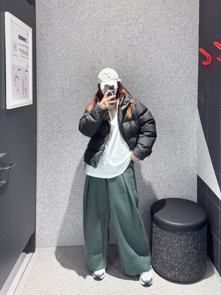 ❤️天气转凉啦~羽绒服必须得安排上🌬️ 内搭白色打底T 搭配合适羽绒外套 保暖又好看☑️ 下身搭配nike暗绿宽松休闲裤 👖 搭配起来上镜超好看 氛围感拿捏🤳🏻 (图源网络侵删)