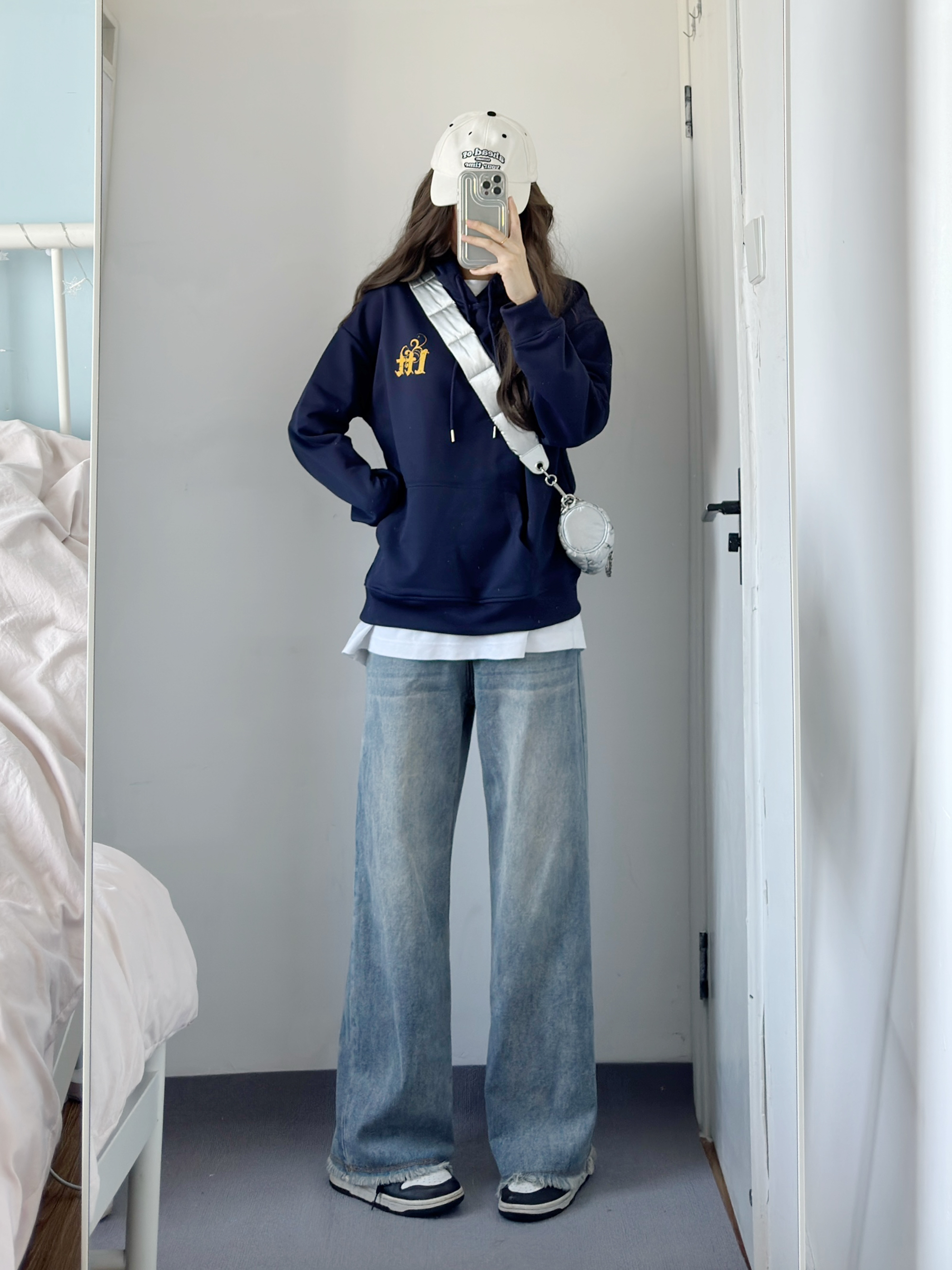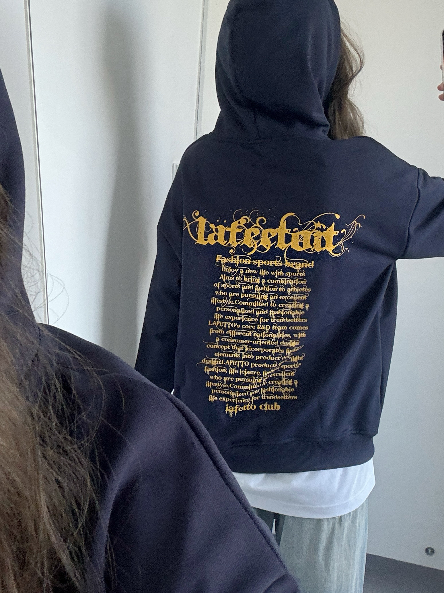 黄字母设计的藏青色卫衣好好看呀 好有活力好百搭!! 上身好显白好韩呀~ 日常搭配裙子裤子都好看