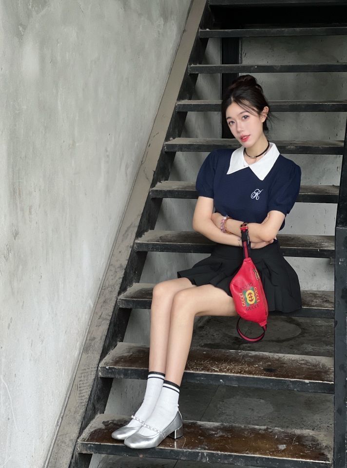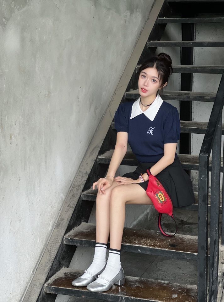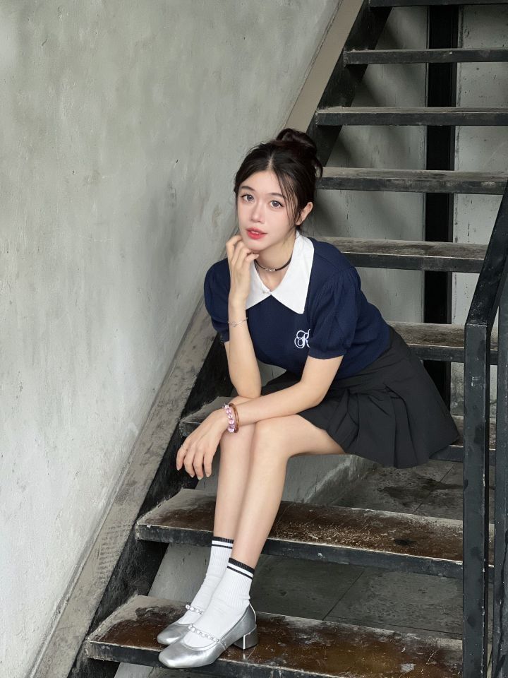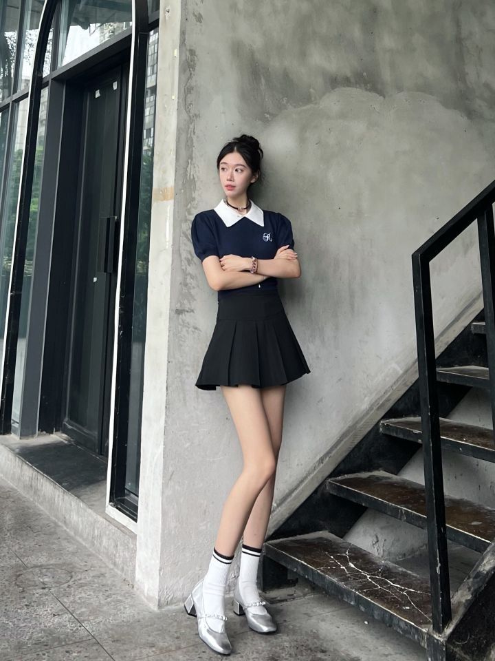 今天浅当一天女高中生 🏫 深蓝色的短款polo衫 上身真的很白显瘦 校供感get! 搭配了一双银色玛丽珍 好久没有这种校园感啦 🧳放学一起走叭~