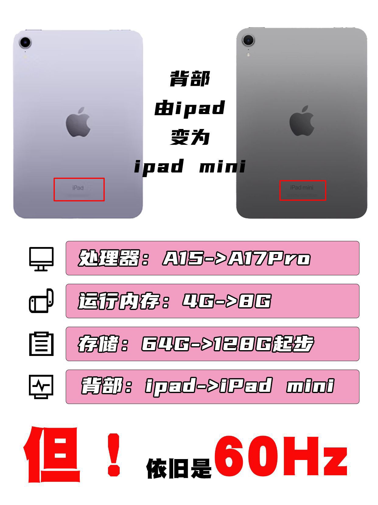 最近,iPad mini7偷偷上架苹果商城,话不多说我们直接看结论! 升级点: 处理器由A15——>A17Pro 运行内存由4G——>8G 起步存储由64G——>128G 支持苹果AI 缺点: 果冻效应依旧存在 屏幕仍然是60Hz 这个价格下性价比不高 外观部分几乎没有变化,背部刻字从ipad变为ipad mini 总结:如果你目前手持上一代ipad mini6的话,没有升级的必要,如果你...