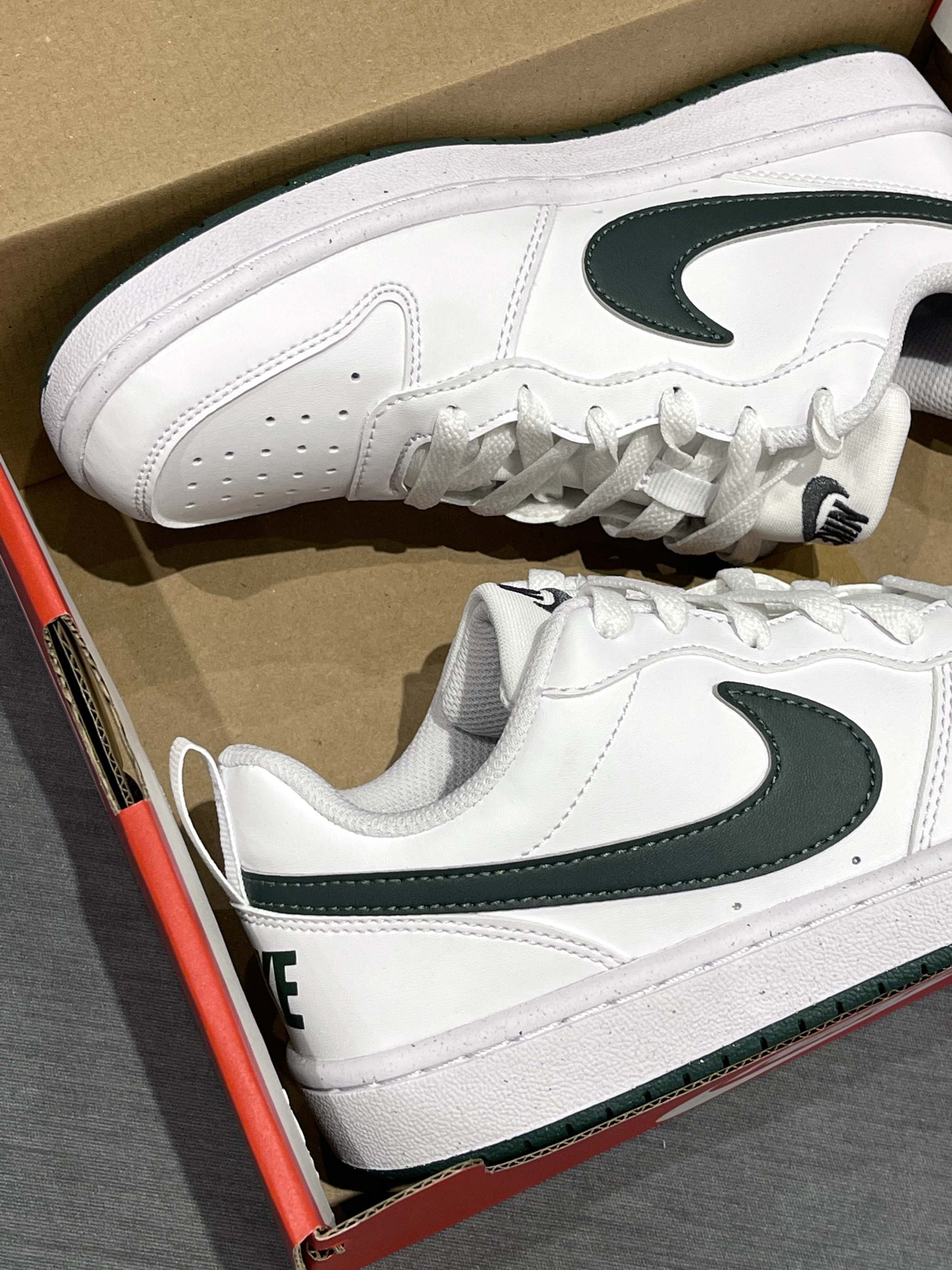 双十一期间买到什么宝藏球鞋了吗~🔥 Nike|Court Borough LOW低帮板鞋“白绿色”🍃,实物很轻便哦,空军一号的平替轻量版!大面积白色➕绿色Swoosh及后跟,整体清爽百搭~😎