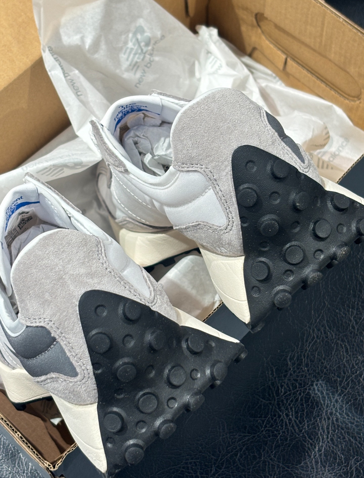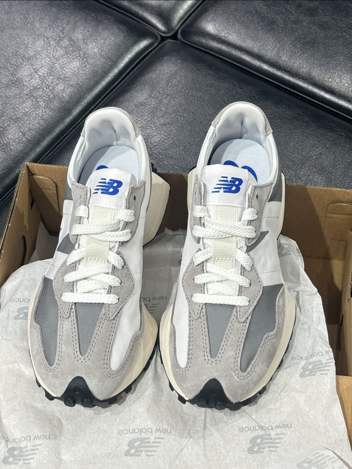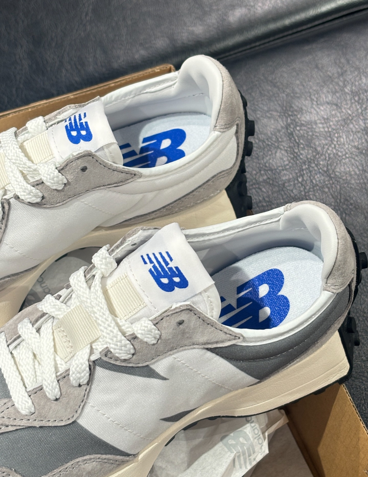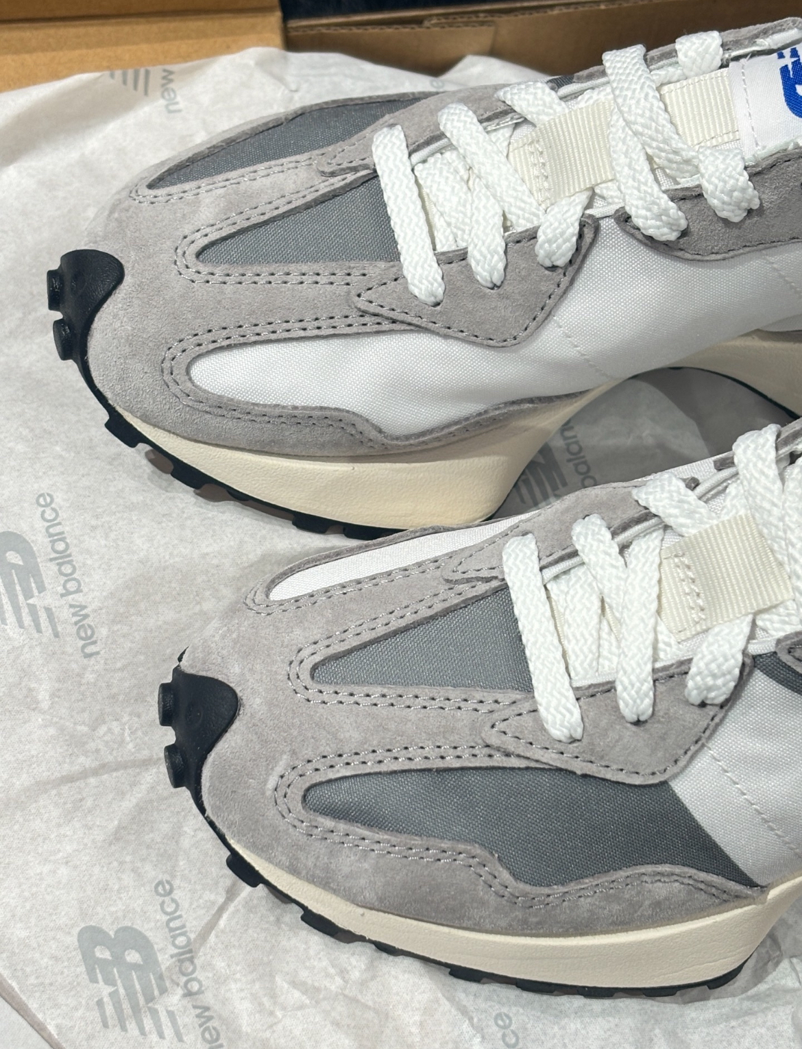 New Balance 327 鞋子整体是灰色和白色相搭配,经典复古外侧的“N”特别显眼,有种清新干净的感觉,细节感满满 我穿起来感觉脚感挺舒适的还有一点增高