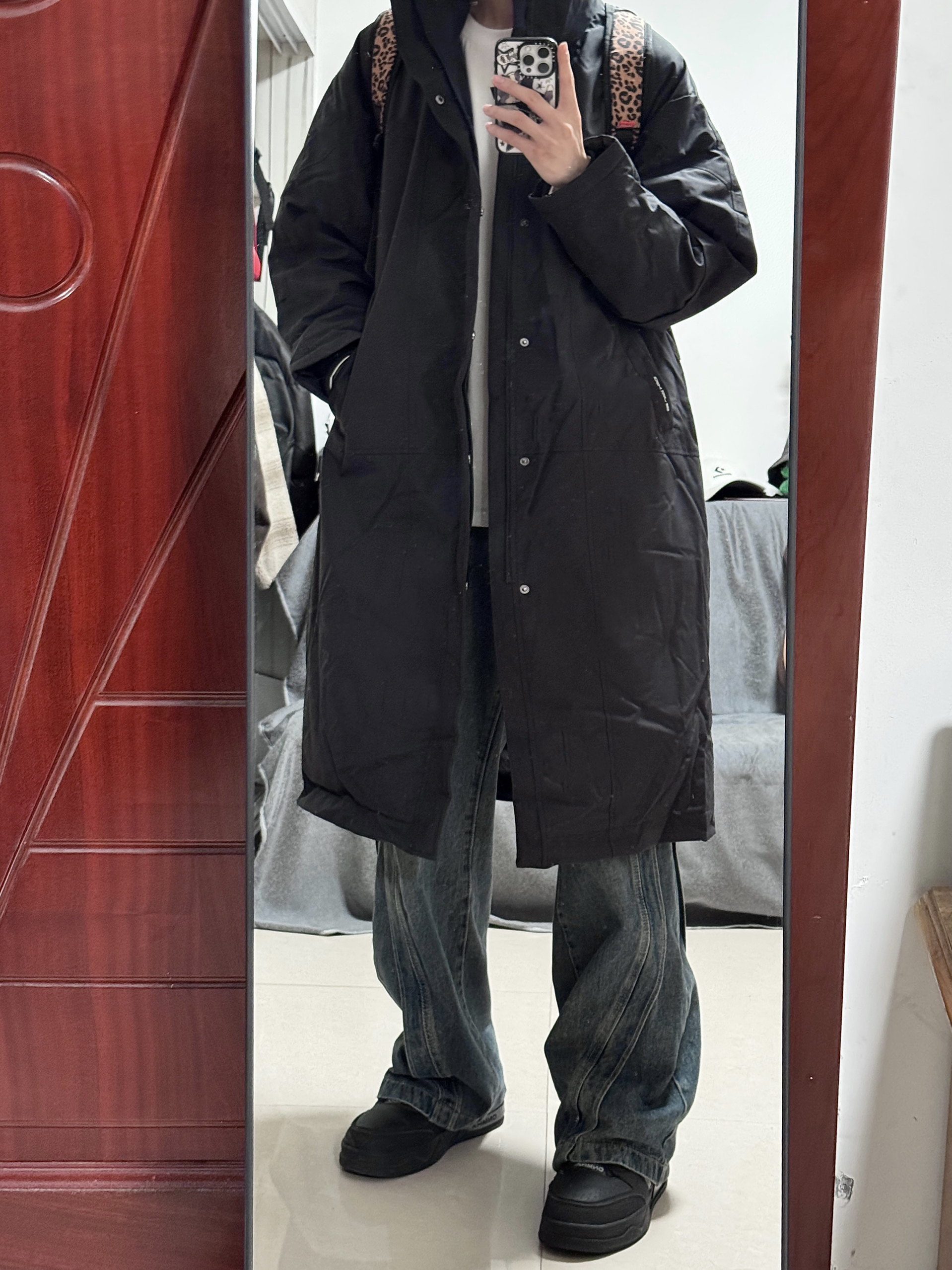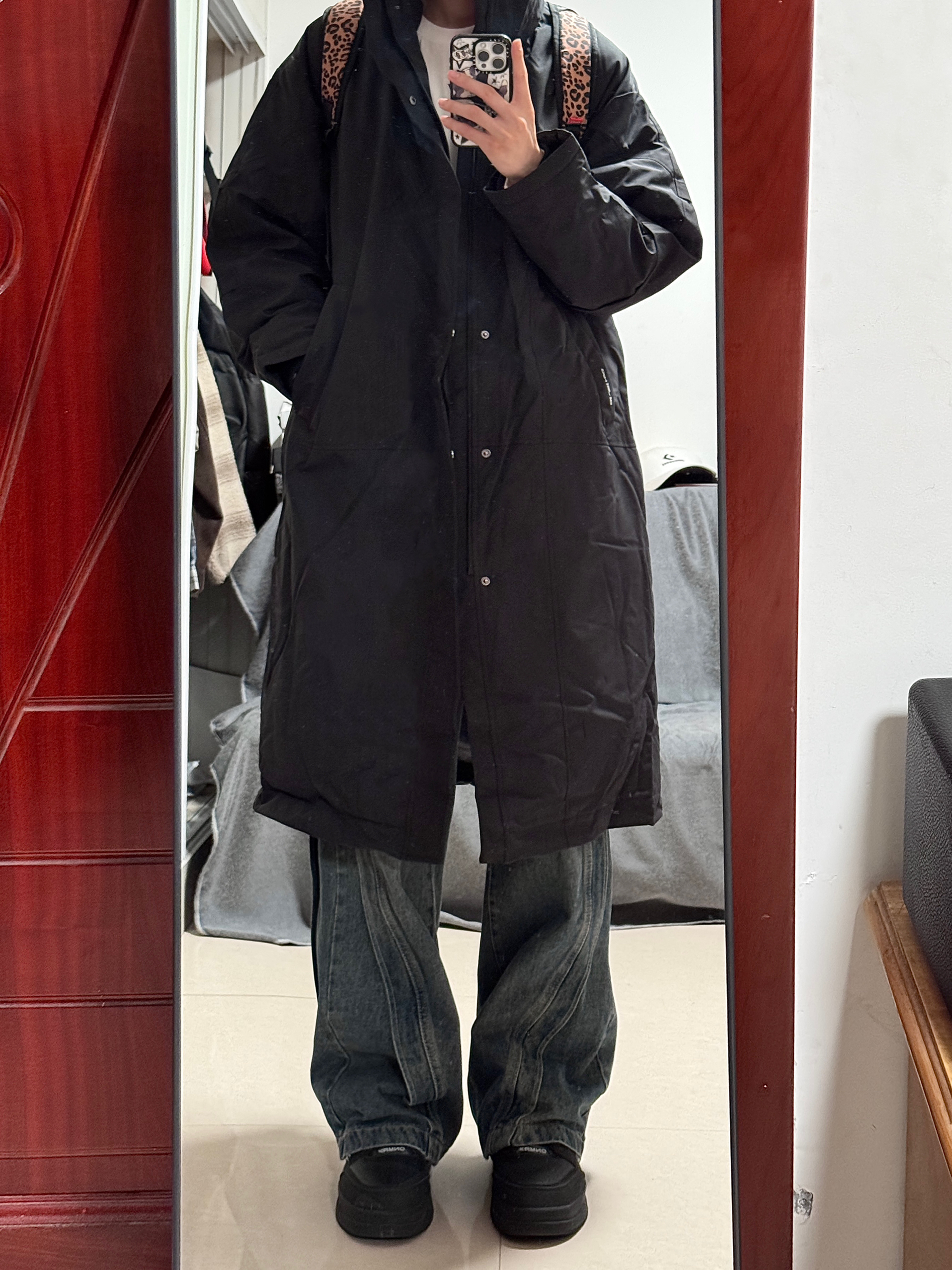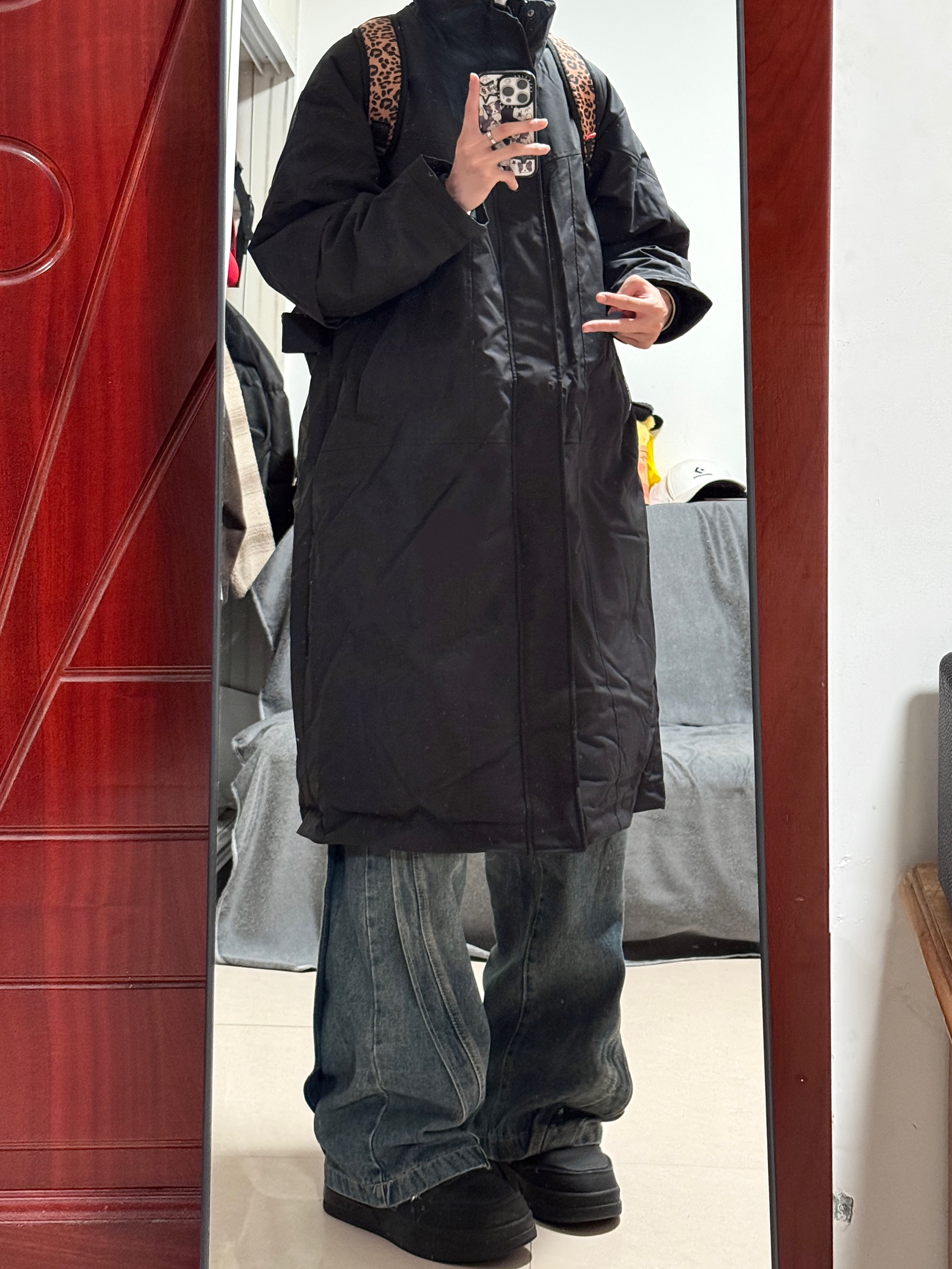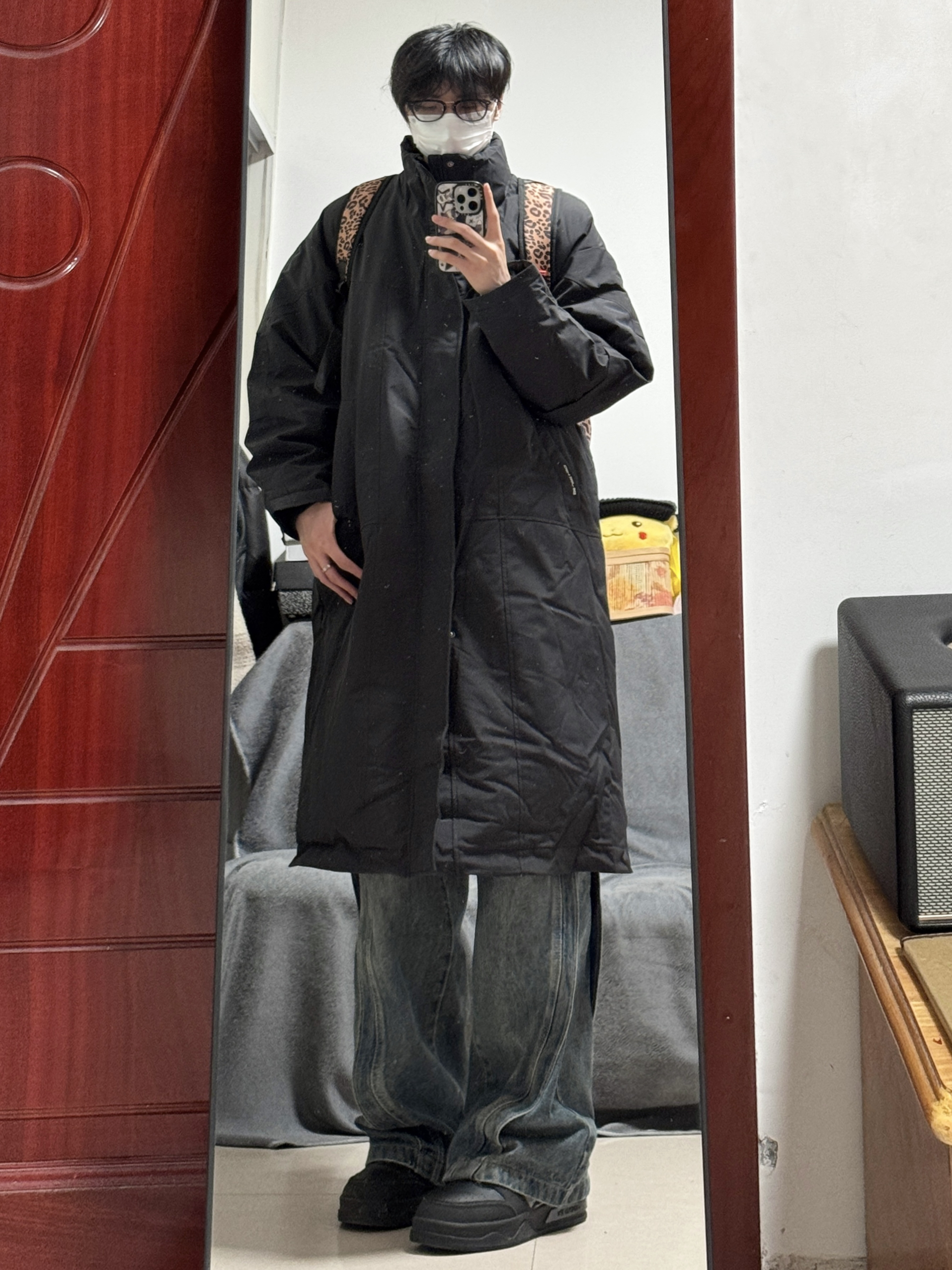 今身高|体重:188 130 🧍♂️ 穿搭风格:日系 👔 上衣:黑色大衣 👖 下装:条纹牛仔裤 👟 鞋子:板鞋 🎒配饰:保温书包