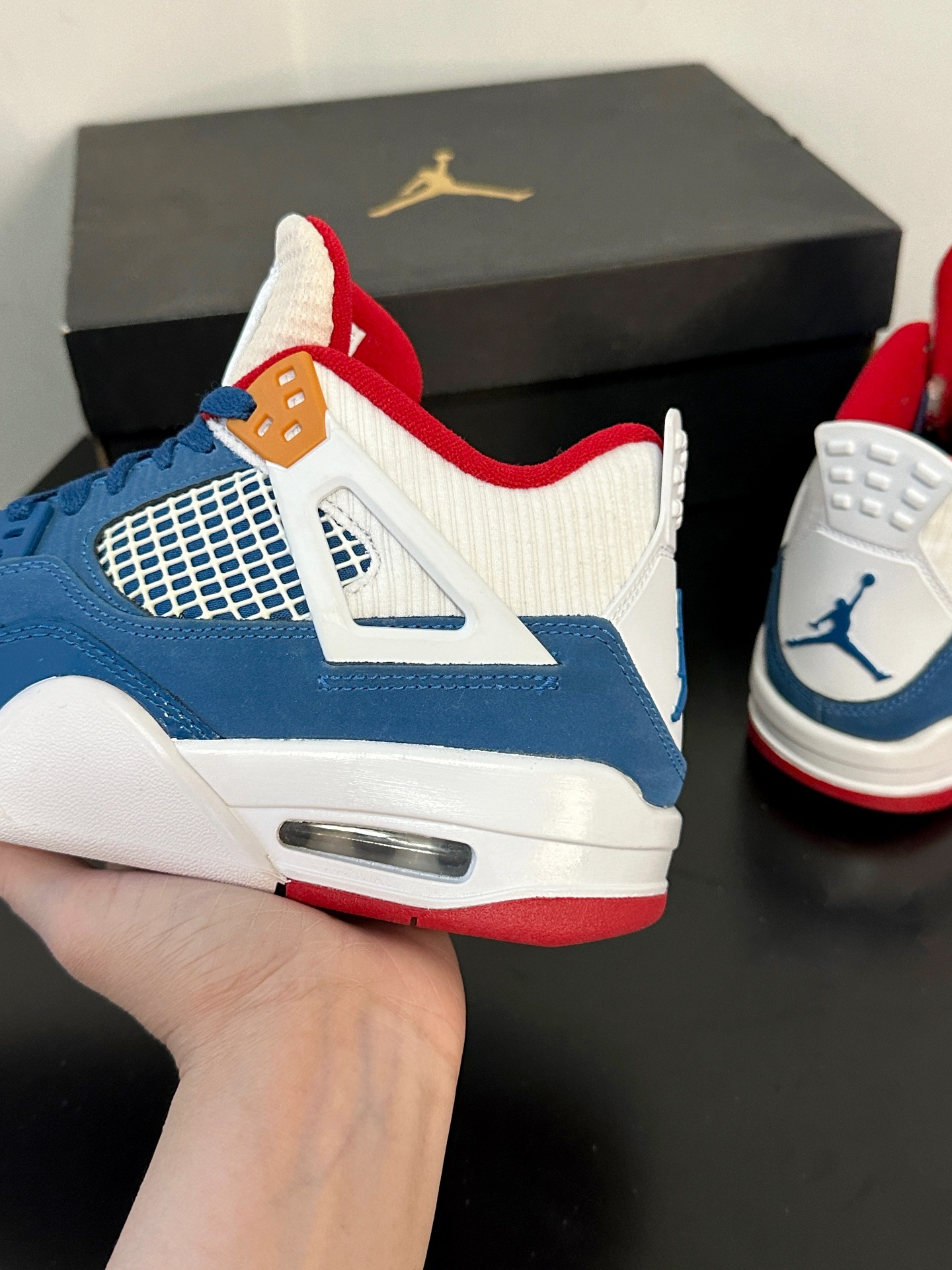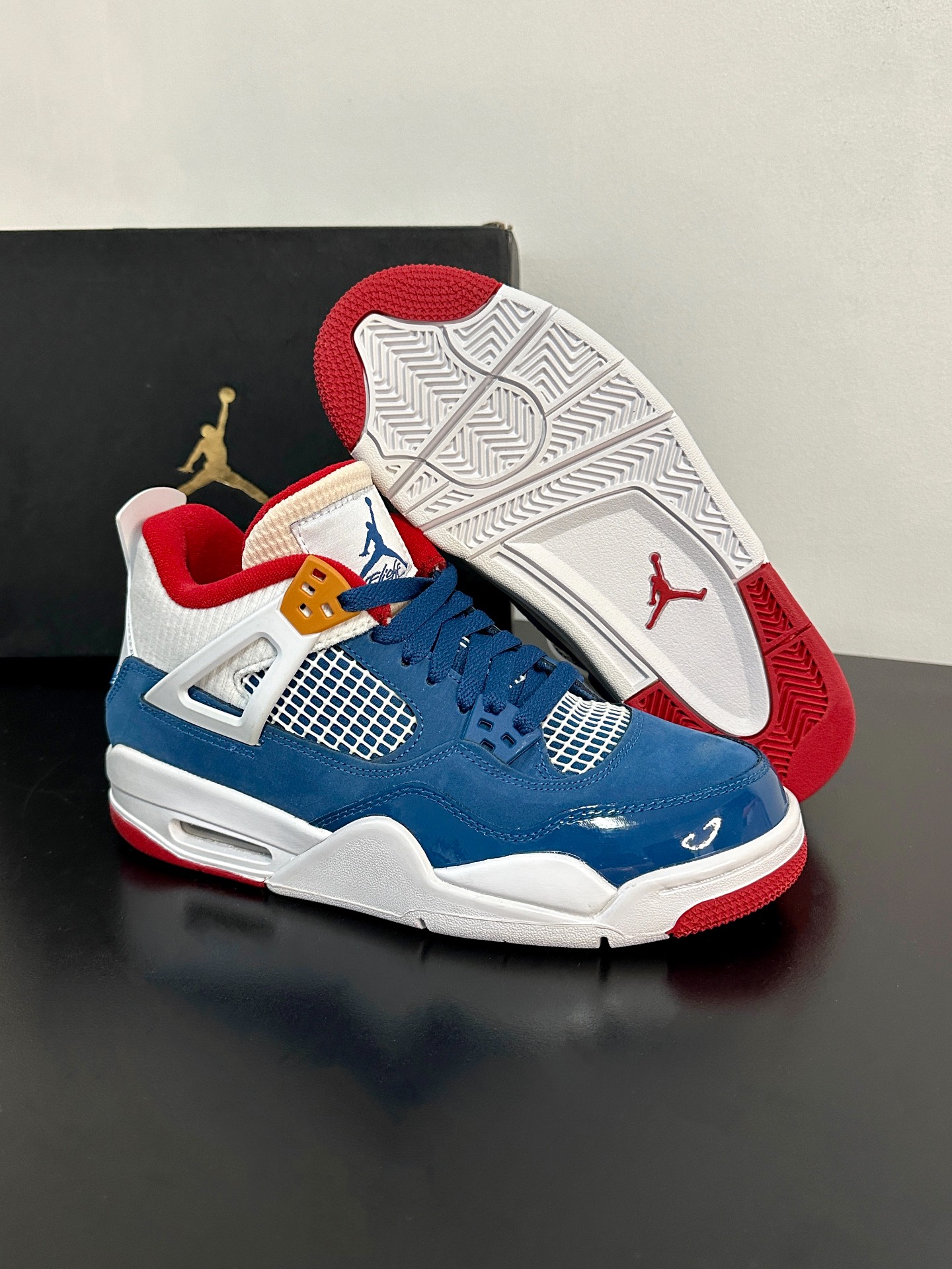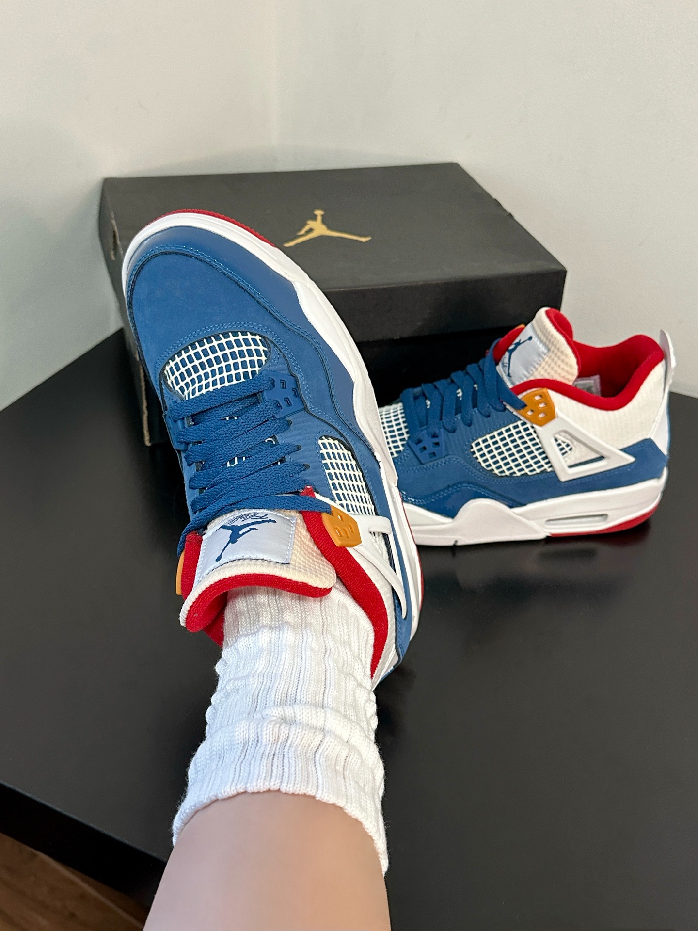 最近很喜欢的鞋就是这双AJ4了,量很小,颜值不错价格也低👌蓝红白搭配很清爽,经典复古配色 💙❤️🤍 漆皮材质拼接自带光泽✨✨✨小飞人logo还挺多,不想撞鞋的姐妹们看过来噢~ #最近很喜欢的鞋 #晒晒你的宝藏aj4 #超百搭复古板鞋 #分享宝藏神仙板鞋 #这双鞋我穿了很久