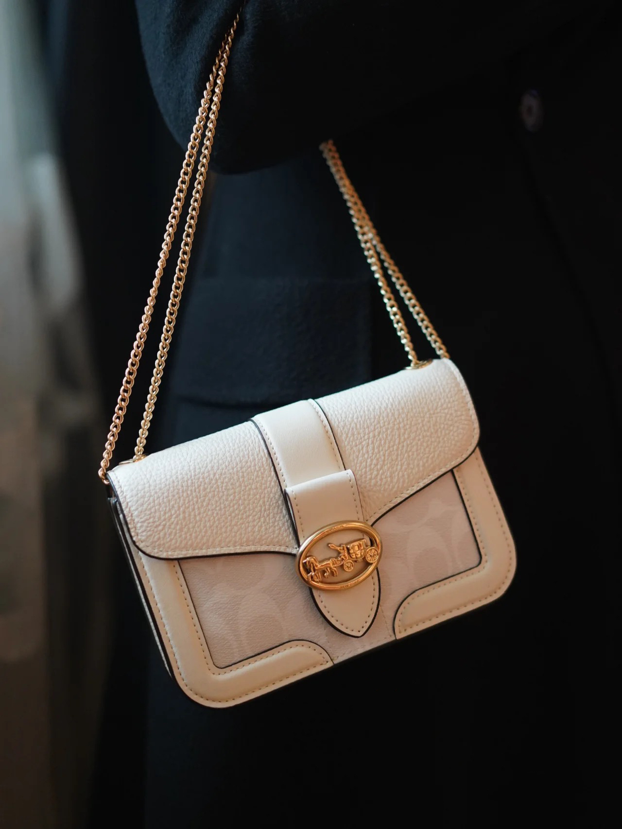 蔻驰Georgie冰川白链条包 经典白色老花 马车吸扣 精致的很呐🥰 看着不大 实则超能装 还能装可爱 哈哈哈 手机 钥匙 日用品 各种卡片都可以装下🤩 (Promax手机也可以装哦)🥰 上身效果超好看 可以双链条单肩腋下背 也可以拉长单链条斜挎背🤩
