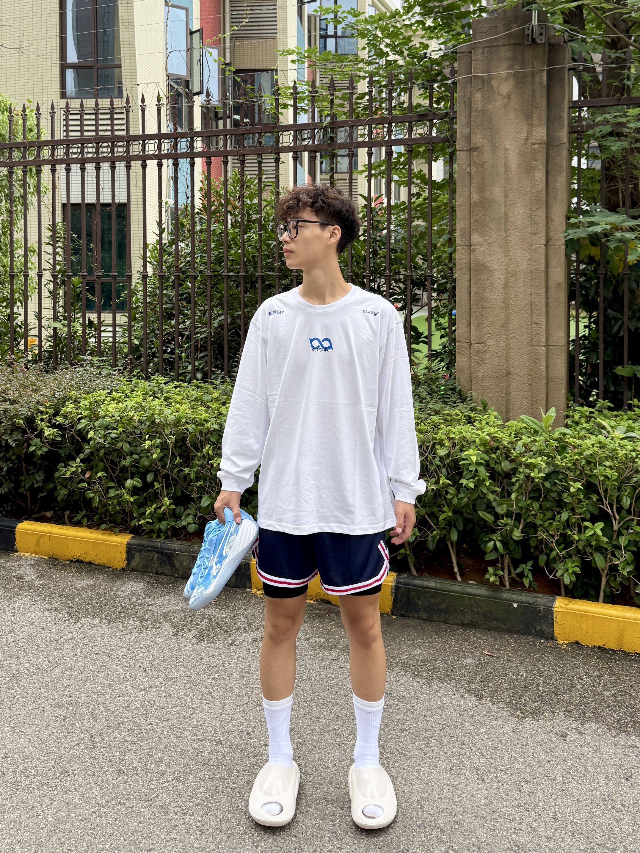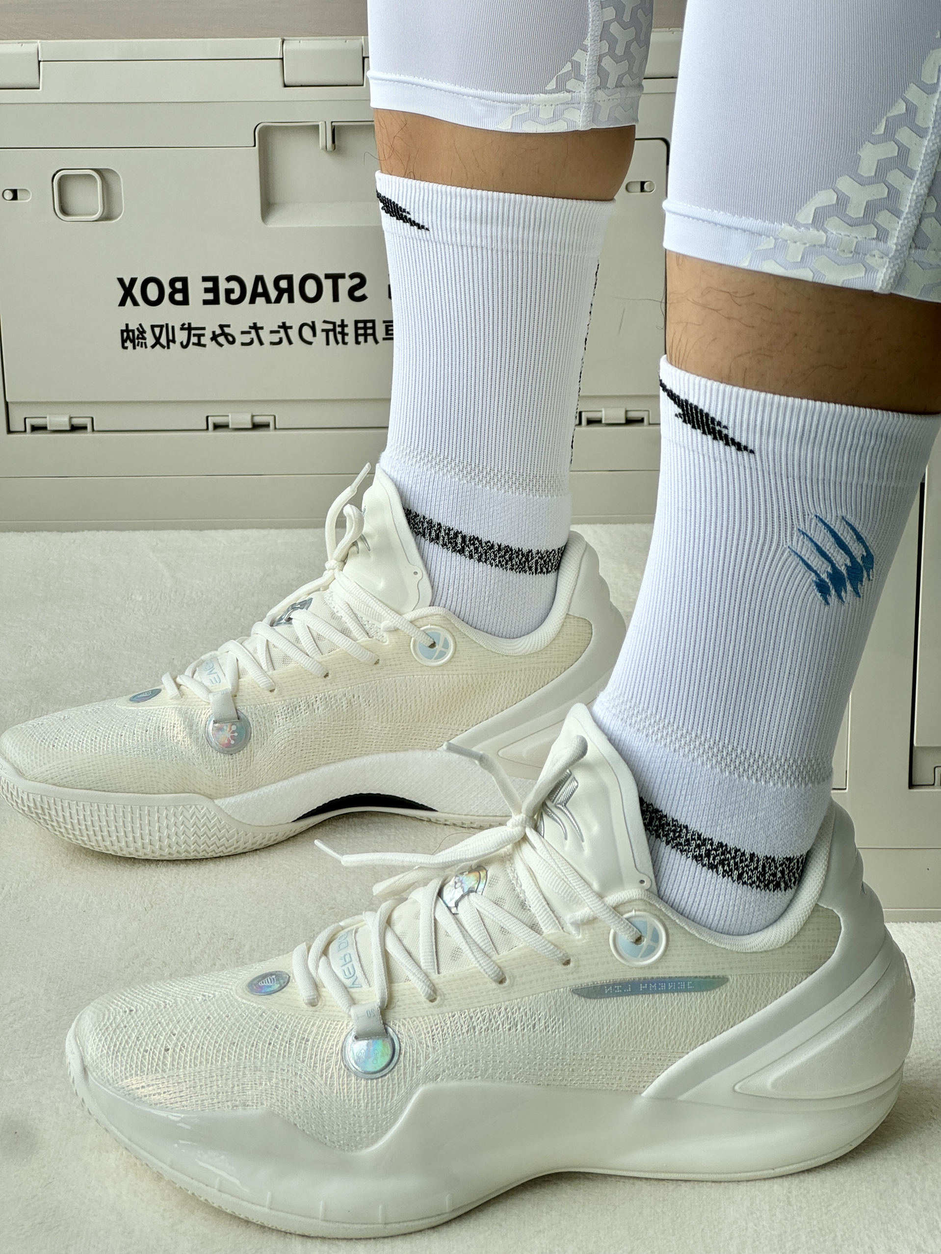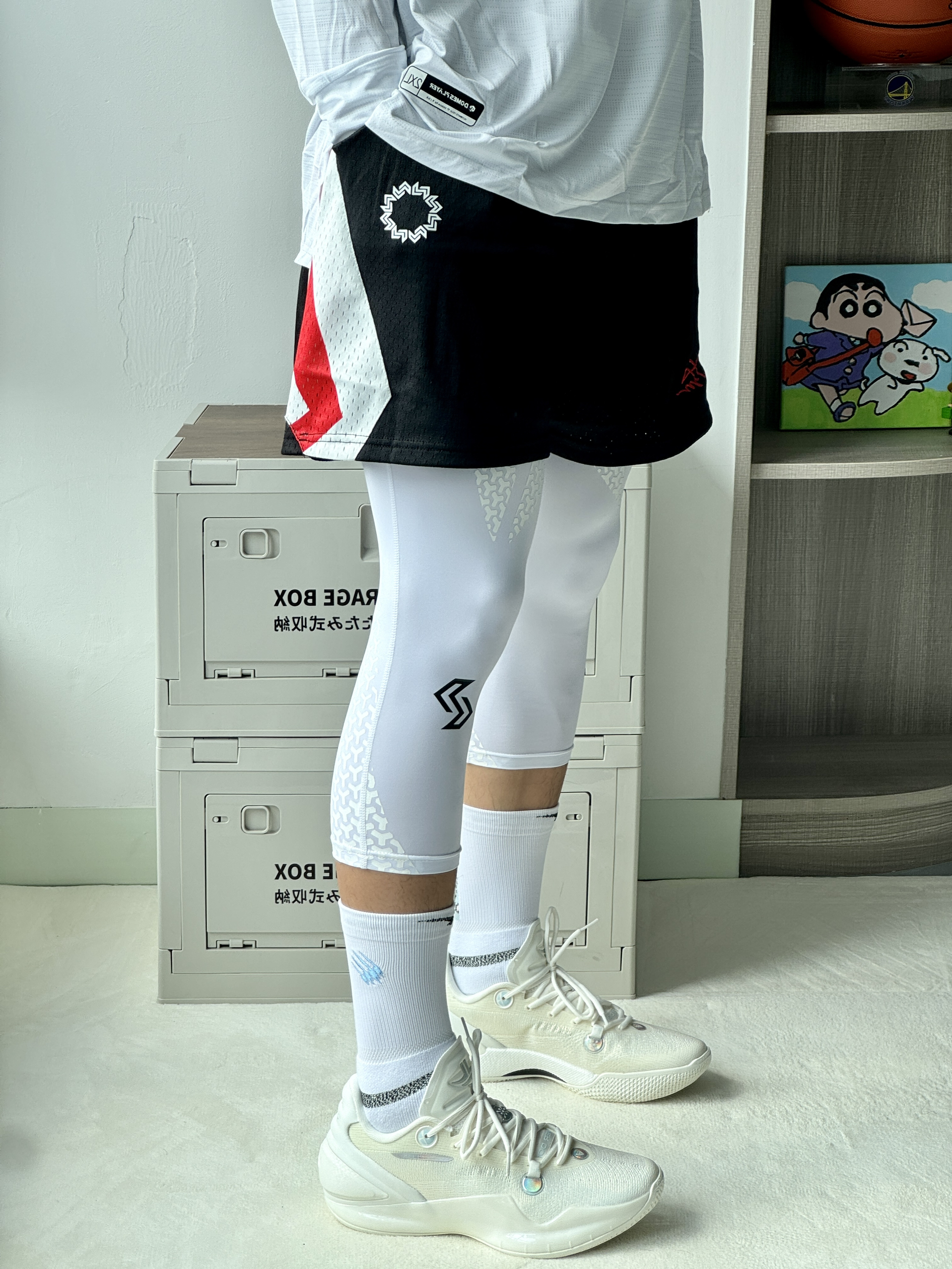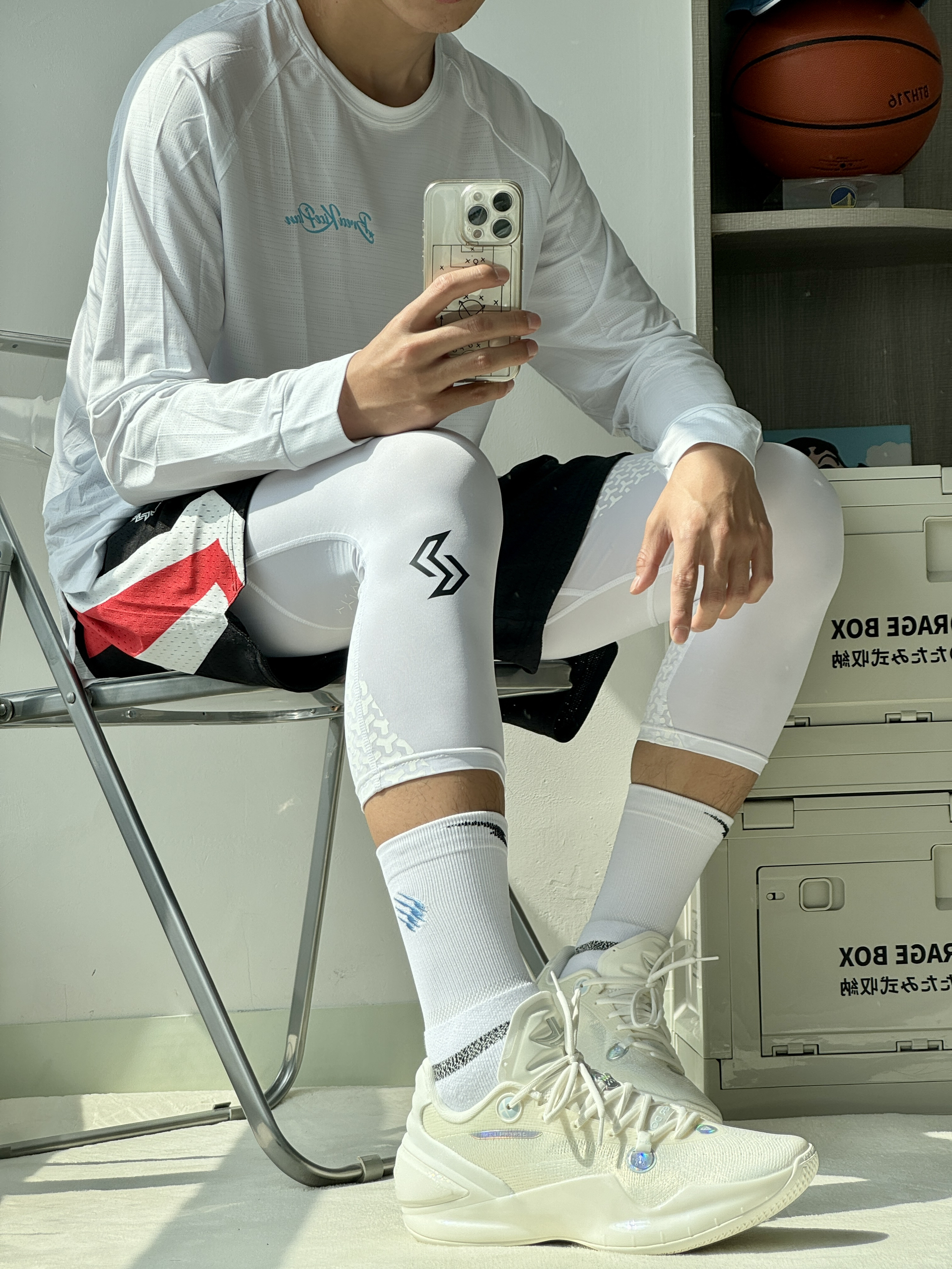 oi哈喽大家好这里是爱打球的小学生的故事又到了周末打球时间穿搭分享也来喽! 👔🩳 选择一件白蓝色速干投篮服简单好看舒适再搭配一条黑色短裤和白色紧身裤蛮百搭 👟 林书豪5自信配色整体设计很有速度感侧面tpu和纯白的鞋面上脚帅的很脚感也比较韧弹打球穿很可以