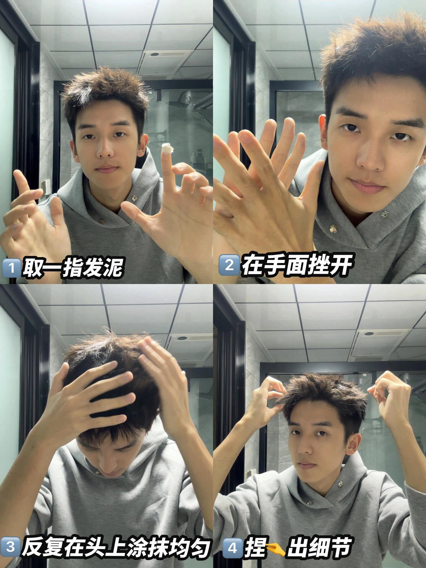 没有丑男人,只有懒男人! 想变帅其实很简单,差的只是一个合适的发型~ 今天给大家分享一些男生快速打理头发的技巧: 首先,用手指取一点发泥,在双手间揉搓均匀。 然后,将发泥轻轻涂抹到所有头发上,确保每一部分都覆盖到,涂抹完后,用手轻轻将头发往下压一压。 接下来,调整细节,可以将头发捏成一束一束的形状,打造立体感。 鬓角前面的头发也要轻轻往下捏一捏,最后整体调整一下。 最后,用定型喷雾(我这里用的是A...