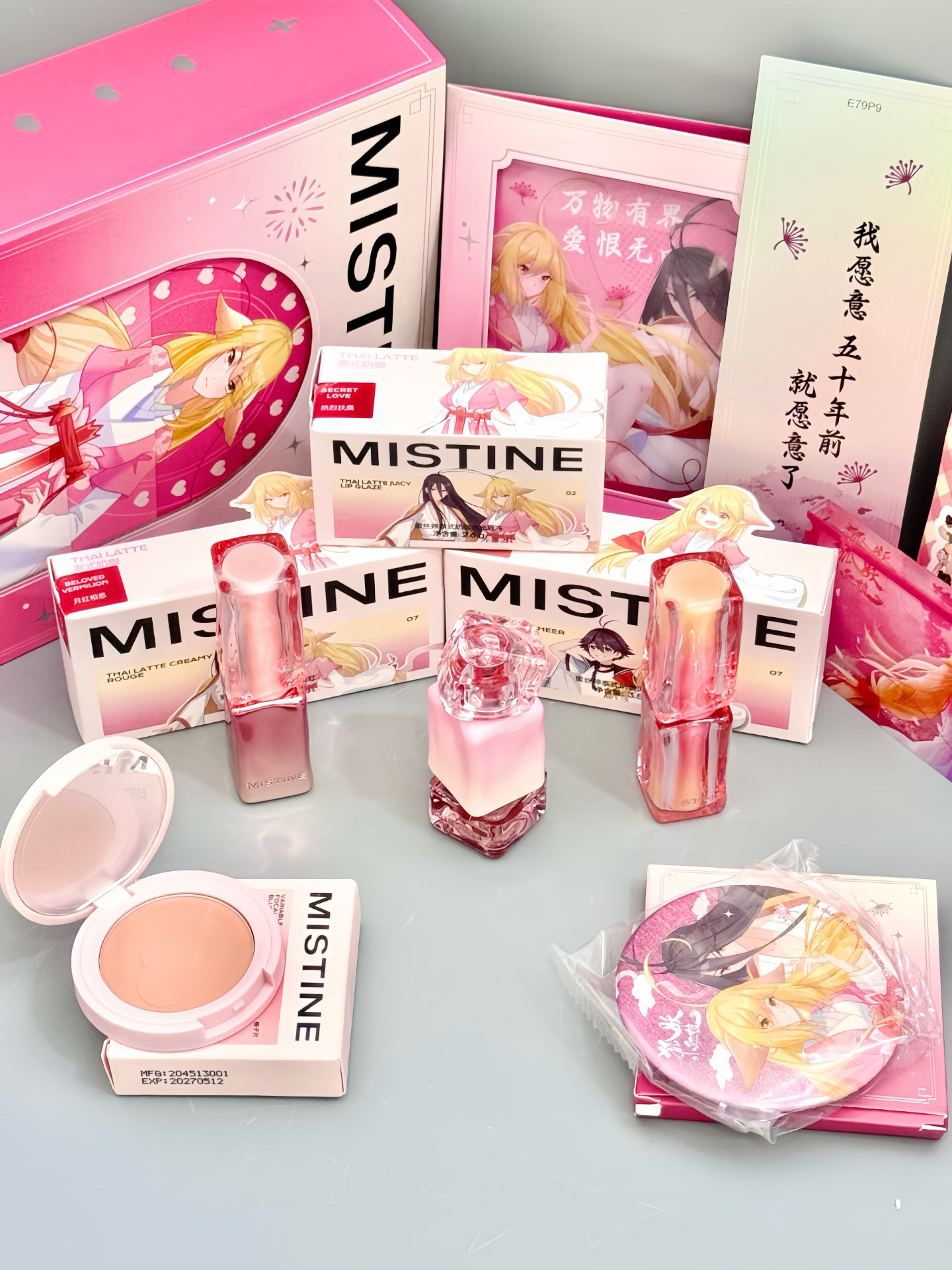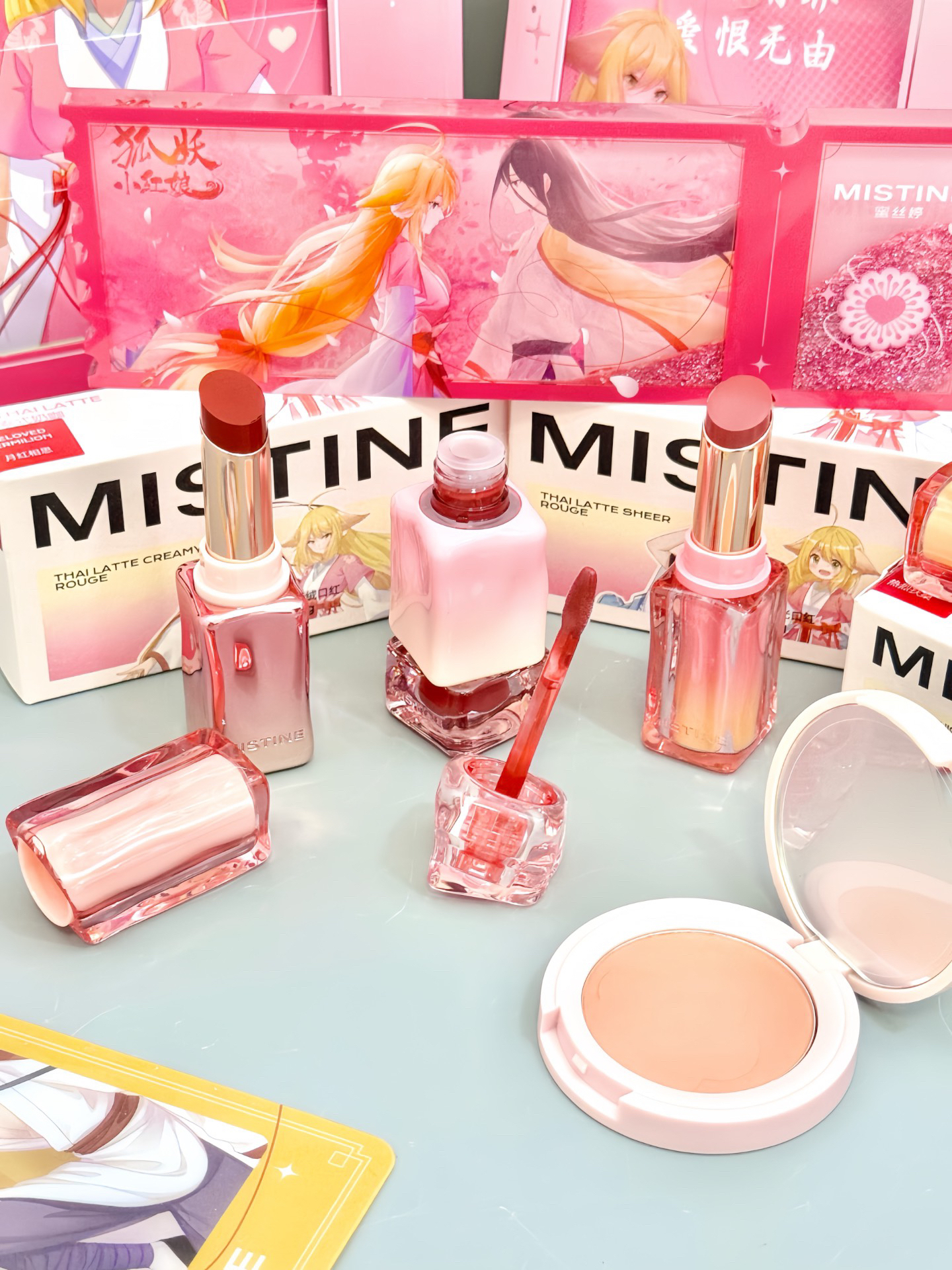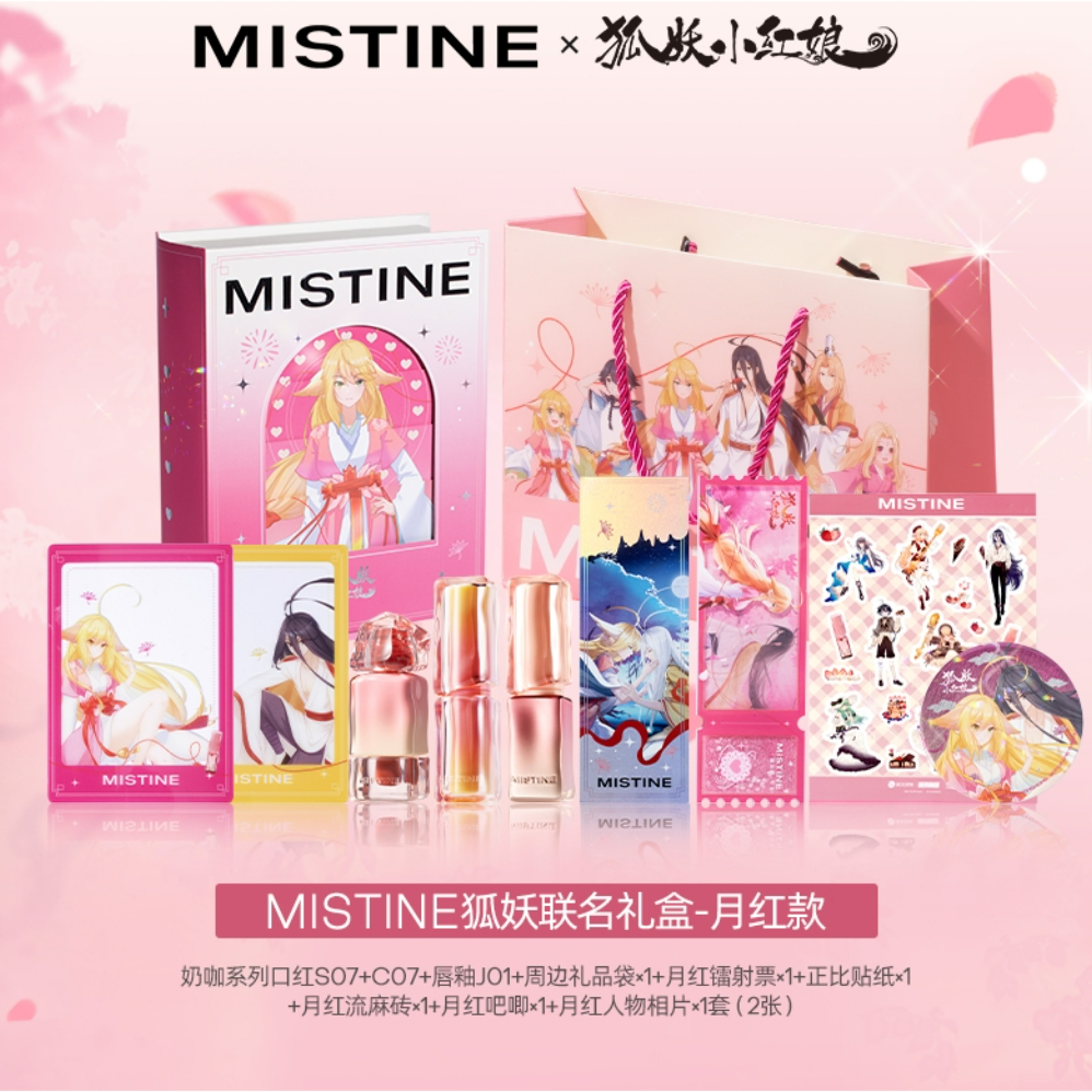 #mistine 你不要太会设计... 介个狐妖小红娘动漫联名彩妆礼盒尊的太美了吧 满满一大盒 里面是两支口红+一支唇釉+一块单色腮红 唇釉口红都是联名款,包装巨美 而且色号都蛮日常滴 还带了好多周边 女孩子尊的会被这种高颜值的礼盒迷住!