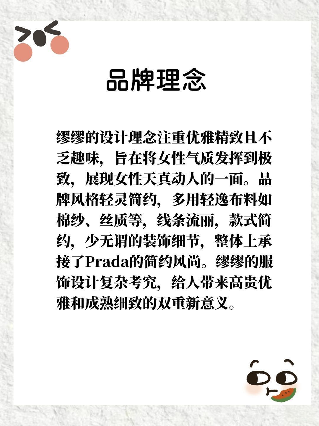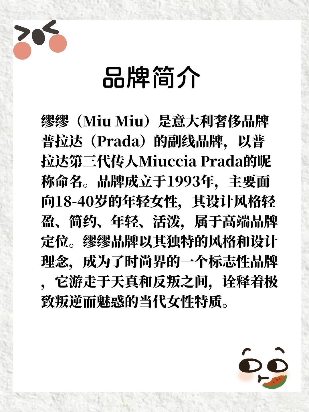缪缪(Miu Miu)是意大利奢侈品牌普拉达(Prada)的副线品牌,以普拉达第三代传人Miuccia Prada的昵称命名。品牌成立于1993年,主要面向18-40岁的年轻女性,其设计风格轻盈、简约、年轻、活泼,属于高端品牌定位。