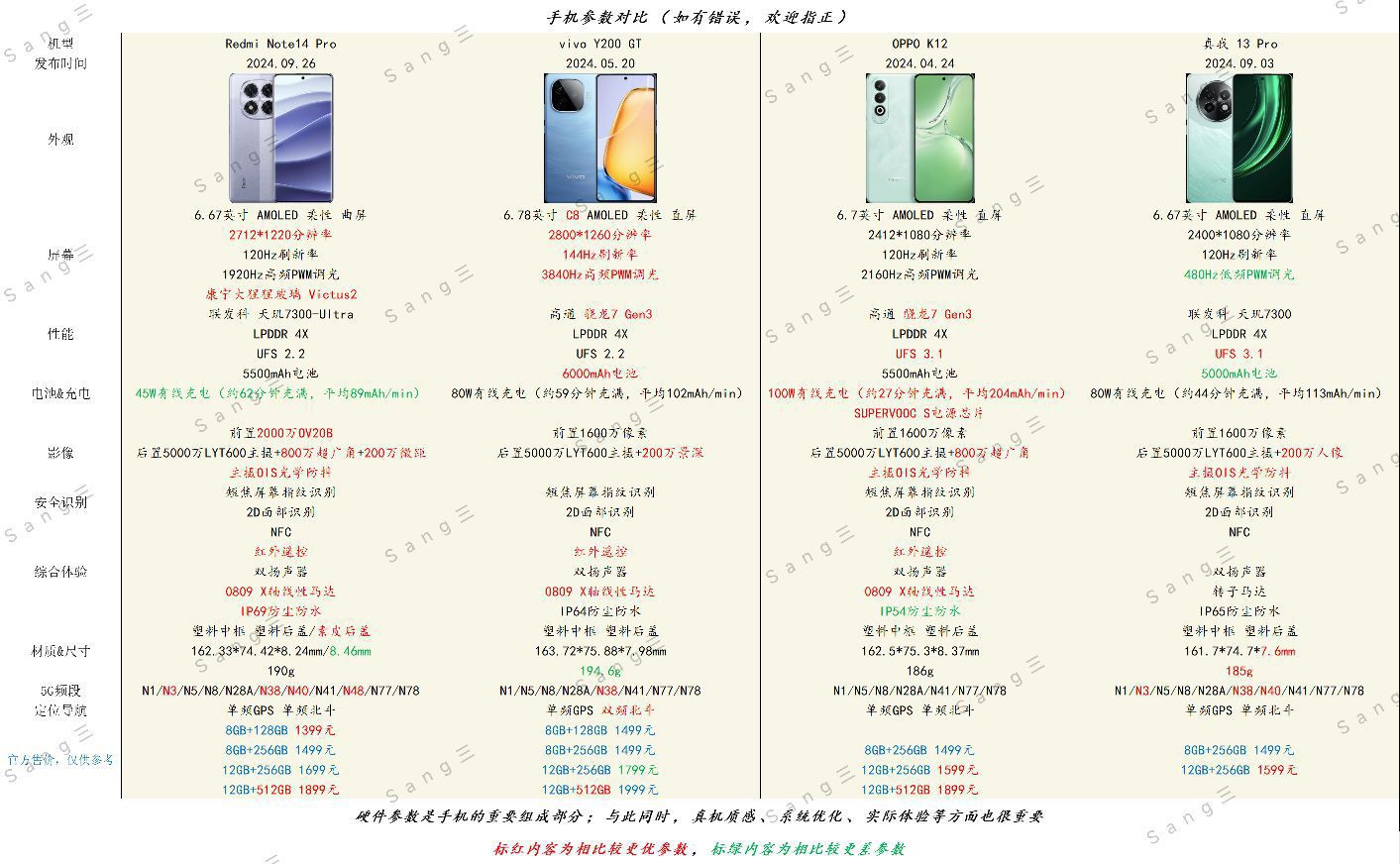 ☞#手机对比# ——Note14 Pro🆚Y200 GT🆚K12🆚13 Pro☜ 【Redmi #Note14# Pro】 优点(相比较而言): 更高的分辨率、更好的盖板材质、更好的前置相机、后置超广角及微距镜头、更高的防抖水平、红外遥控、线性马达、更高的防尘防水等级、更好的后盖材质、更多的5G频段、更大的储存版本、更低的官方售价…… 缺点(相比较而言): 更慢的充电速度、更厚的机身厚度…… ...