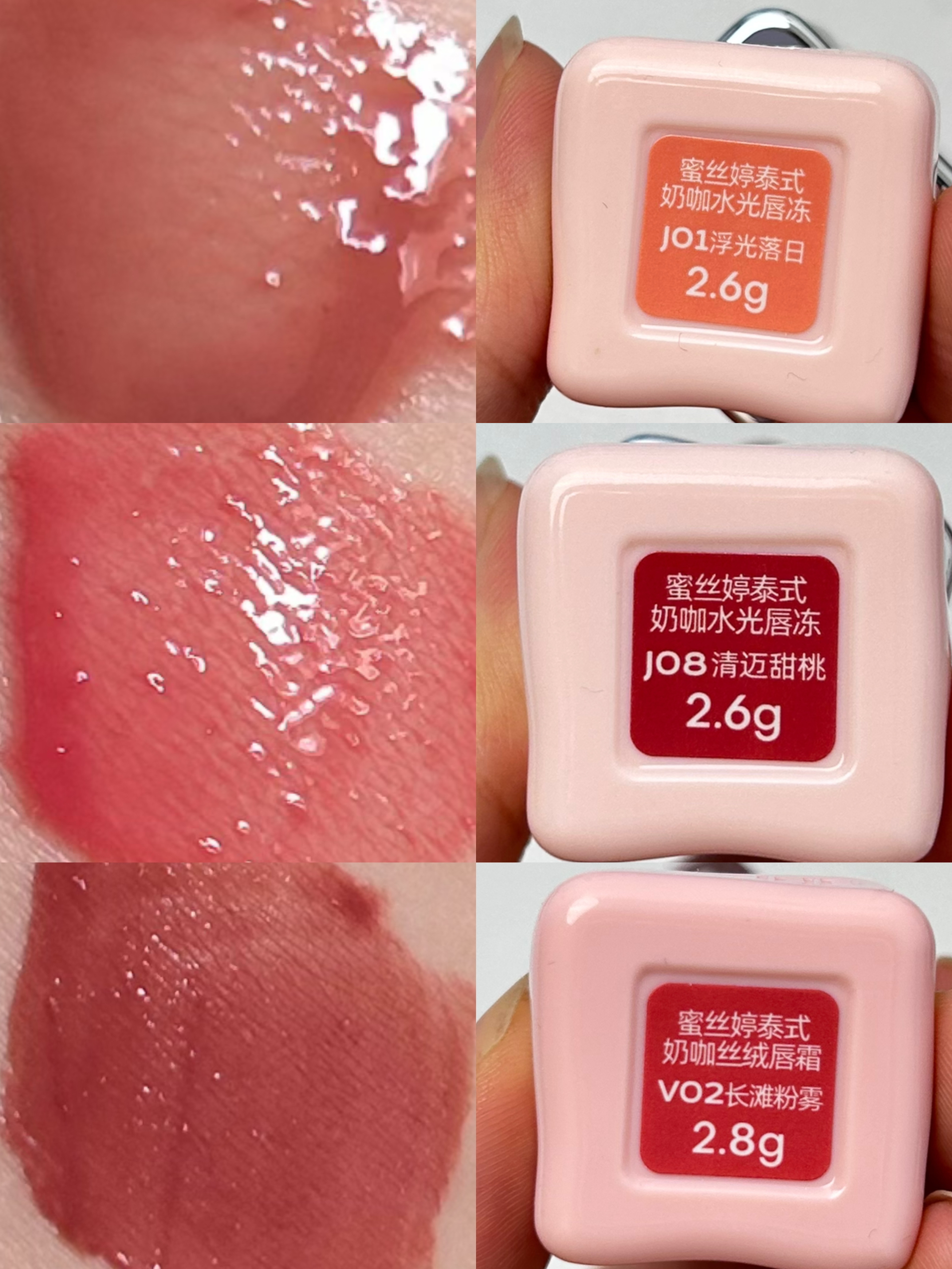 本篇笔记关联了【情人节限定】Mistine/蜜丝婷 泰式奶咖唇冻 丝绒镜面玻璃唇 2.6g 【唇冻】J01浮光落日、【情人节限定】Mistine/蜜丝婷 泰式奶咖唇冻 丝绒镜面玻璃唇 2.6g 【唇冻】J08清迈甜桃、【情人节限定】Mistine/蜜丝婷 泰式奶咖唇冻 丝绒镜面玻璃唇 2.6g 【唇霜】V02长滩粉雾等商品,为用户提供真实的使用体验和购买参考。