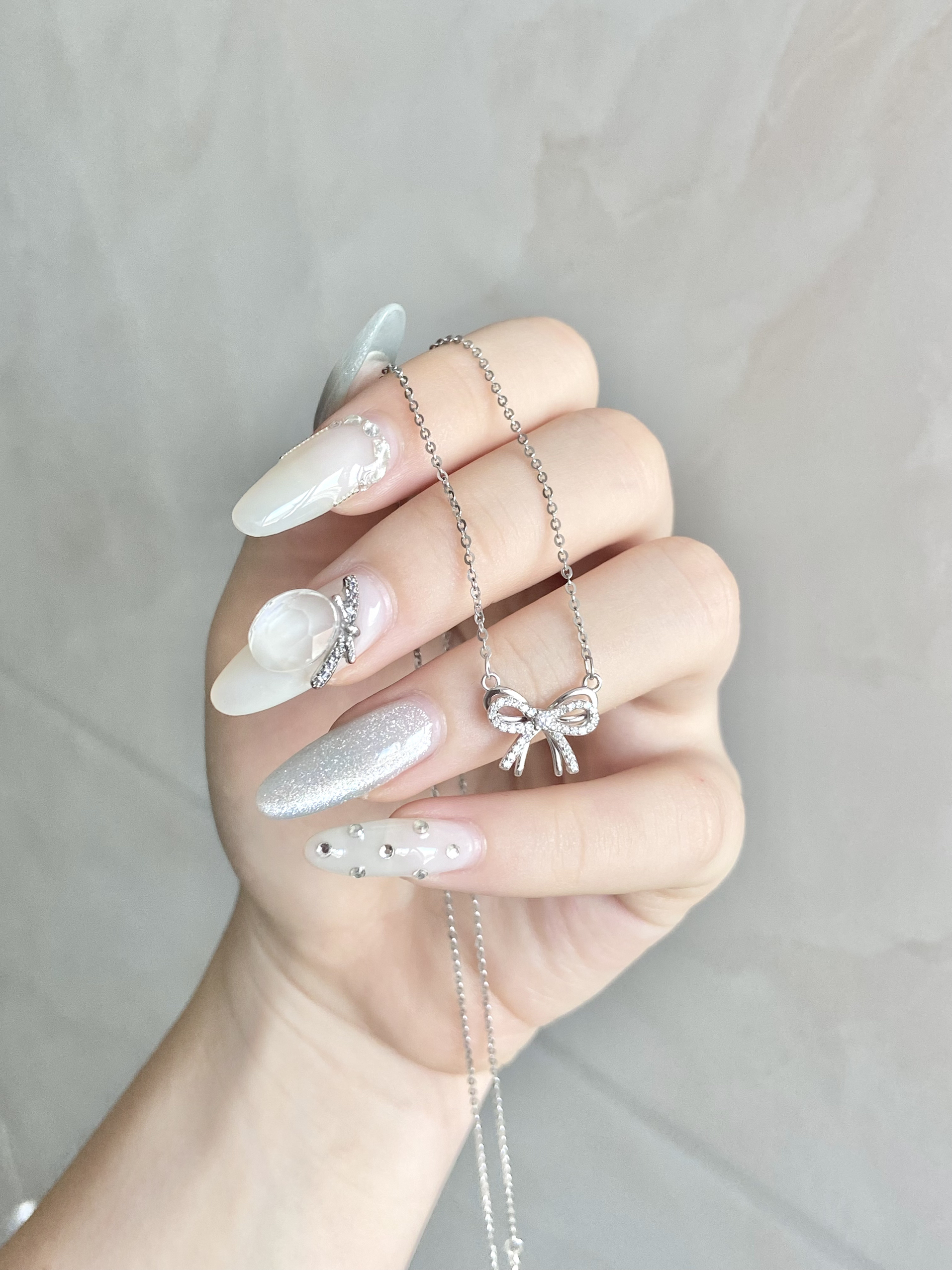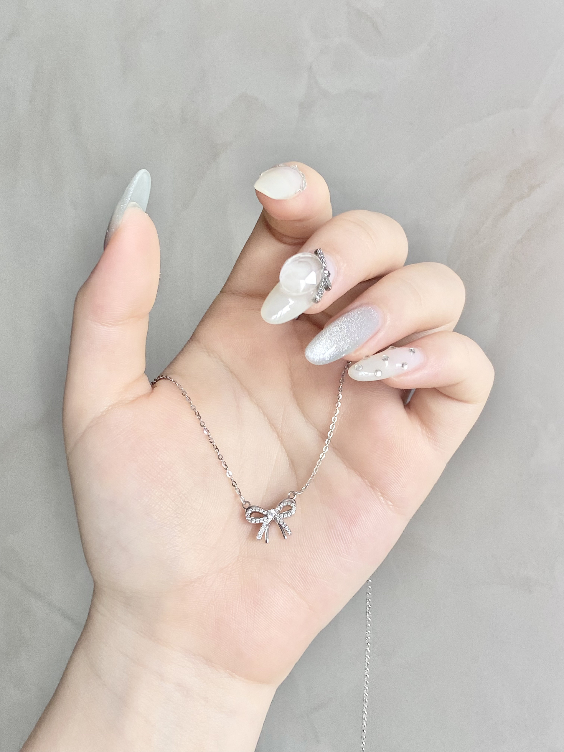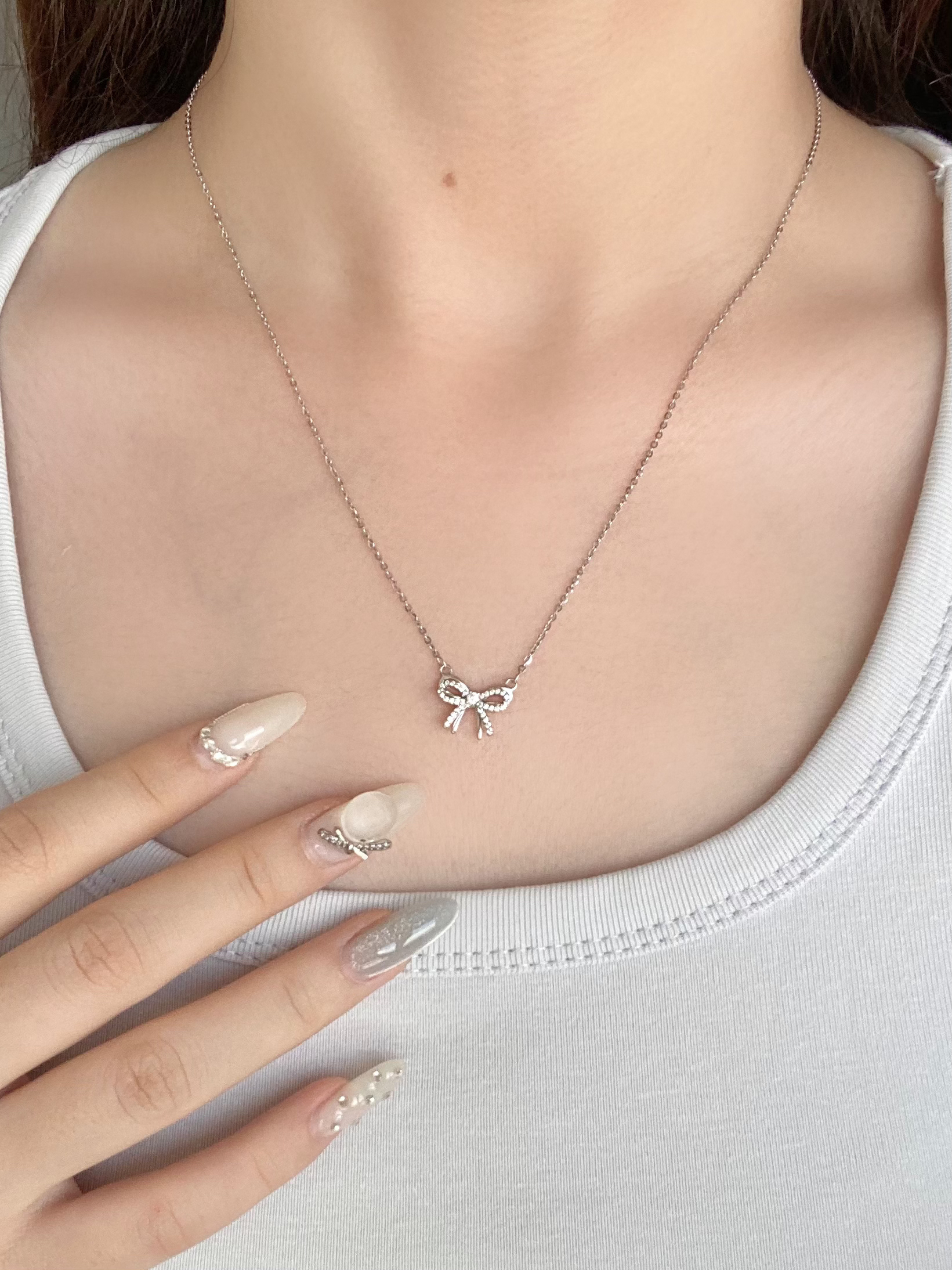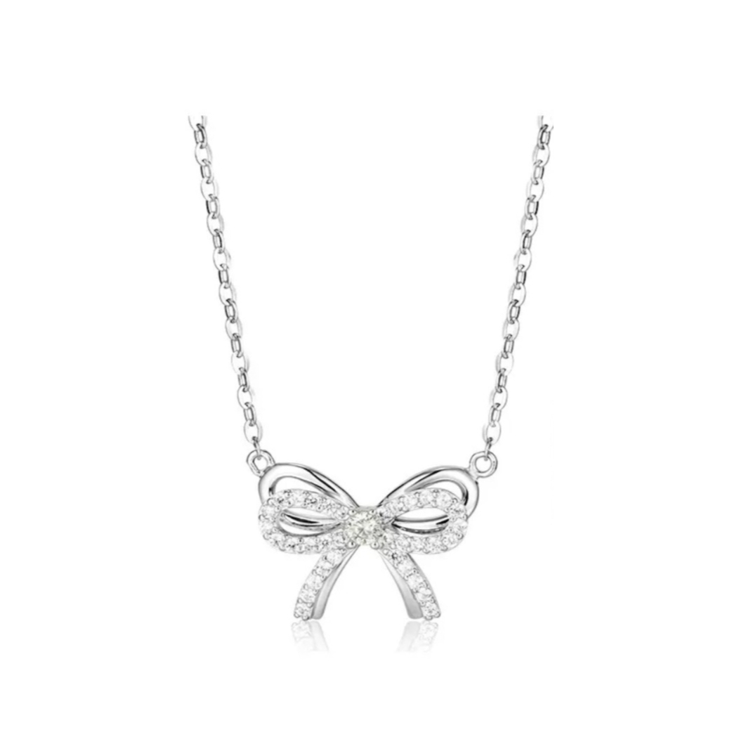 双层蝴蝶结的设计好有立体感 上面的蝴蝶结镶满钻 精致小巧~ 太少女心了!! 什么衣服都能搭 还很耐看! 进入秋天了 戴上这条氛围感不就来了~ s925银材质 不用担心过敏