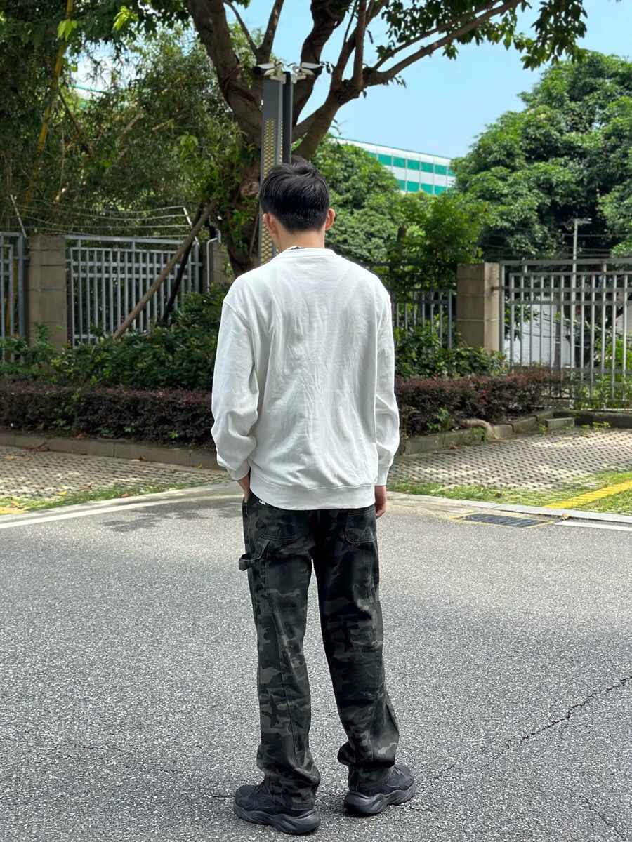 基础款圆领卫衣配迷彩裤,妥妥的美式复古味儿!!最近真的很爱这件迷彩裤,跟平平无奇的单品搭配都可以很出彩,贼帅