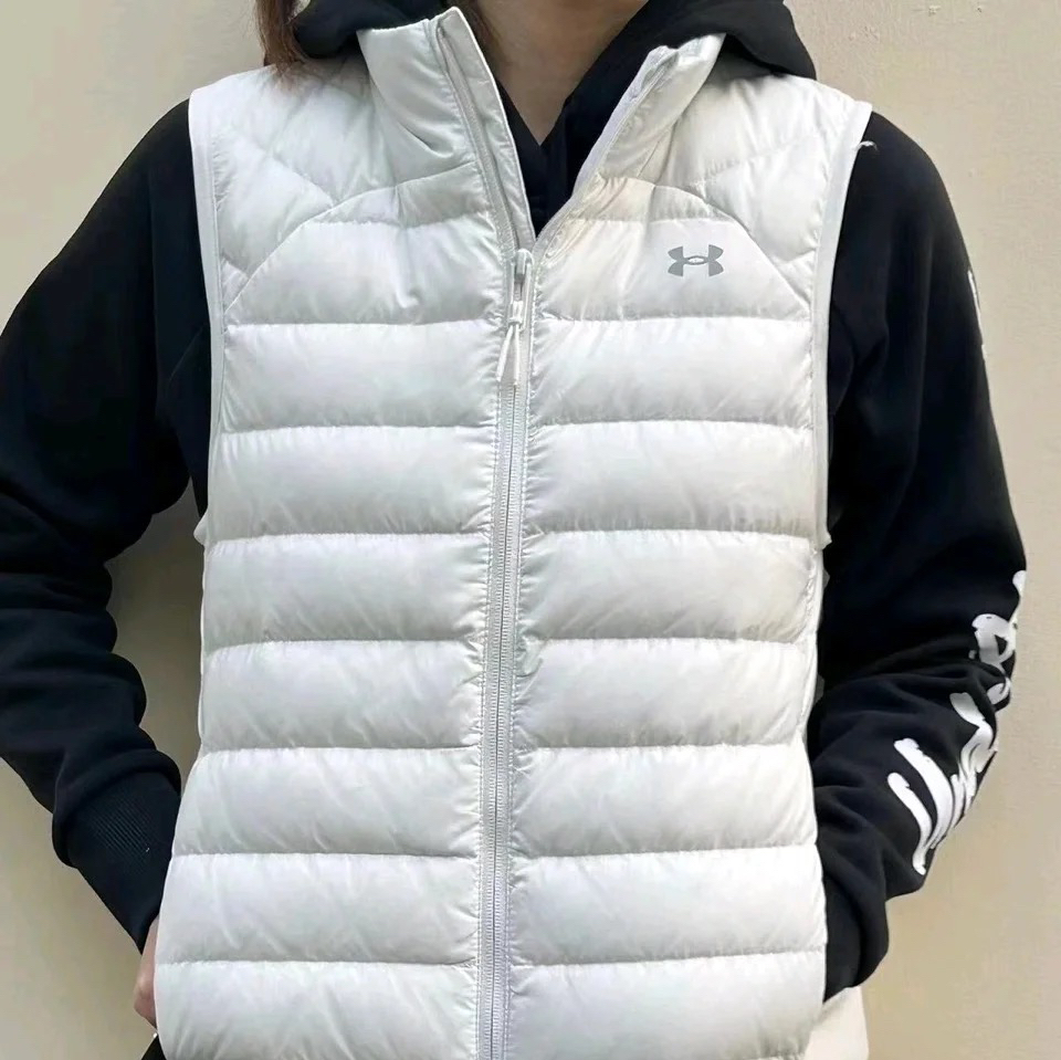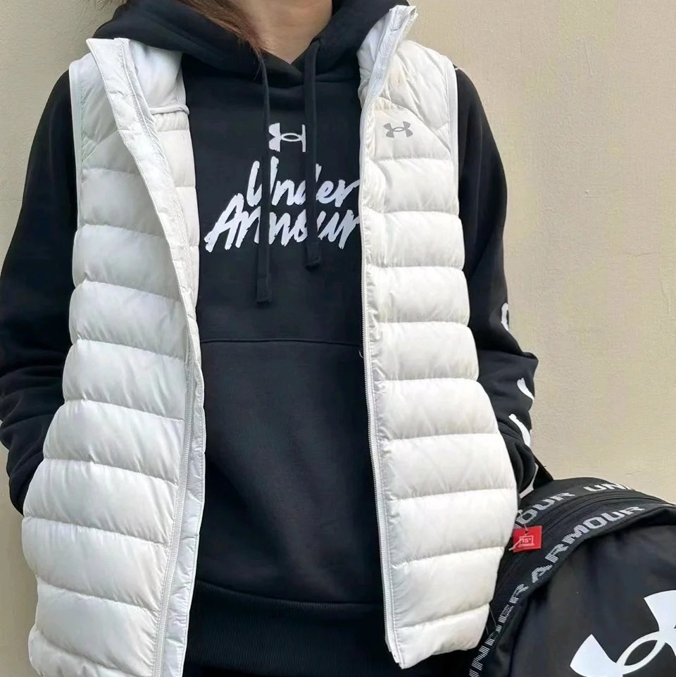 羽绒马甲我觉得是秋冬季最好穿的单品了,一年穿三季不要太实用了‼️ 既能应付变天骤冷的气候,又不会因为上身显得臃肿! 奶油白色的马甲特别百搭~ 🫥里面搭配一件卫衣就可以出街了,既保暖又减龄~ 图片来源于@Under Armour 天津燕莎