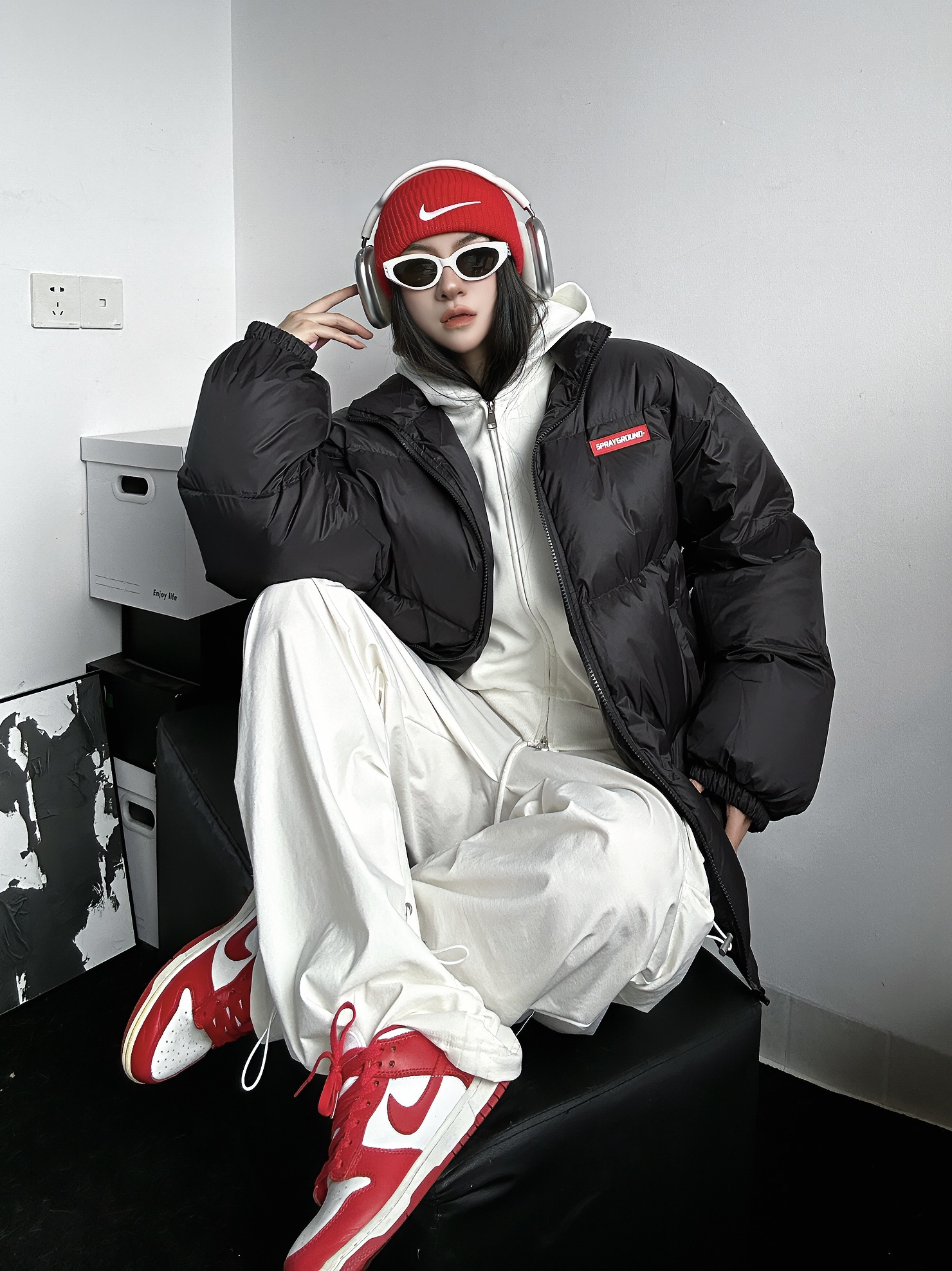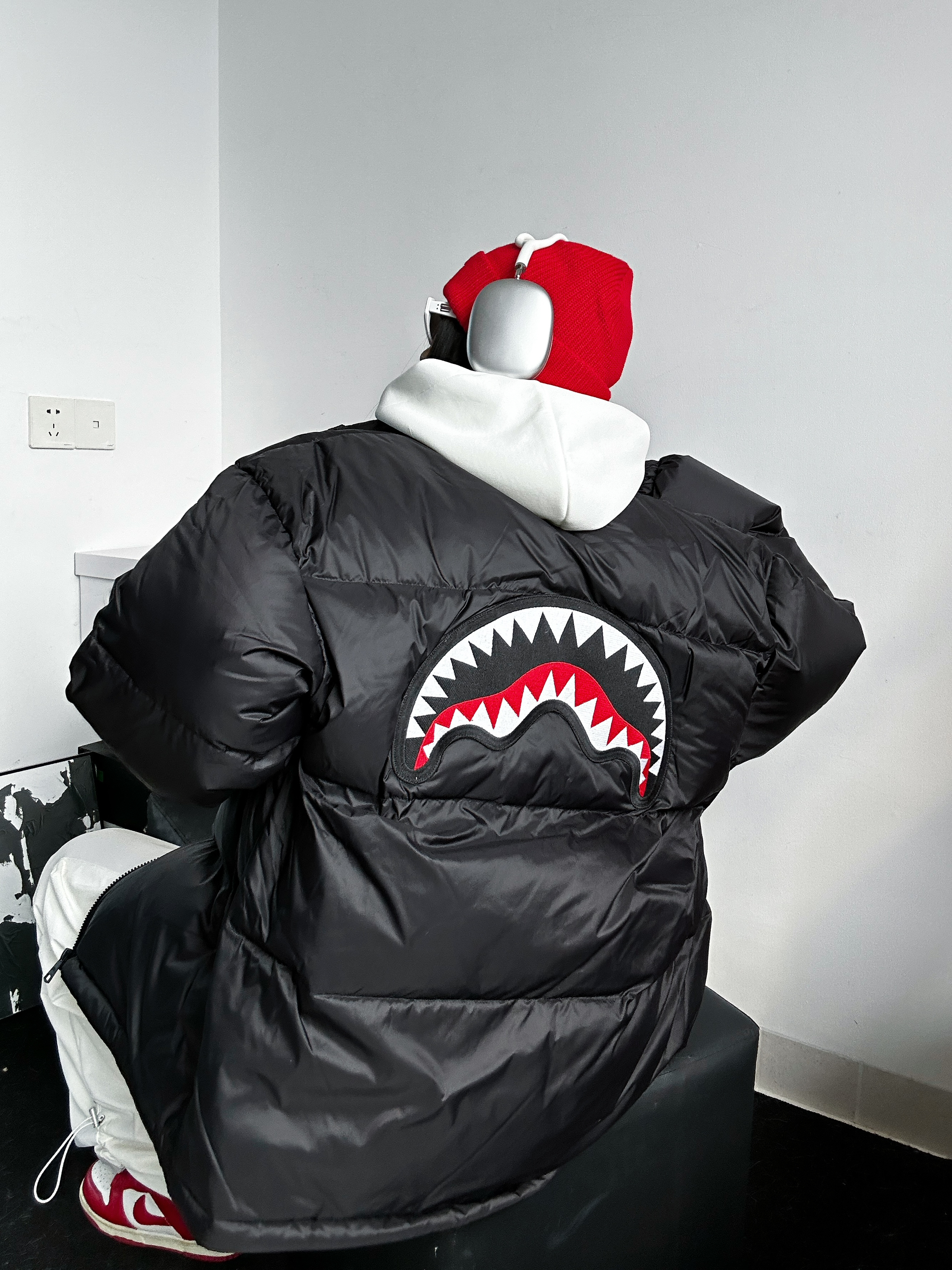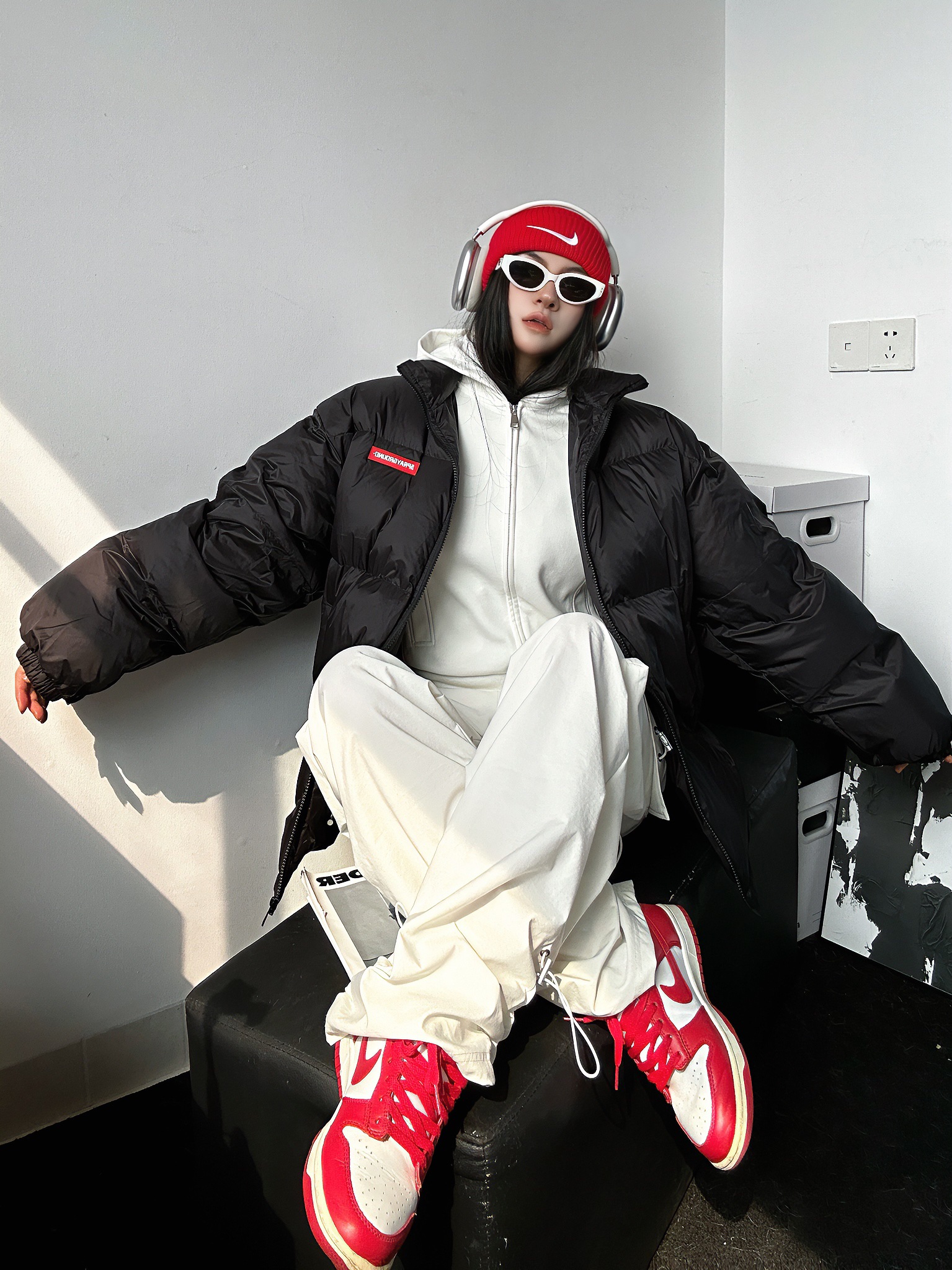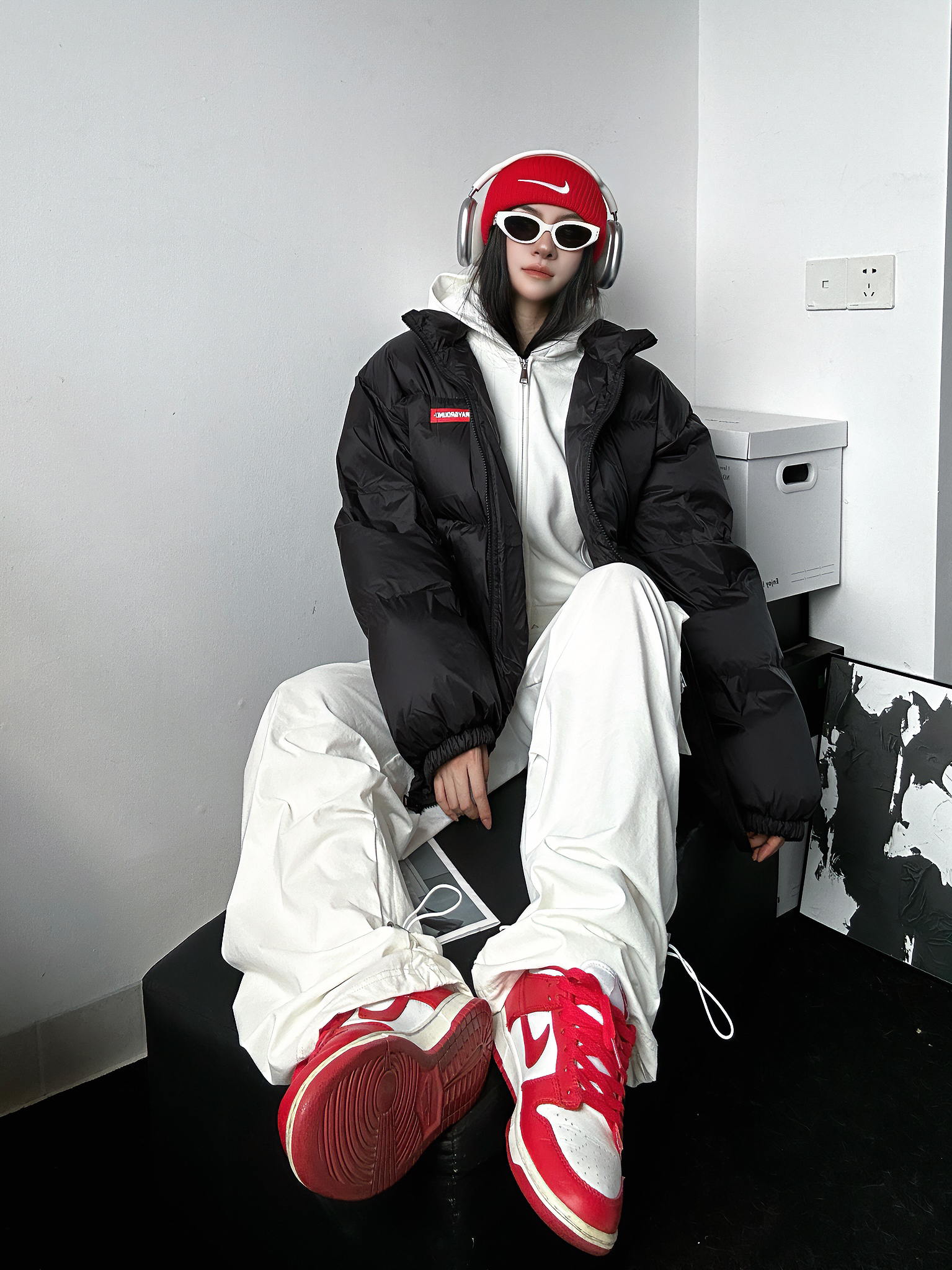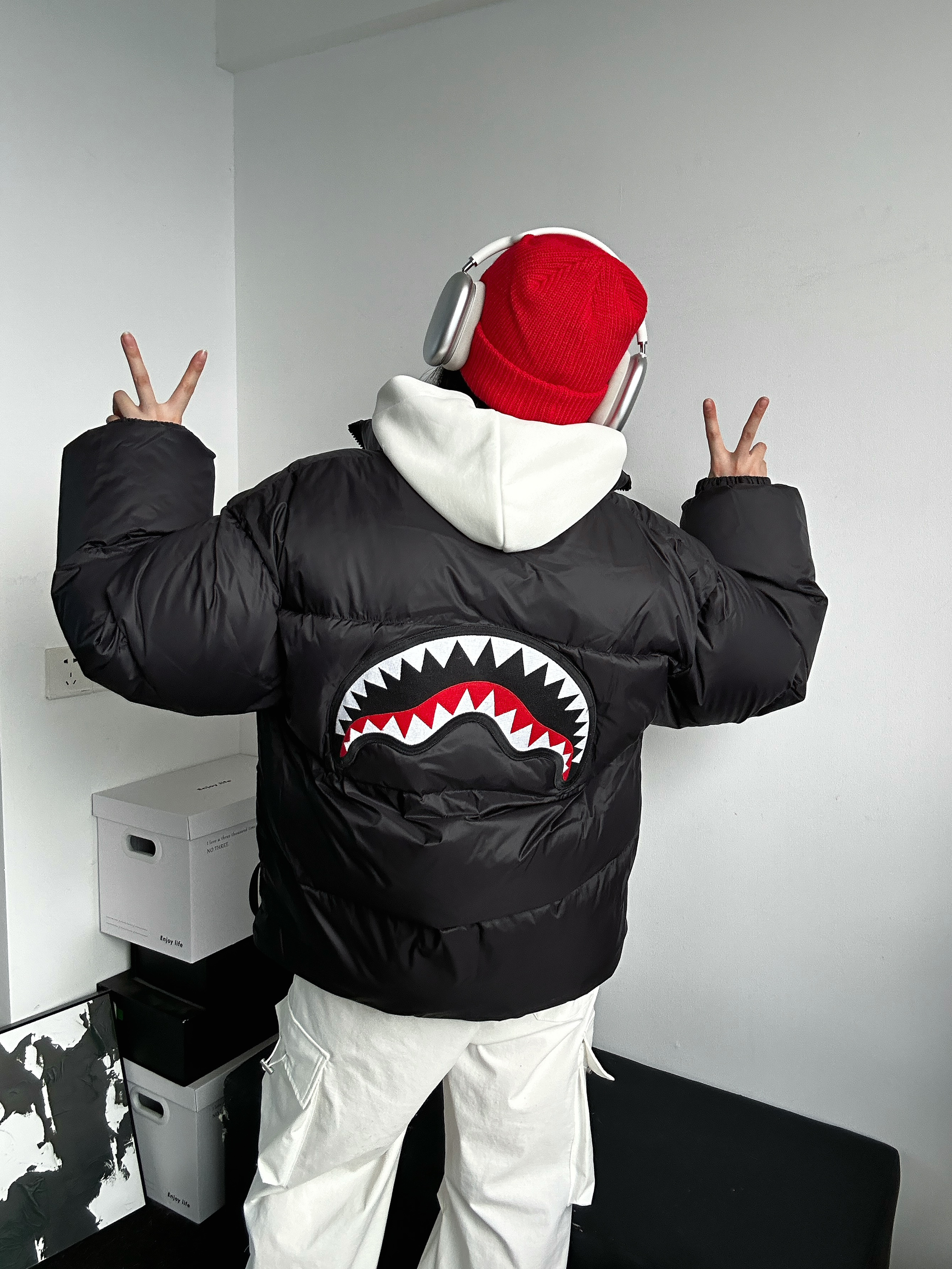 今日穿搭分享 内搭白色连帽卫衣 搭配同色系白色的束脚工装裤👖 外面黑色羽绒服来自sprayground 胸前硅胶小标设计 背后超大一个一个鲨鱼嘴涂鸦 帅气十足✅轻便保暖 可以说是保暖又保帅 最后穿上红白dunk 和针织帽 这套羽绒服穿搭绝了