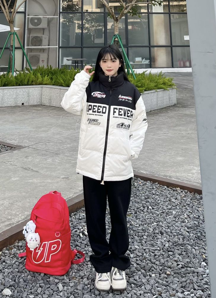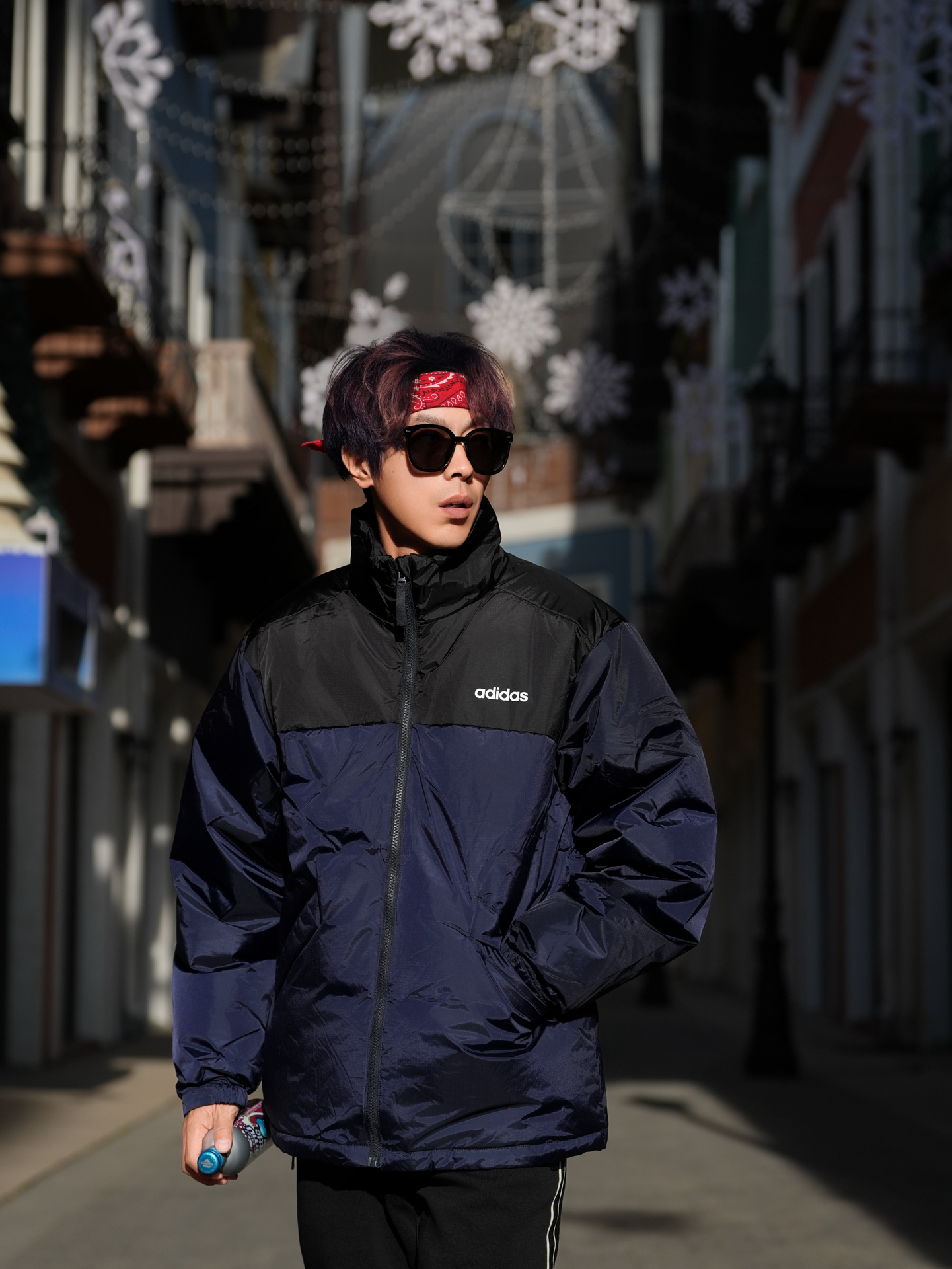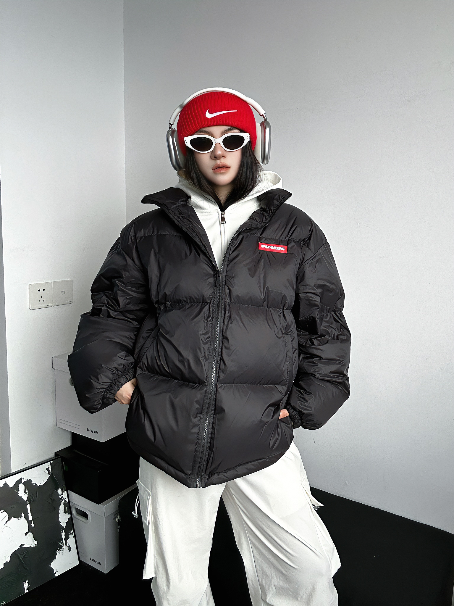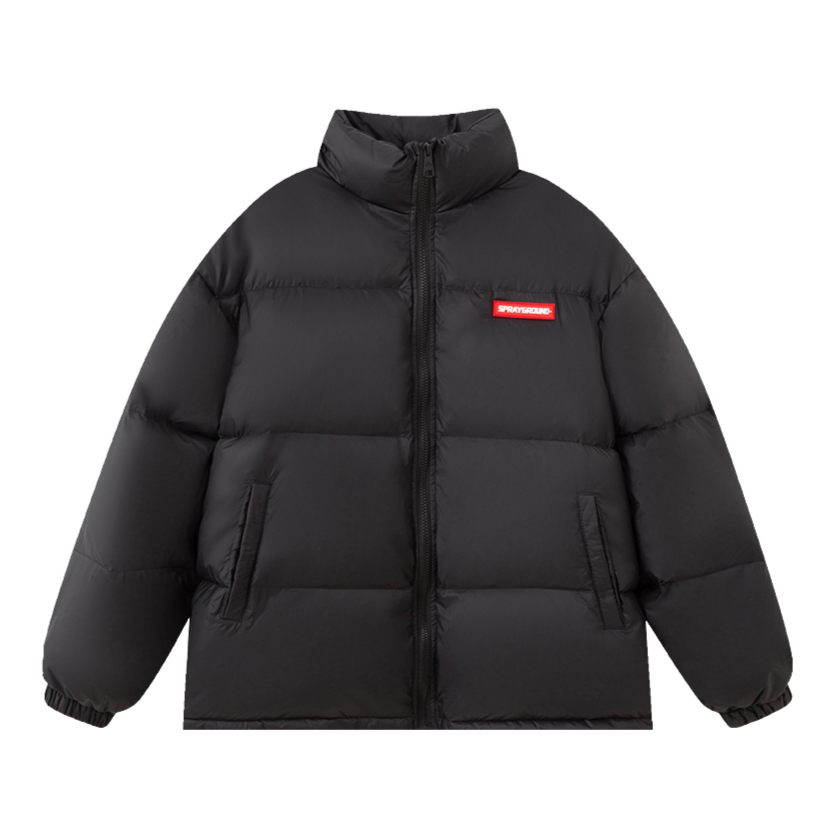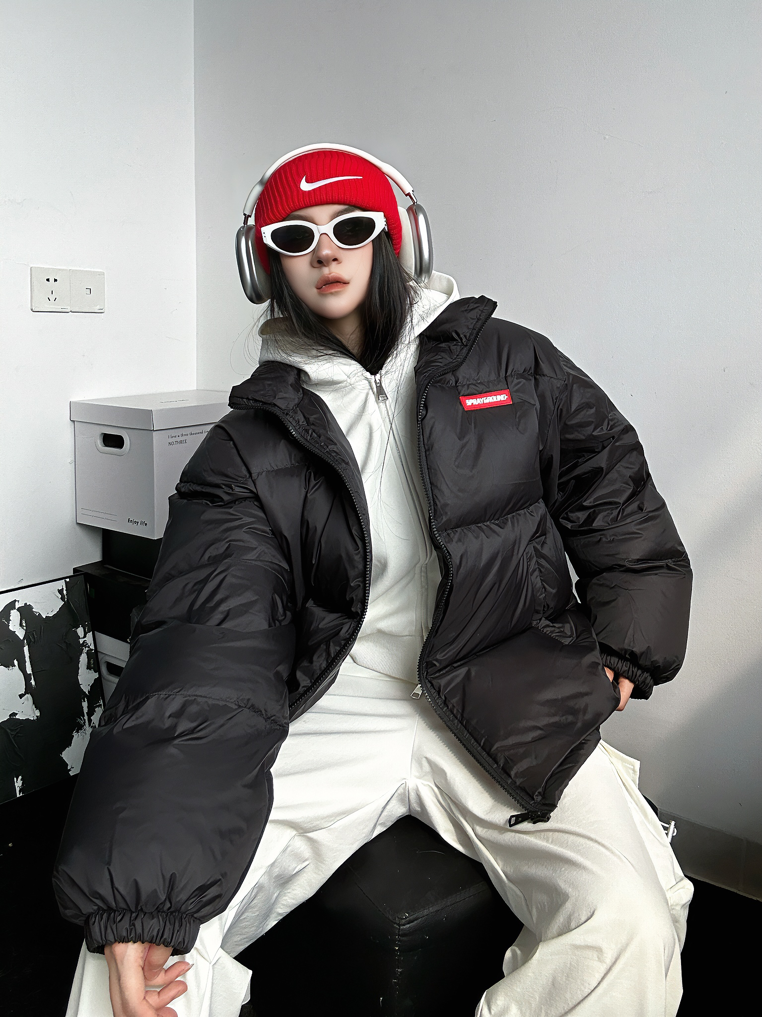 今日穿搭分享 内搭白色连帽卫衣 搭配同色系白色的束脚工装裤👖 外面黑色羽绒服来自sprayground 胸前硅胶小标设计 背后超大一个一个鲨鱼嘴涂鸦 帅气十足✅轻便保暖 可以说是保暖又保帅 最后穿上红白dunk 和针织帽 这套羽绒服穿搭绝了
