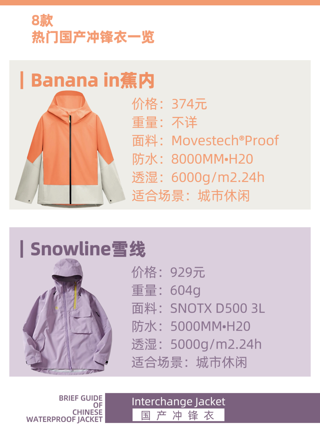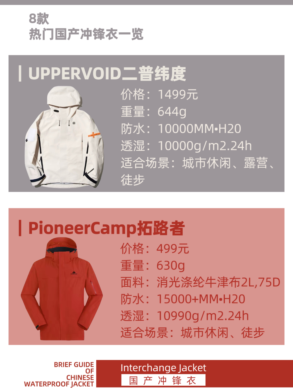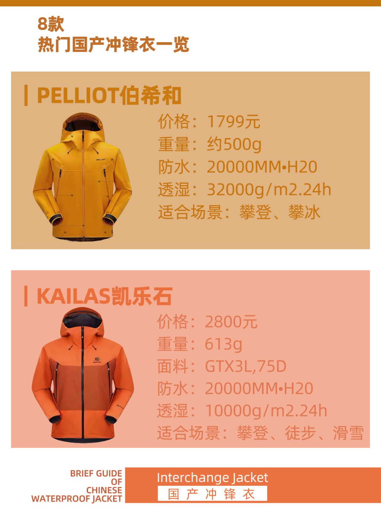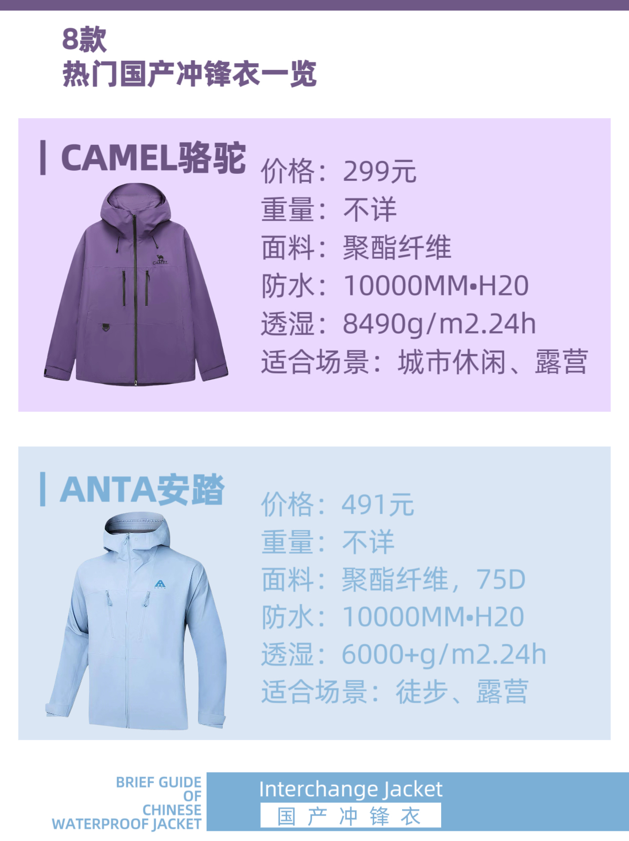☔防风防雨,冲锋衣、硬壳可能是户外运动最重要的装备之一。如今,也有越来越多人将挺阔有型的硬壳穿搭延伸到城市生活和休闲旅行中。 本篇内容,我们挑选了8款热门国产冲锋衣,他们性能怎样,又适合什么场景穿着呢?一起来看看吧。 ✨CAMEL骆驼 国产冲锋衣销量TOP品牌,满足基础防水需求,没有冗余的功能设计,对城市休闲和高原旅行应对突变天气来说,非常实用。 价格:299元 适合:城市休闲、露营 ✨安踏 安踏...