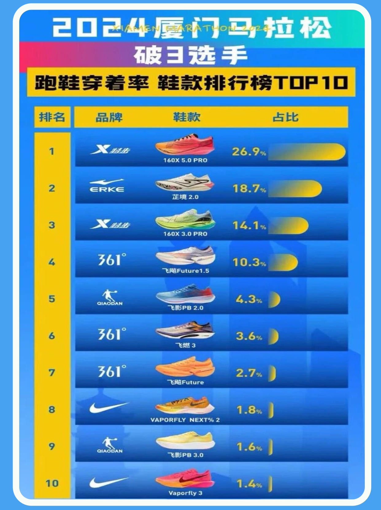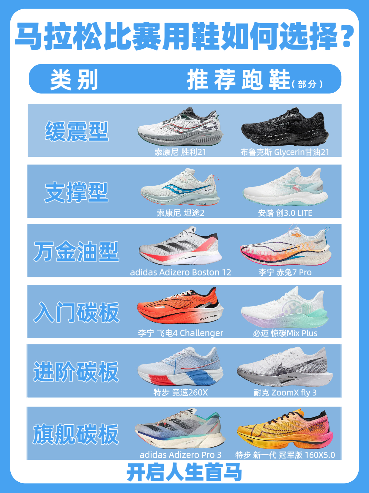 和我一样备赛马拉松的uu们有这样的困惑吗? 1️⃣没有特别系统的备赛,只求人生首马,穿一双舒适的鞋子,安全完赛腿脚无恙 2️⃣已经体验过马拉松比赛,觉得以自己的跑力可以更快,此时需要一双好鞋的助力 3️⃣跑完全马,每次不是顶着脚疼,就是磨出大水泡,第二天还是“海的女儿” 4️⃣追求穿搭,很是臭美,每次比赛都想穿一双新鞋子拍出美美的照片 5️⃣已经是一名出色的跑者,总想追求最好的装备,最后却被跑鞋的...