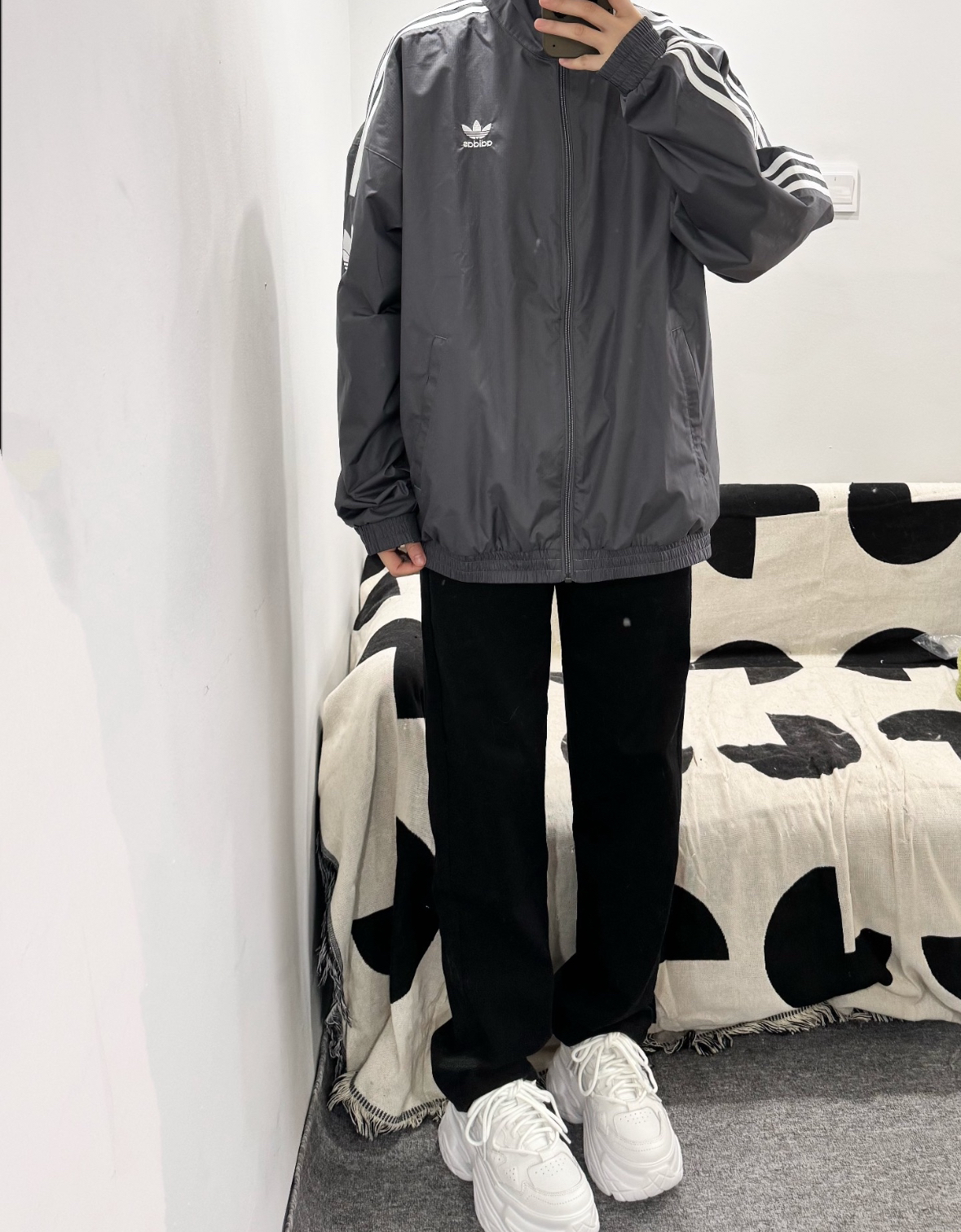秋天穿冲锋夹克刚刚好 灰色配色上身敲有高级感 简单logo设计好搭配衣服 日常搭配伞兵裤就蛮帅气的