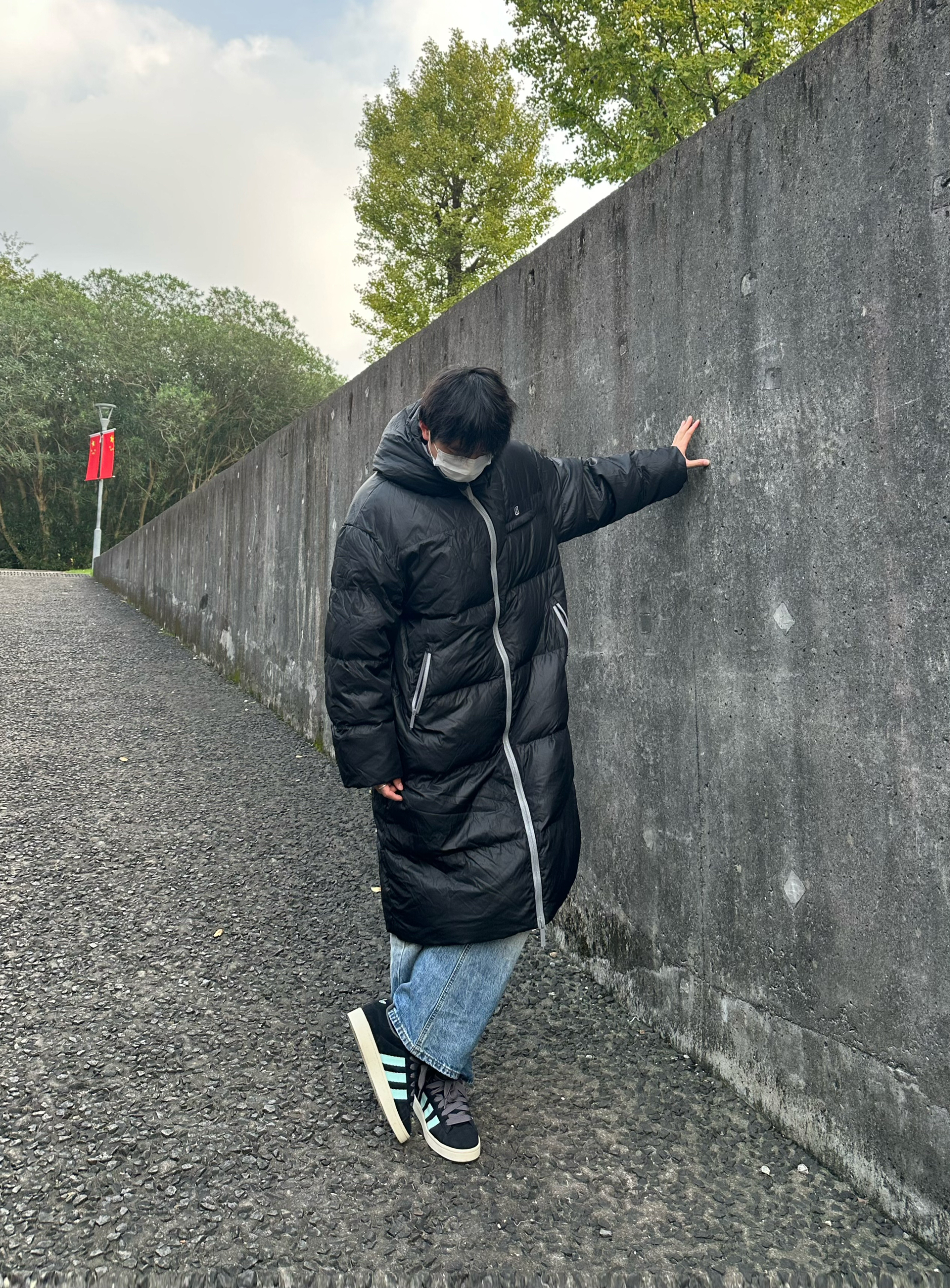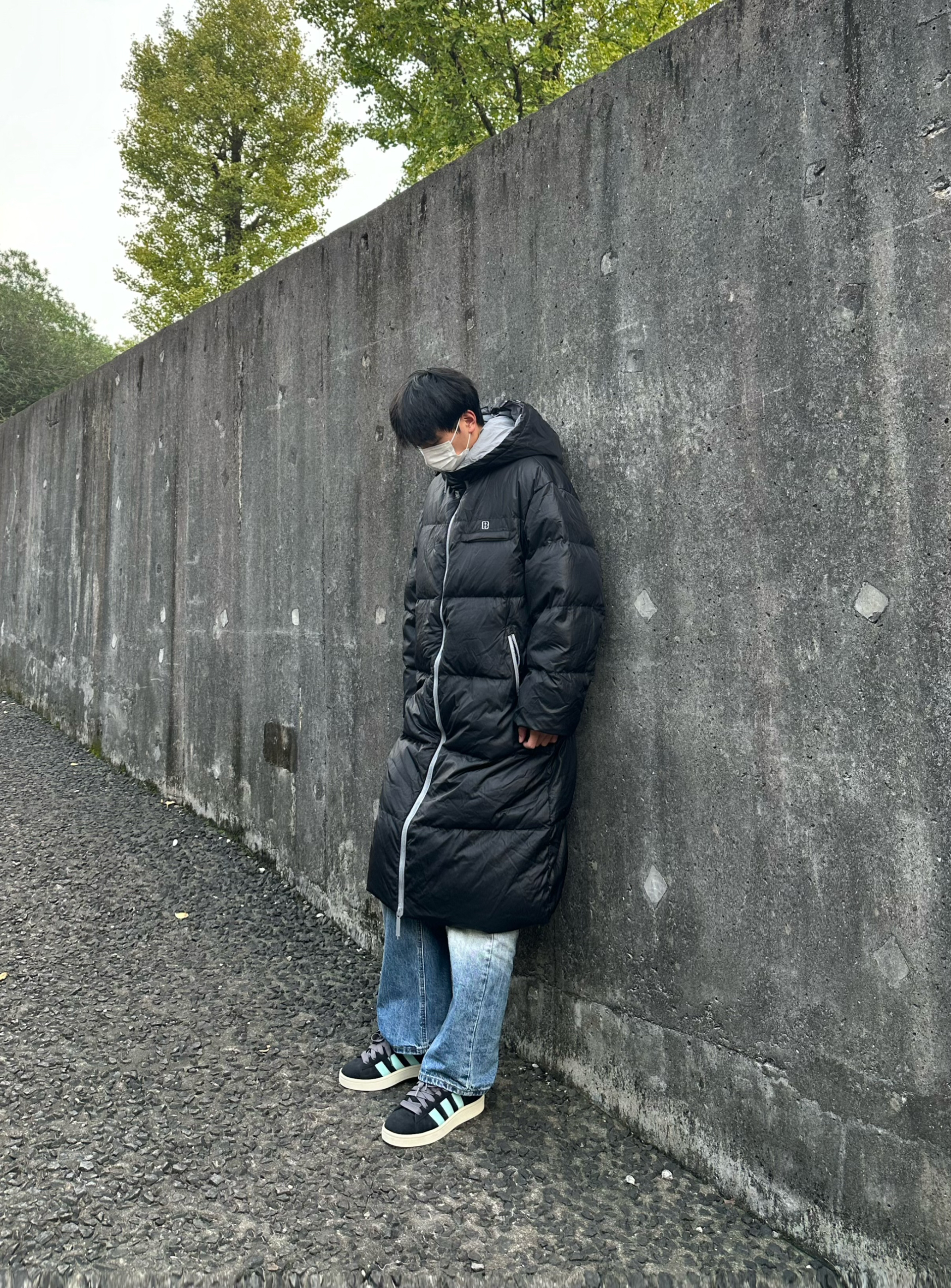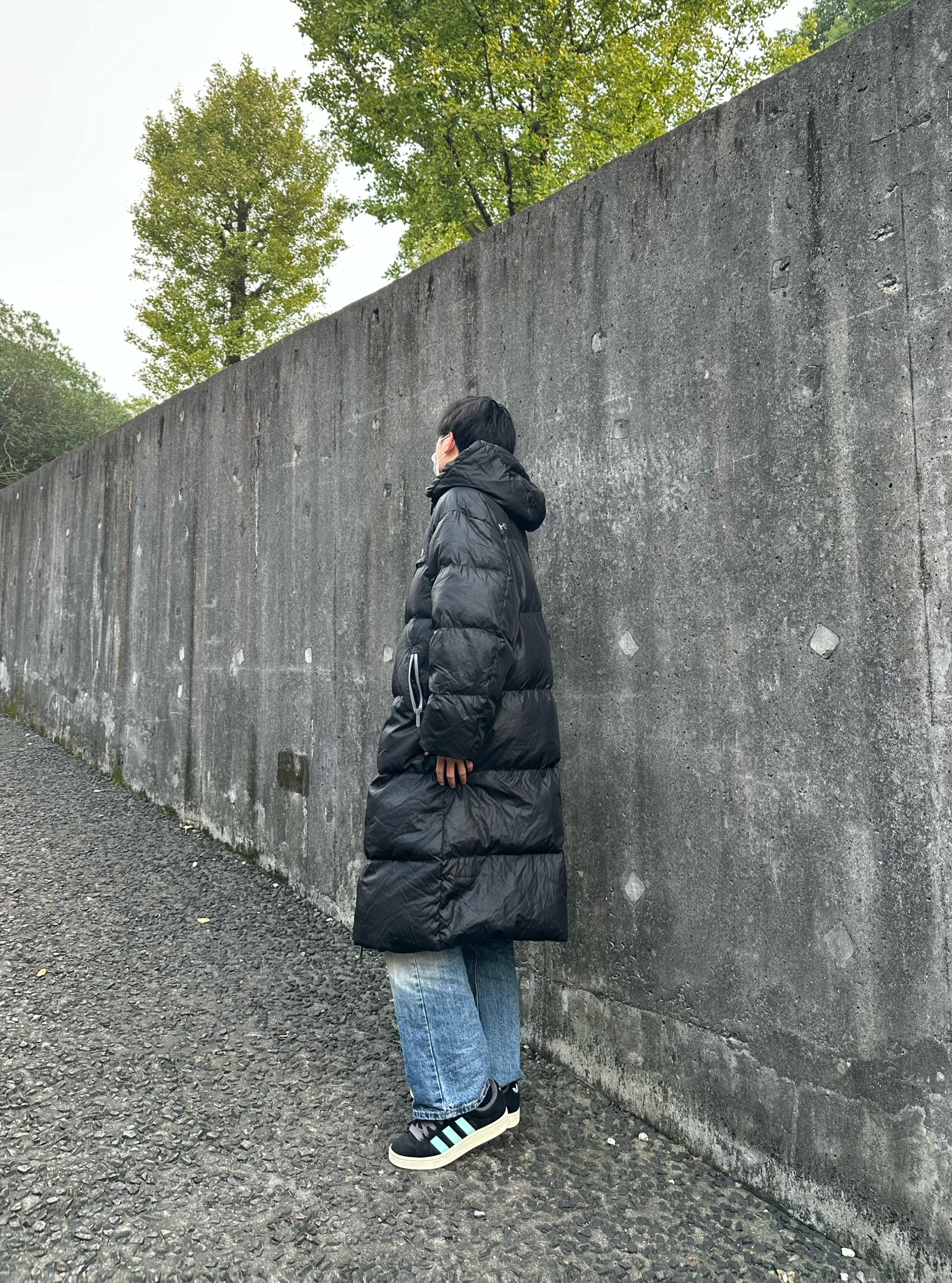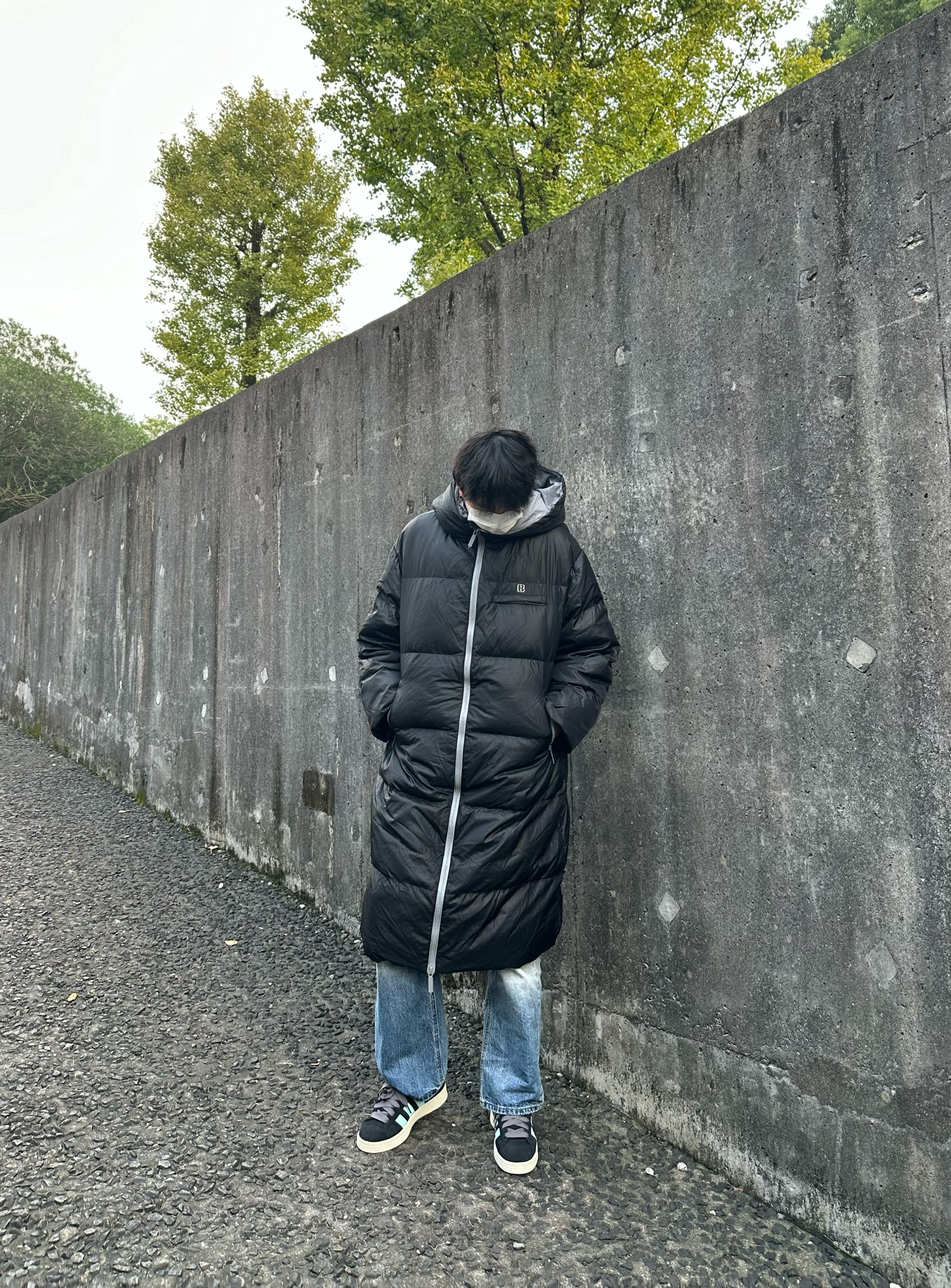 👔 BJHG 基础款纯色白鸭绒连帽长款羽绒服 长款羽绒服带来的安全感真的无法想象 长款把我从上到下包裹住 冬天来了也不在怕 而且每一块都蓬蓬的容量很在线 整体黑色秋冬氛围感拿下 👖 URS GGON 闪电纹牛仔裤 👟 Adidas Campus 本人 185/75 👔 xl 👖 xl