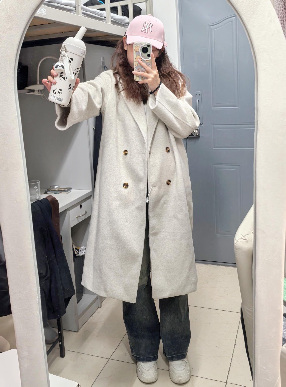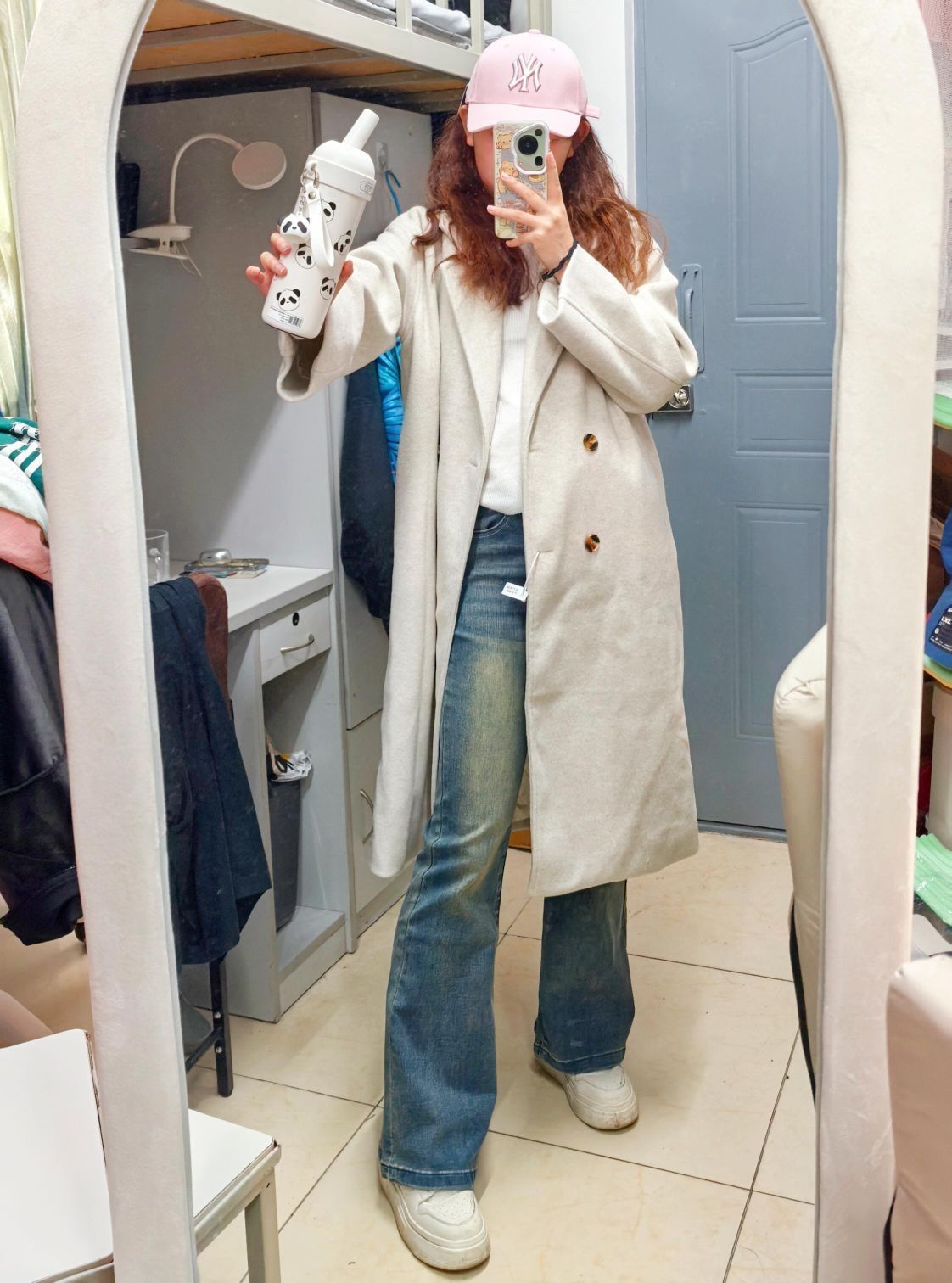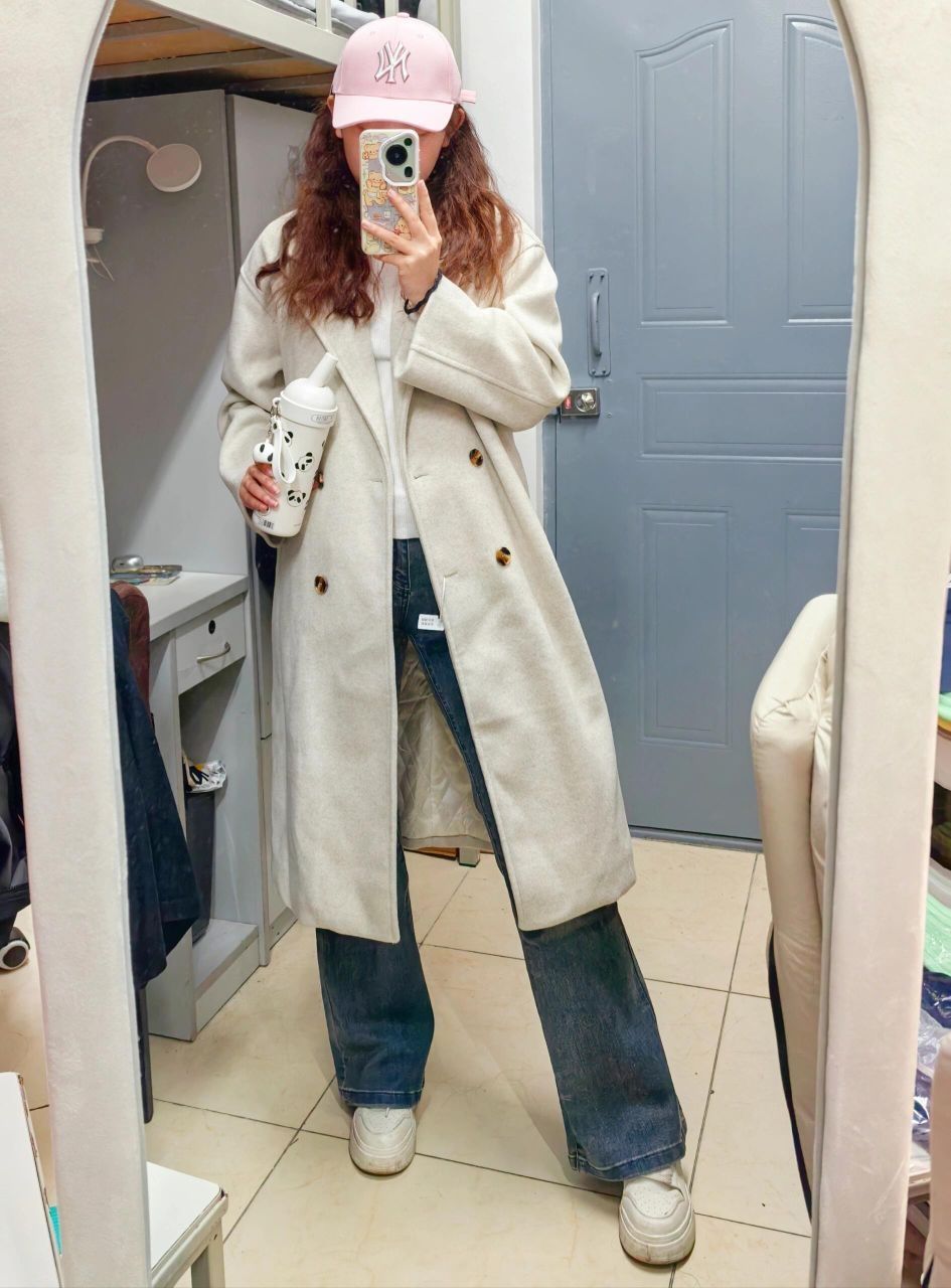 和朋友去商场吃饭,中途需要脱外套,简约休闲的风格最合适啦~ ⭐燕麦色大衣真的很百搭超适合女大学生!面料很厚实! ⭐简单白色内搭配复古微喇牛仔裤真的绝绝子!!!本人大腿内侧有肉肉,很难买到显腿细的裤子 这条裤子版型超好~ ⭐不想化妆的一天出门带个帽子就够啦!粉色帽子设计感超足,帽型很好~最主要是显白、显脸小 ⭐秋冬要多喝水,熊猫挂坠不要太可爱!保温效果也很好!本干皮秋冬救星!!谁能拒绝这么可爱的水杯...