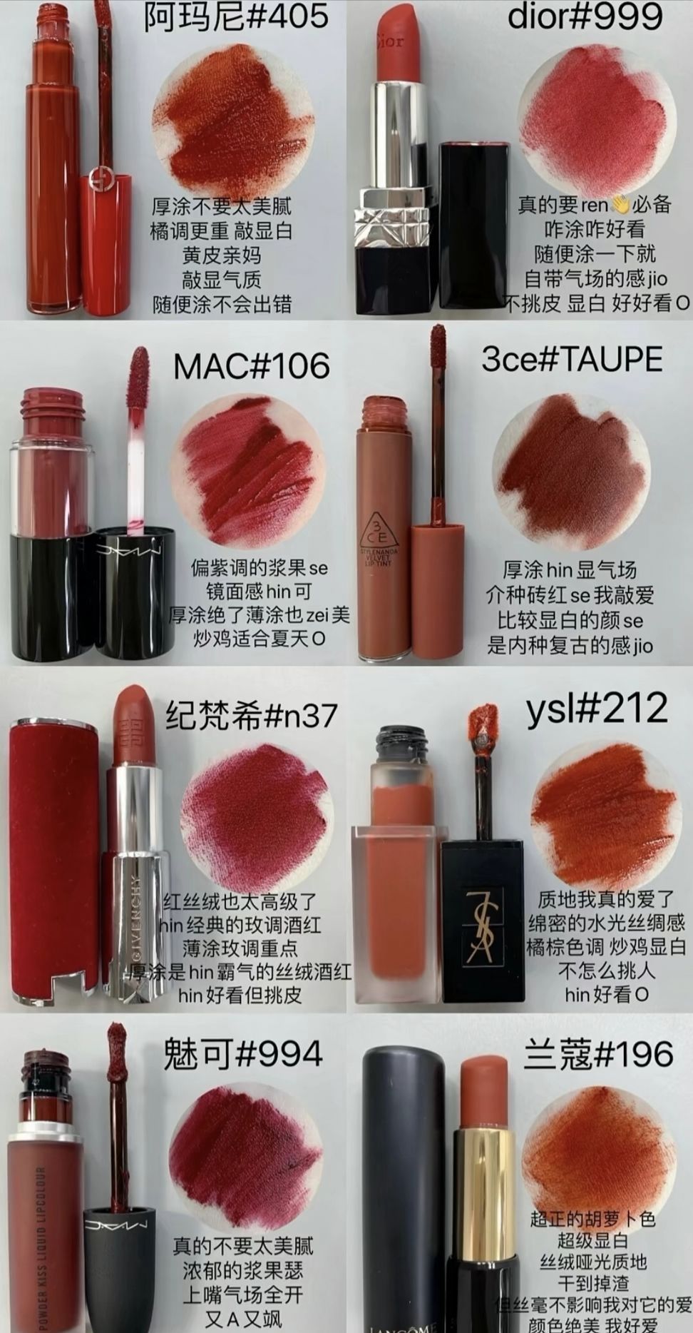 本篇笔记关联了GIORGIO ARMANI/阿玛尼 红管系列臻致唇釉 柔雾丝绒哑光显白雾面 6.5ml 405番茄红SULTAN、MAC/魅可 尤雾弹丝缎柔雾液体唇釉 哑光显白 5ml 997吃土咖OVER THE TAUPE、YSL/圣罗兰 黑管唇釉 自然持久欲感镜面玻璃唇 5.5ml 416烂番茄等商品,为用户提供真实的使用体验和购买参考。