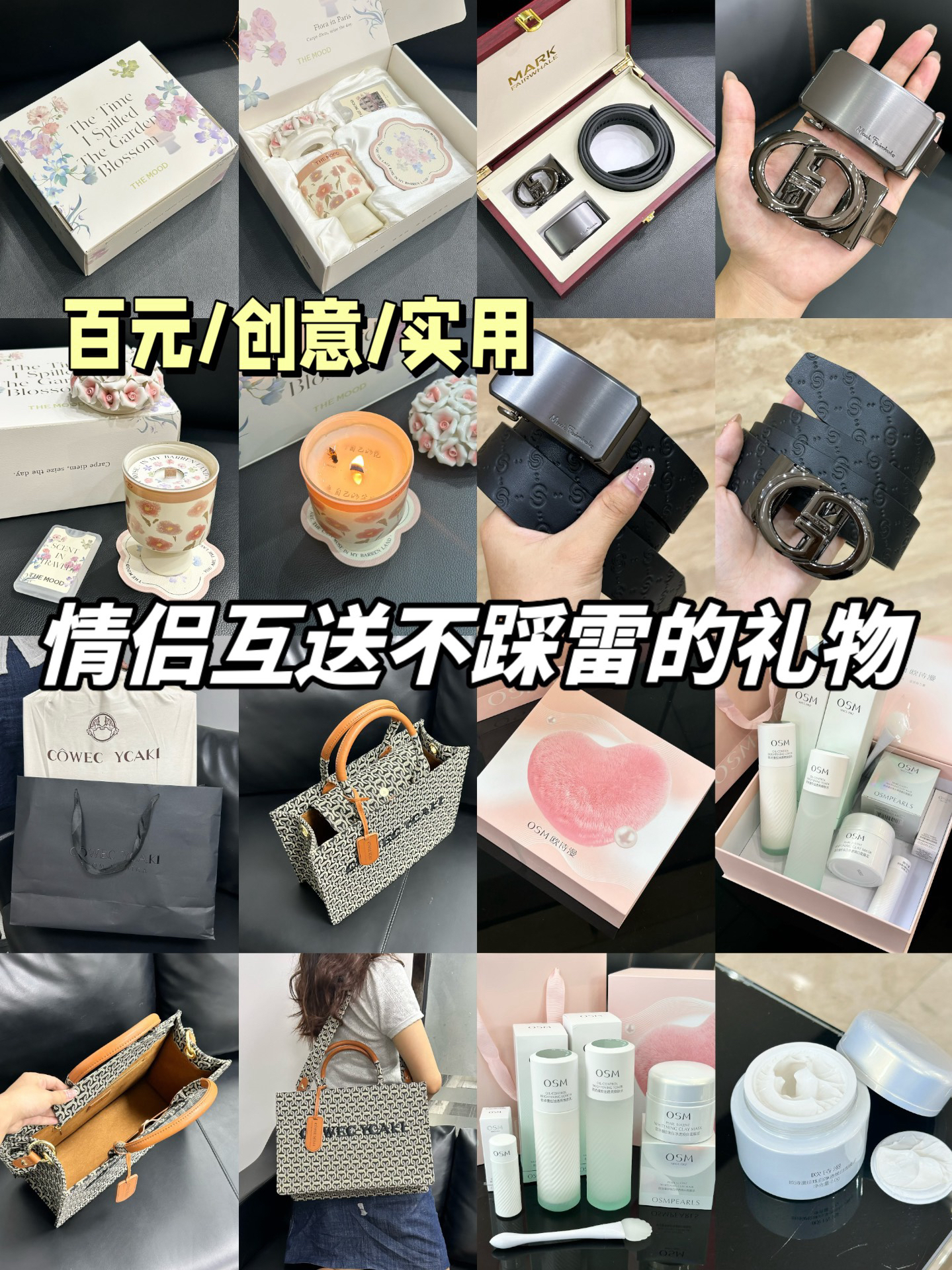 整理了一期适合情侣互送的礼物合集~ 希望对你有帮助 大数据请推给正在挑礼物的朋友🥳 巴黎花市香薰蜡烛礼盒 扑面而来的茉莉栀子香闻起来真的很治愈舒服 花束设计的陶瓷杯身也chao有质感 用不凋零的花就像永不凋零的爱 皮带定制礼盒 可定制的木质礼盒 高级大方 不得不说 整体质感真的不错呢 护肤礼盒 我觉得颜值蛮高呢,质地清爽适合夏天用 粉粉嫩嫩的礼盒 开箱仪式感给足啦~ 复古老花包包 适合通勤...