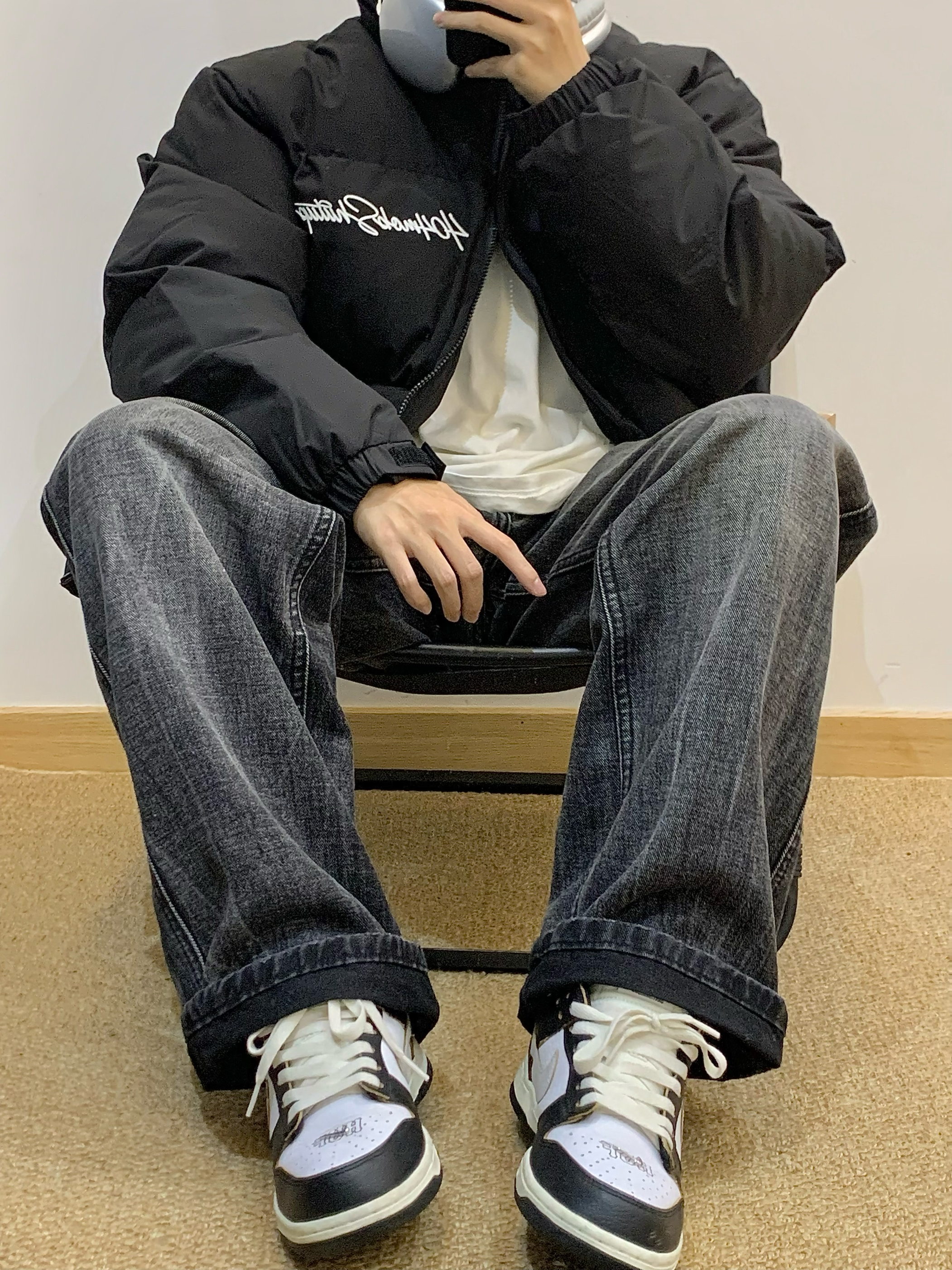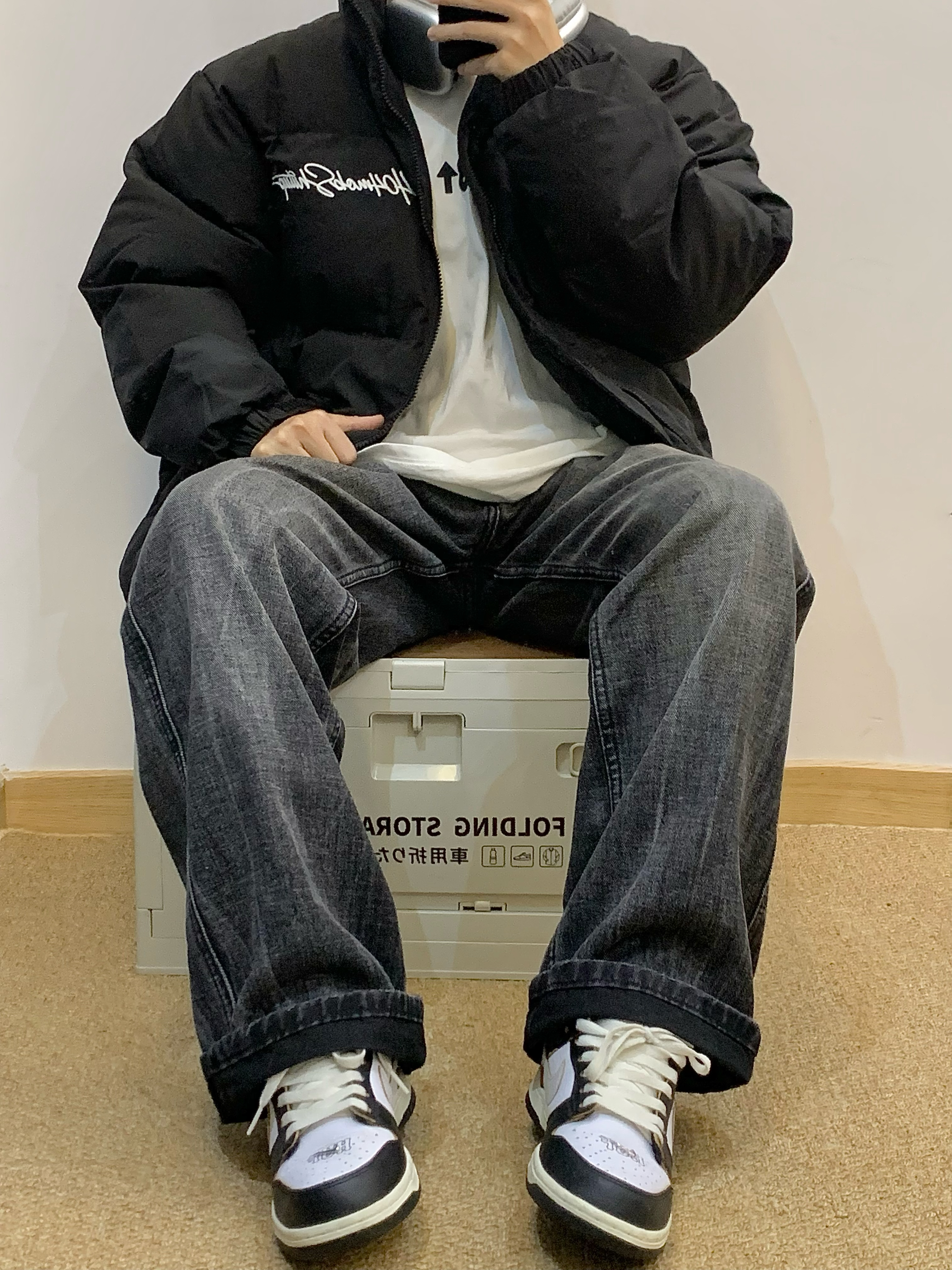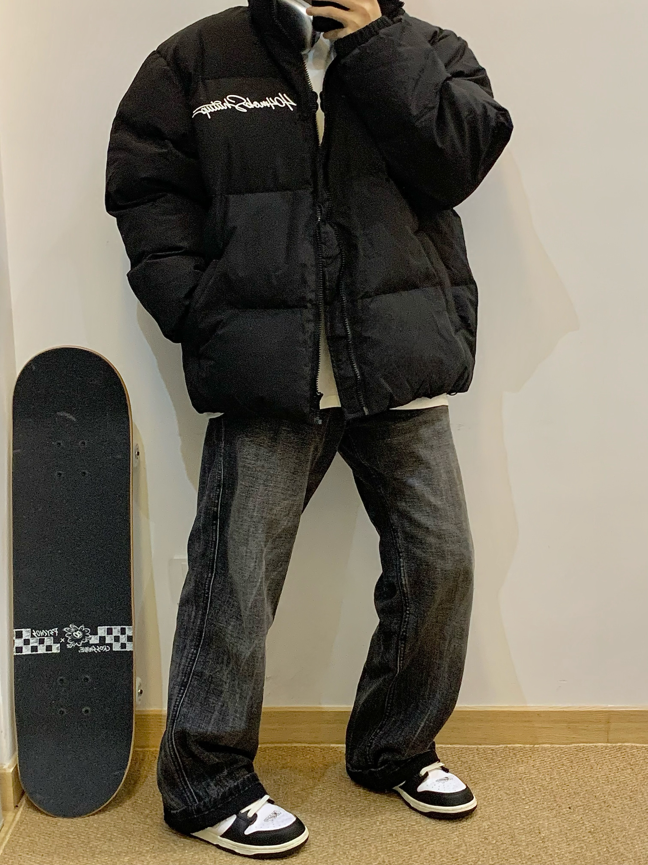 黑色棉服➕黑灰色牛仔裤 防风防水防污的面料 很耐脏 充棉量很足 上身立马就暖和了 后背草写刺绣logo 设计感十足 随便一穿就很出片 日常搭配也轻松搞定! 👔:404MOB 👟:Huf x Nike
