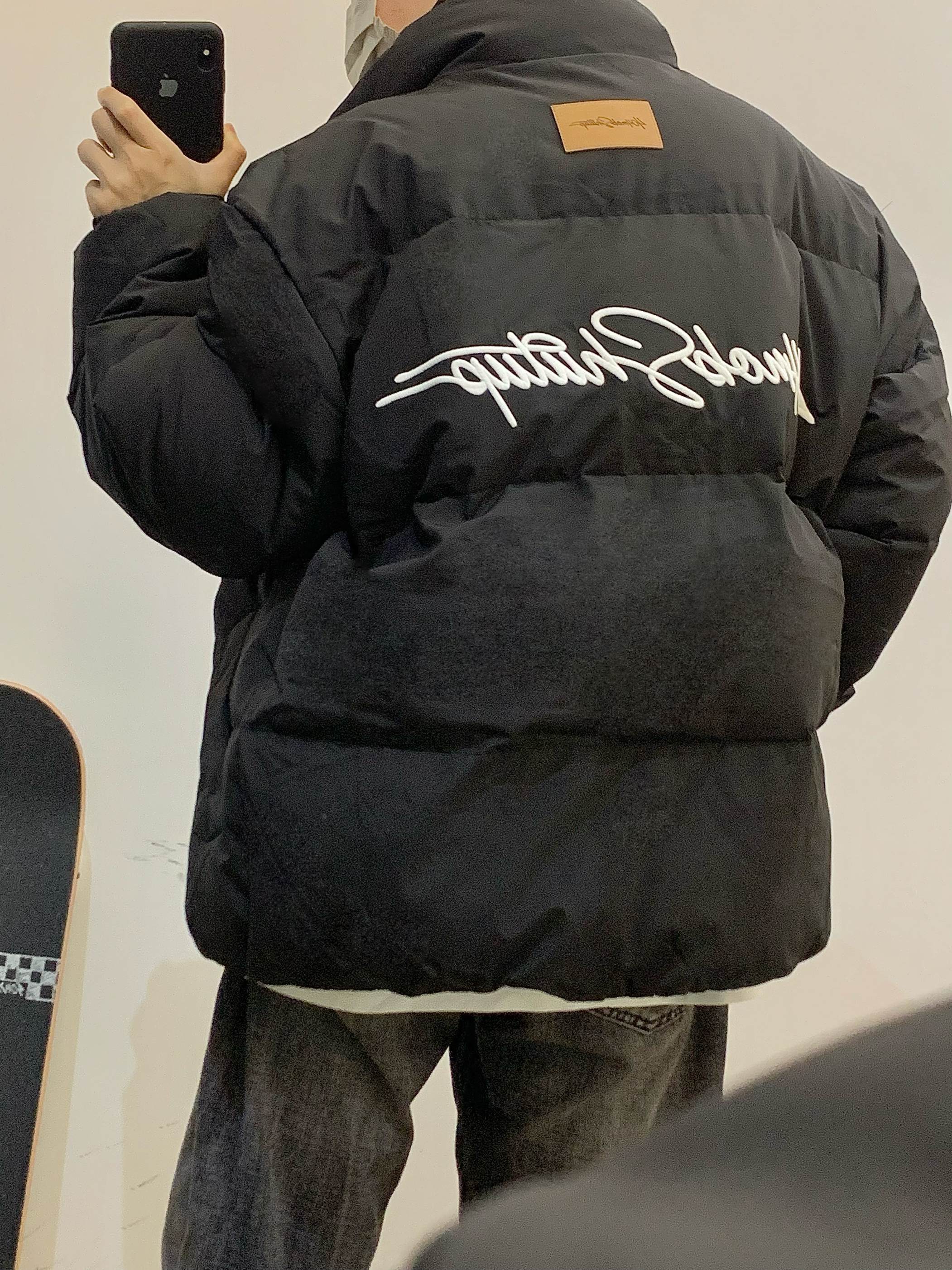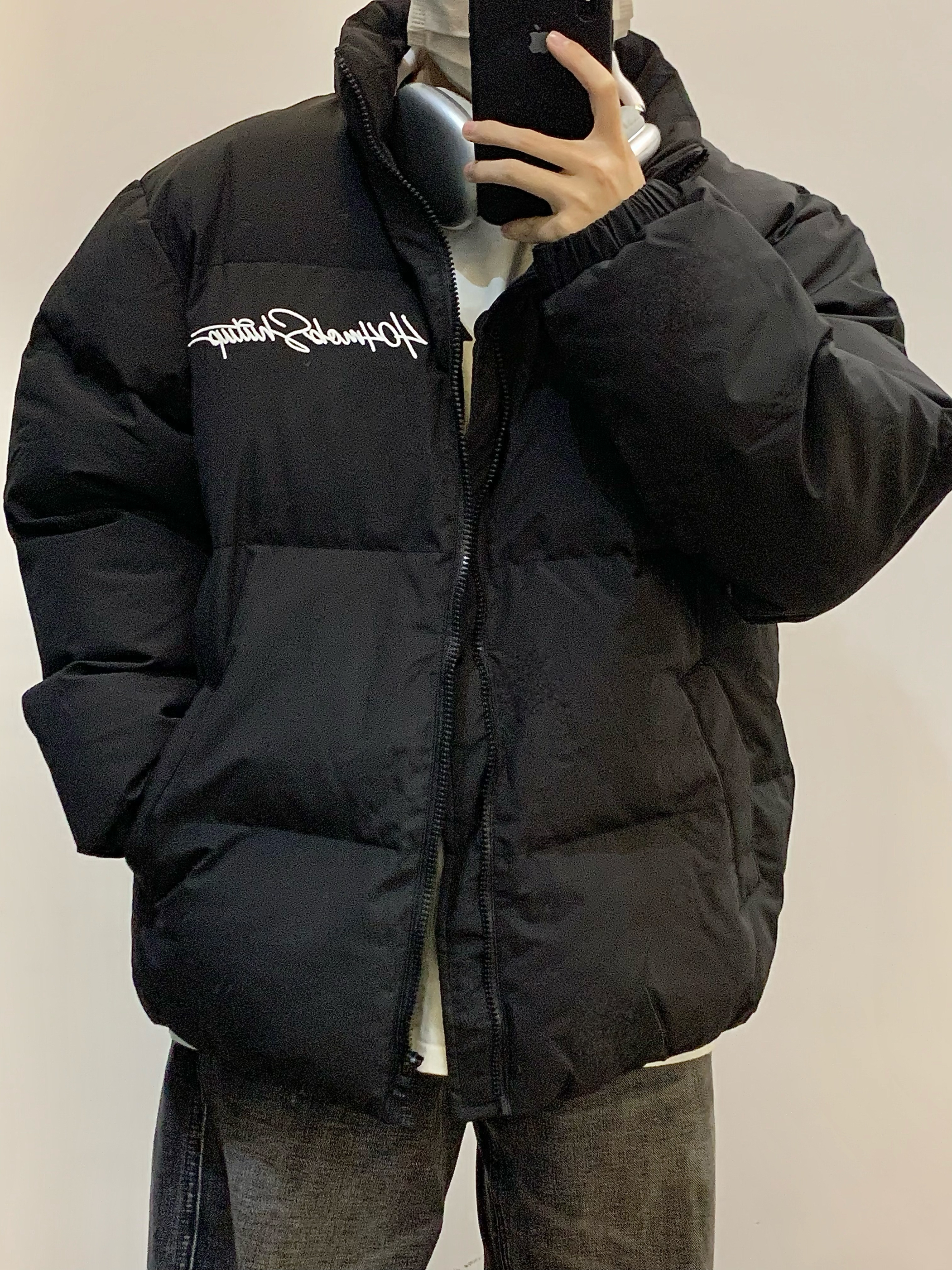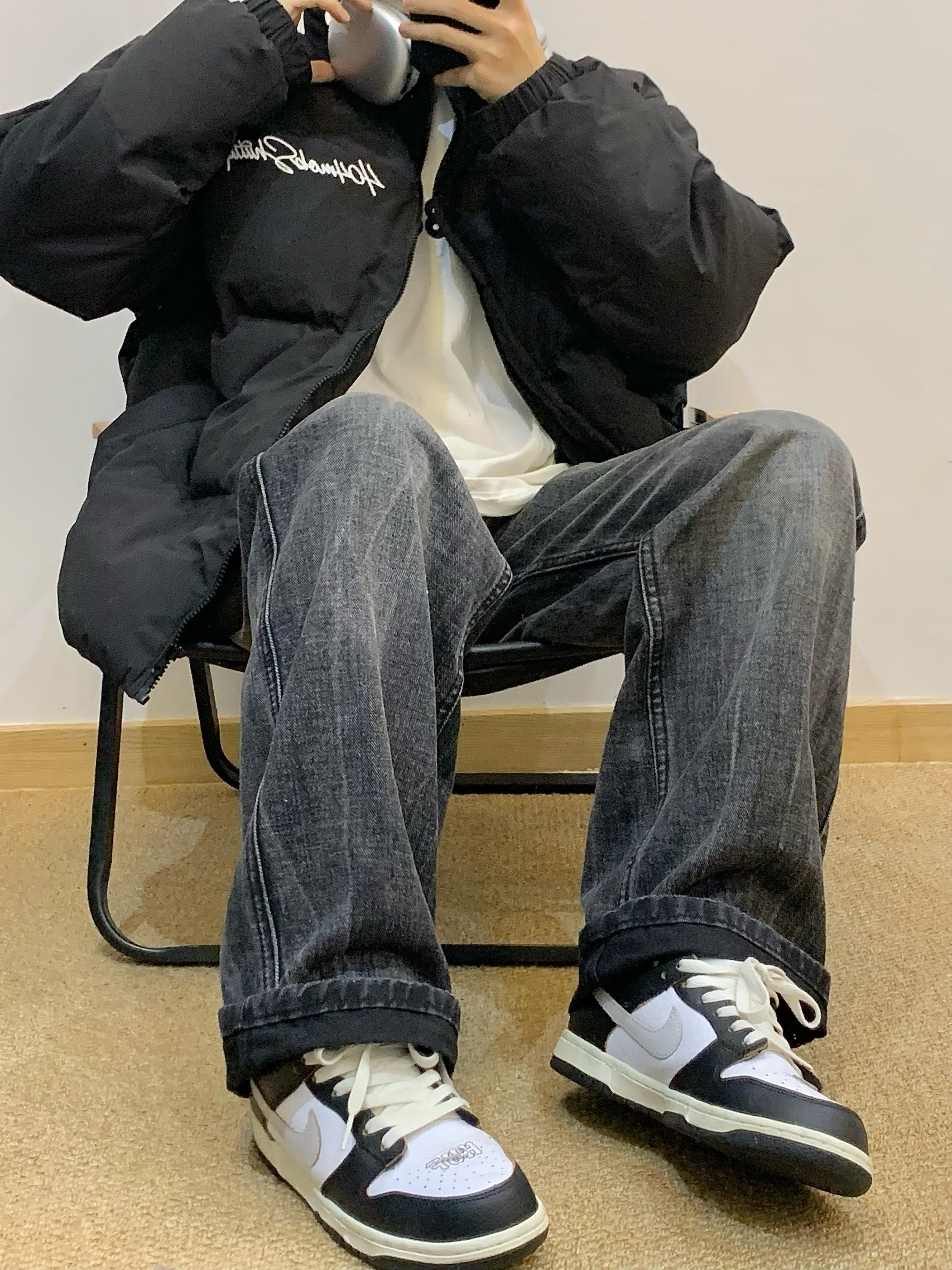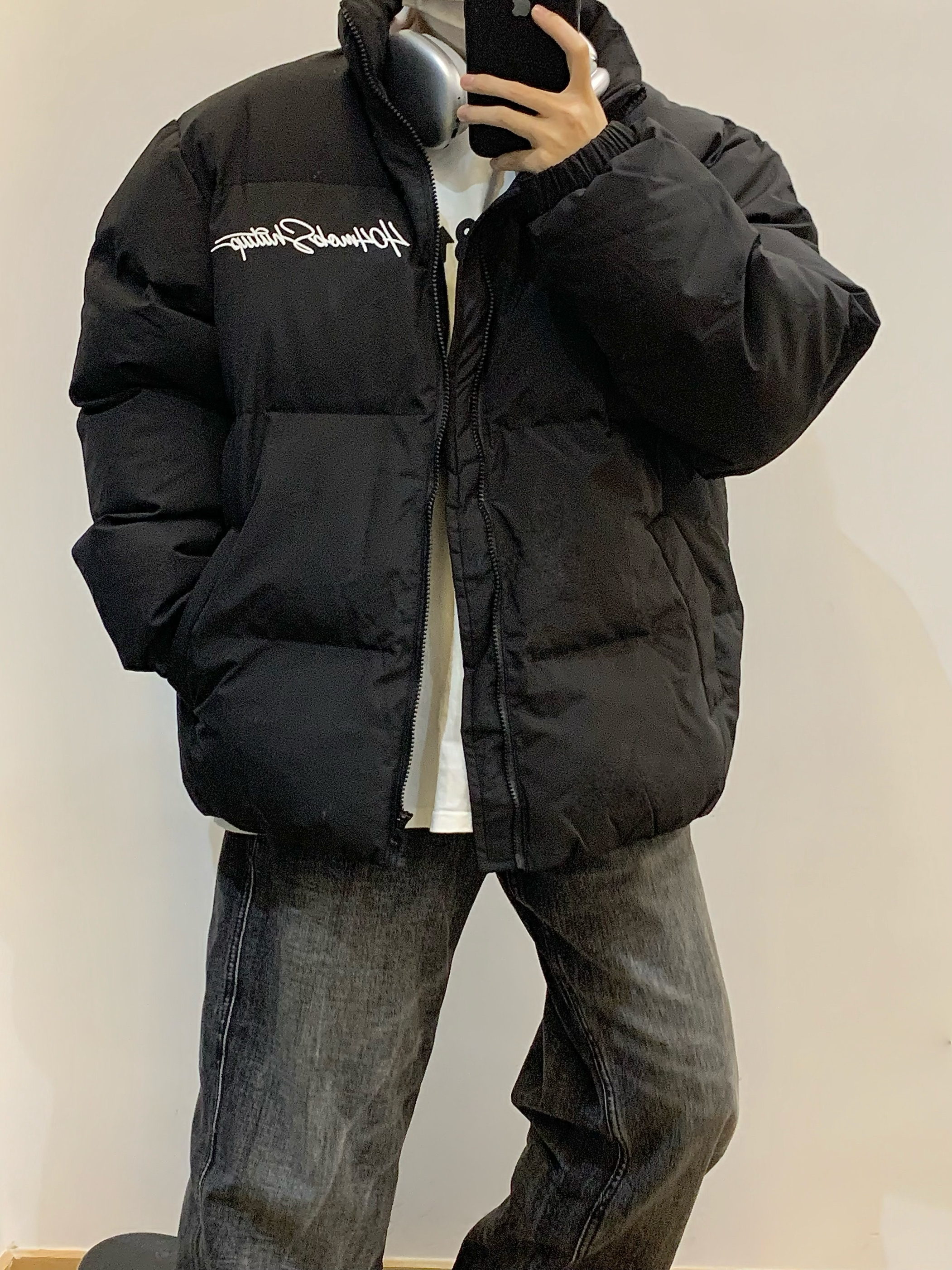 黑色棉服➕黑灰色牛仔裤 防风防水防污的面料 很耐脏 充棉量很足 上身立马就暖和了 后背草写刺绣logo 设计感十足 随便一穿就很出片 日常搭配也轻松搞定! 👔:404MOB 👟:Huf x Nike