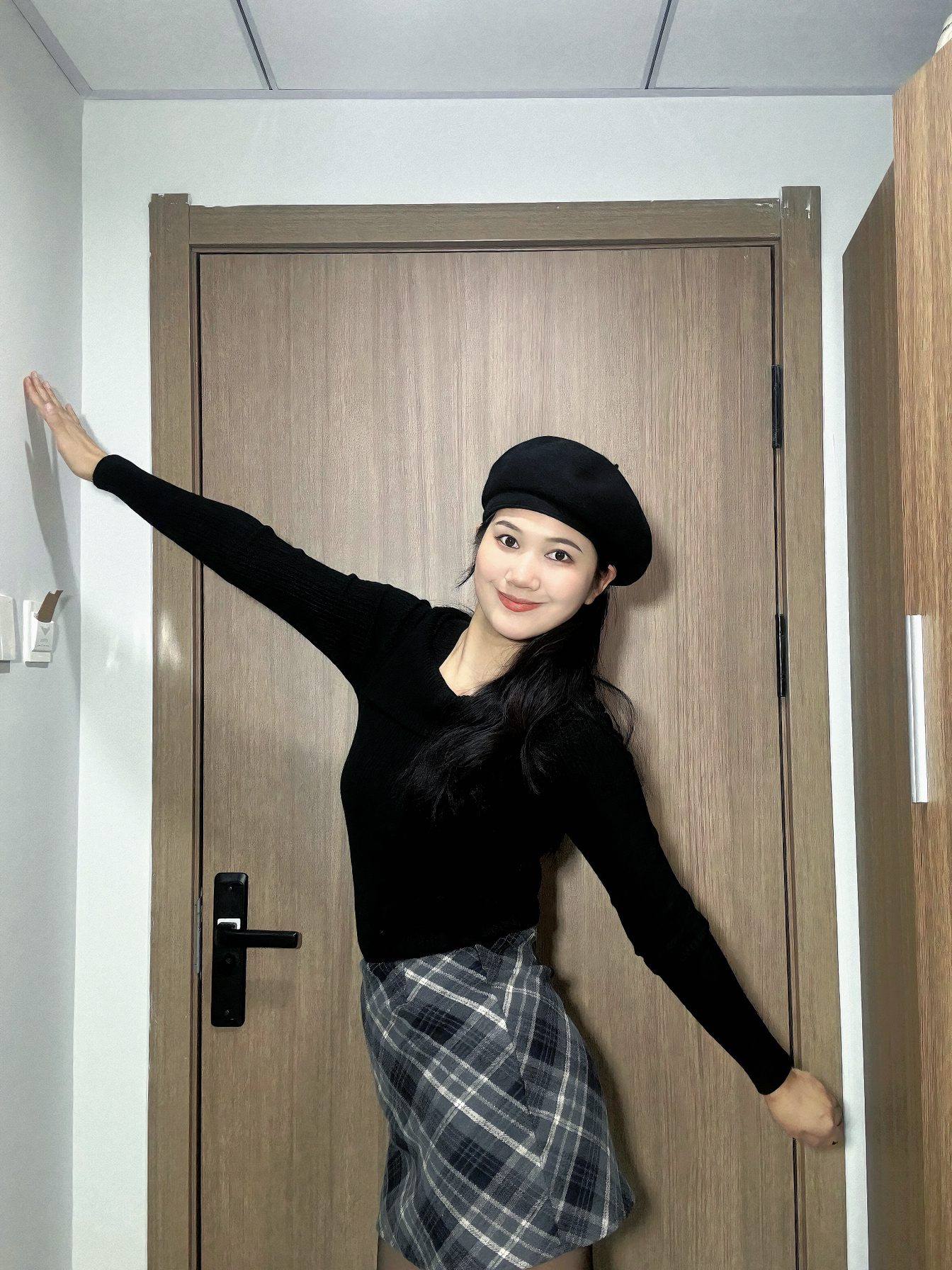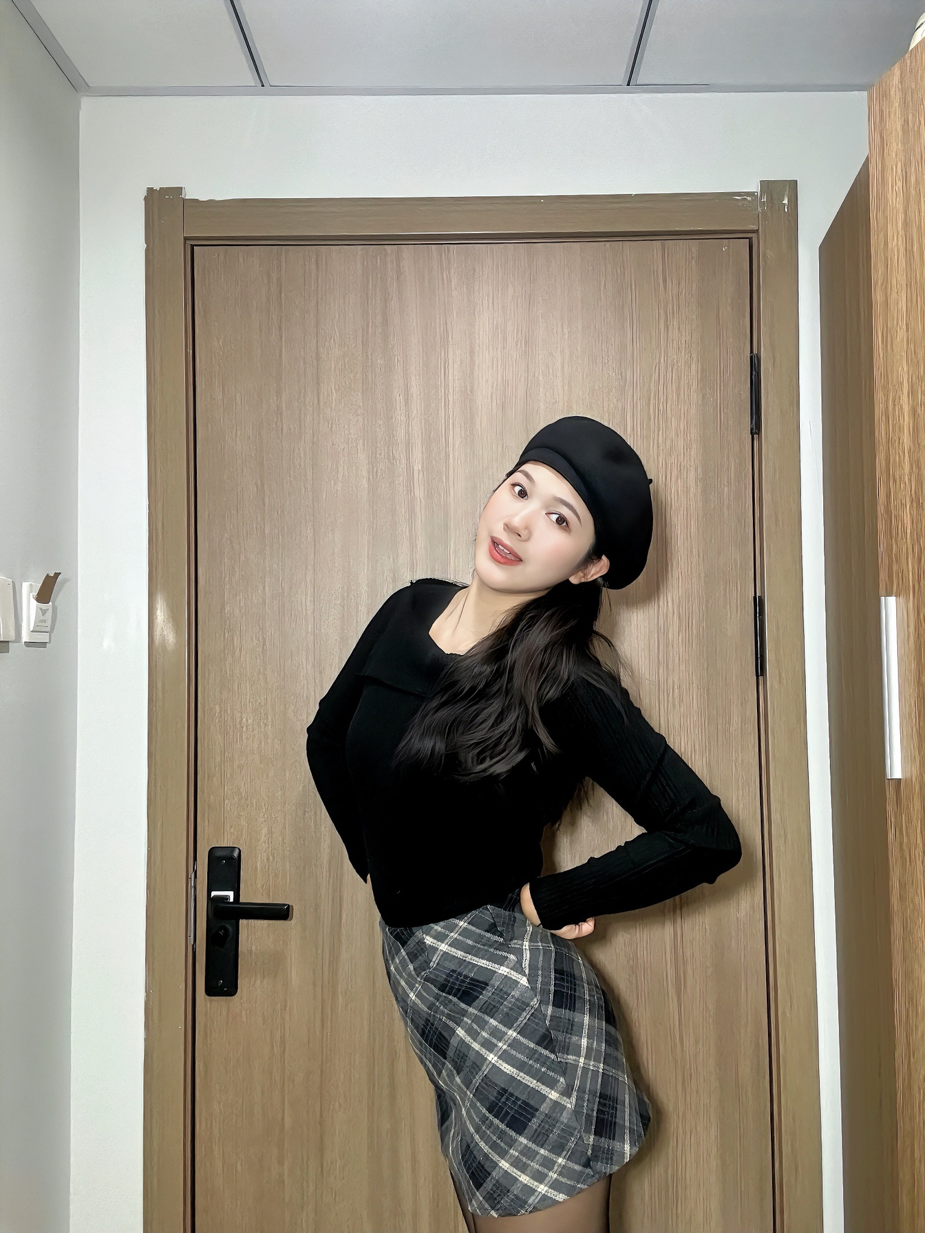 身高|体重:170 60 🧍♂️ 穿搭风格:黑色系乖乖女风 👔 上衣:穿了一件黑色的设计感毛衣 👖 下装:藏青色格裙 A字版型很显瘦哦 🎒配饰:黑色的不规则贝雷帽 戴上显脸小