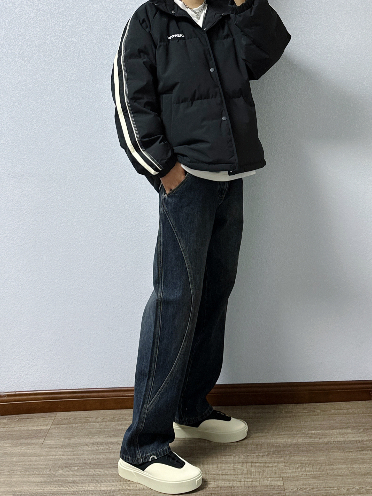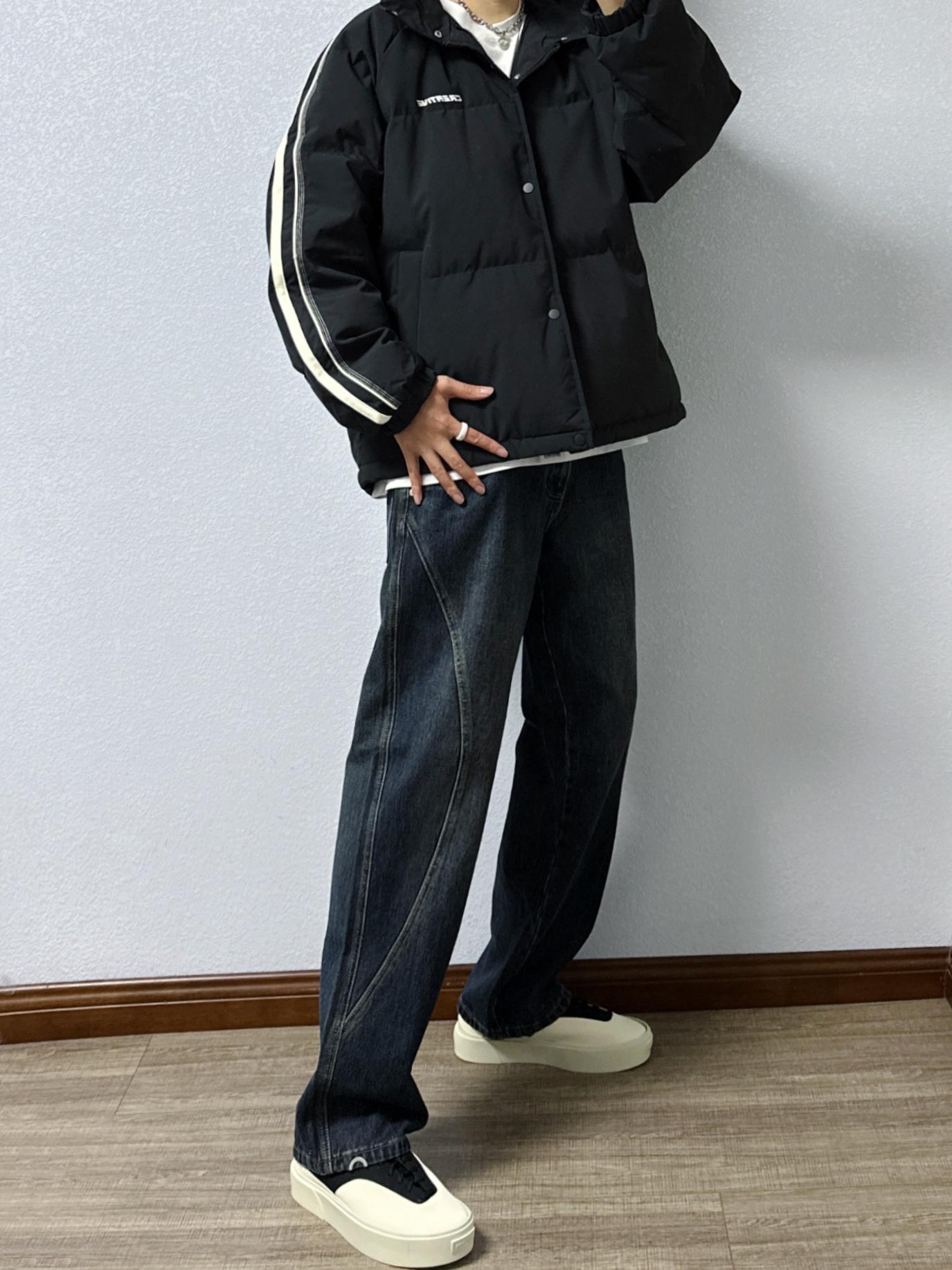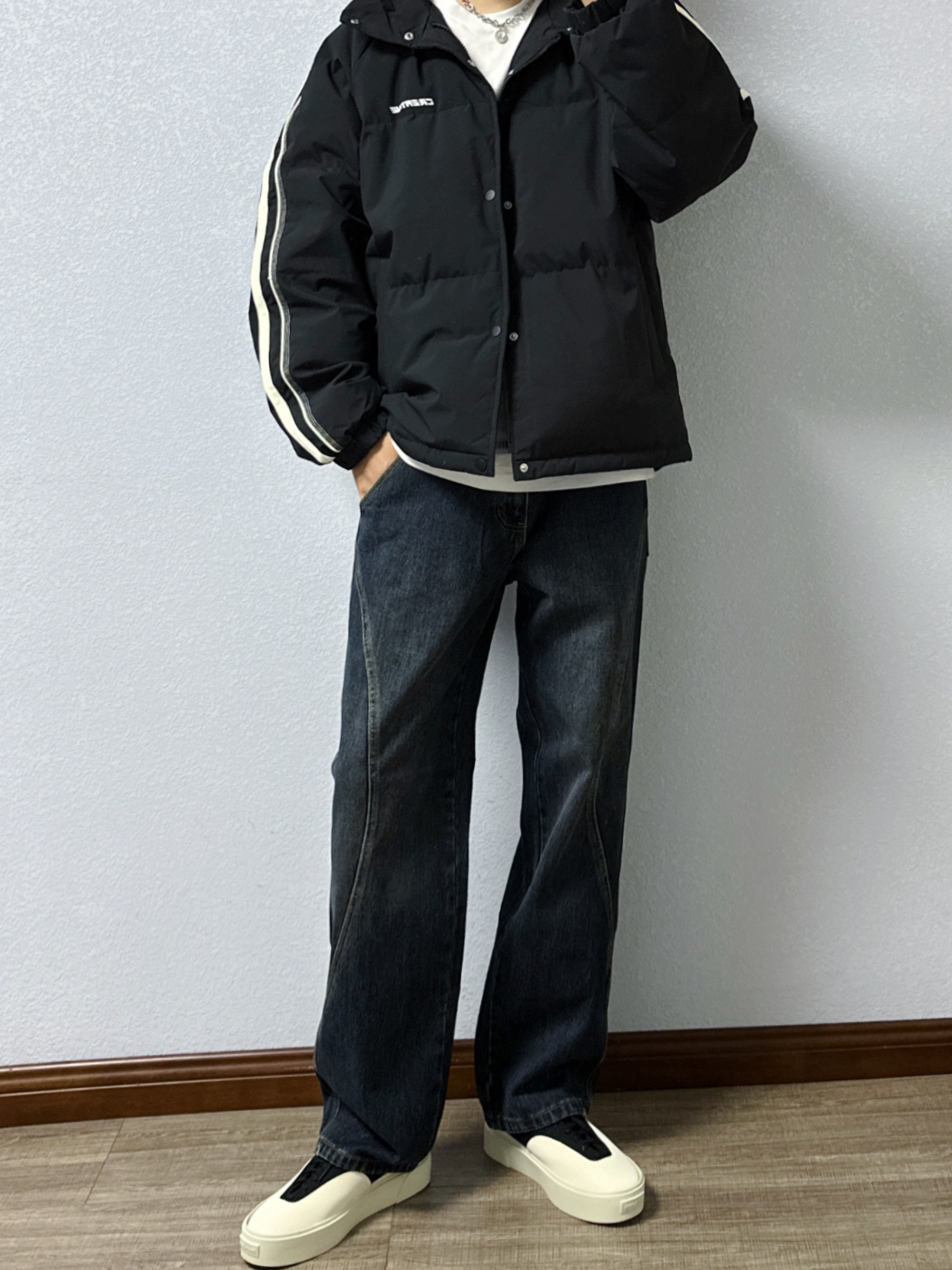 🐳:185 65 宝子们好呀, 天气越来越冷了, 入冬装备也要安排啦, 今天是冬季羽绒服穿搭, 衣服是森马的黑色条纹羽绒服, 经典黑白撞色百搭不挑人, 上身宽松但不臃肿, 搭配简单白T和蓝色做旧牛仔裤, 鞋子是EQLZ的黑白配色板鞋, 秋冬氛围感拿捏啦~