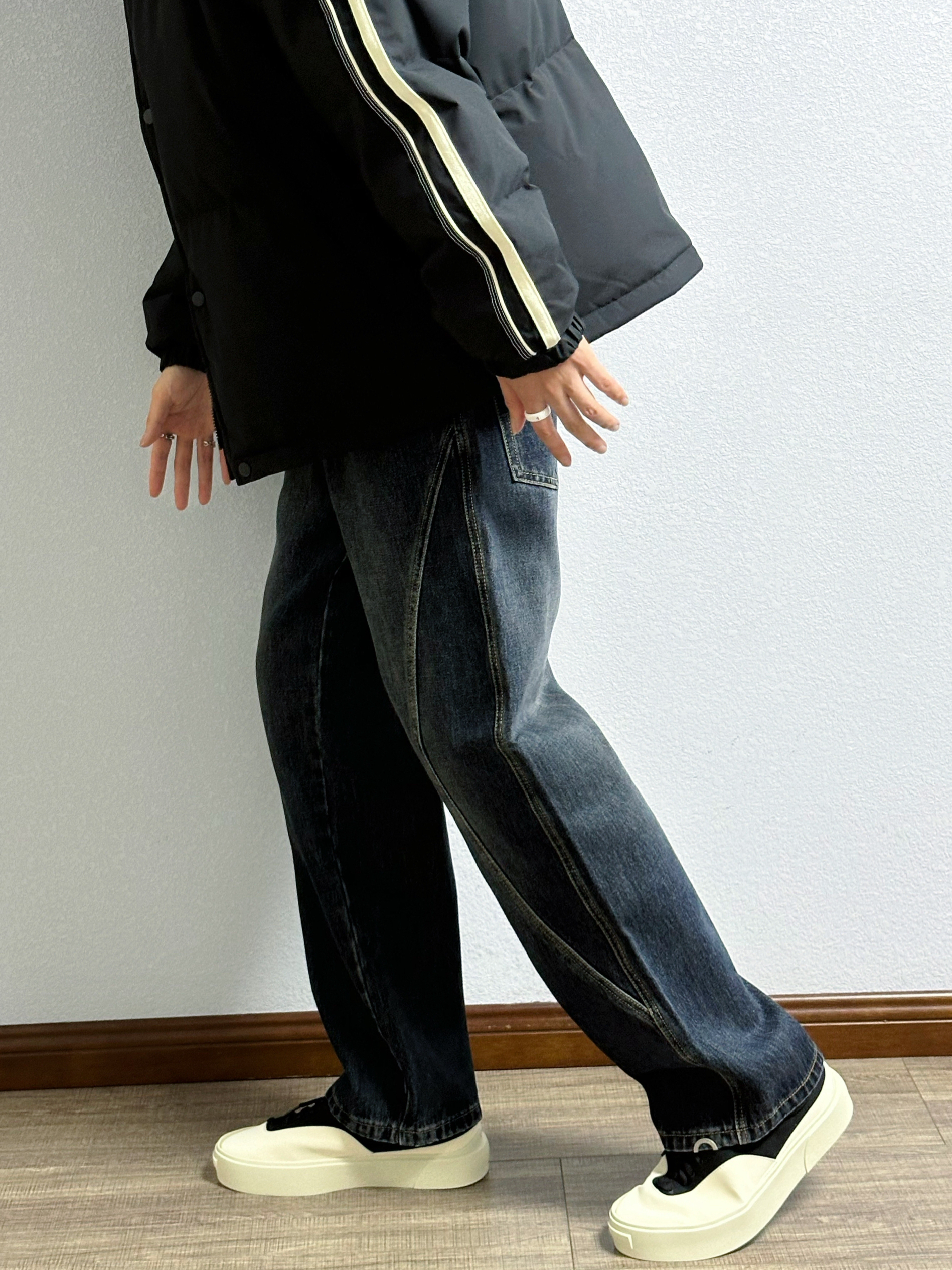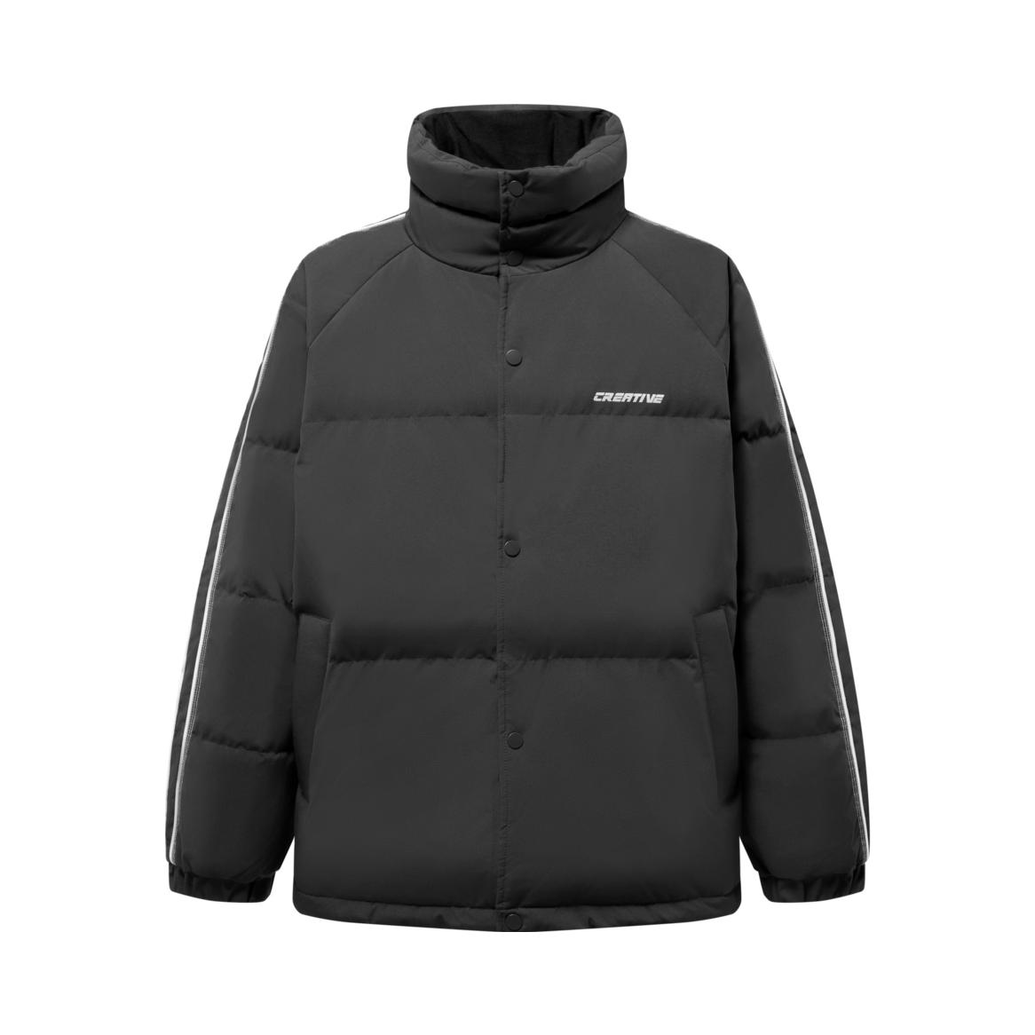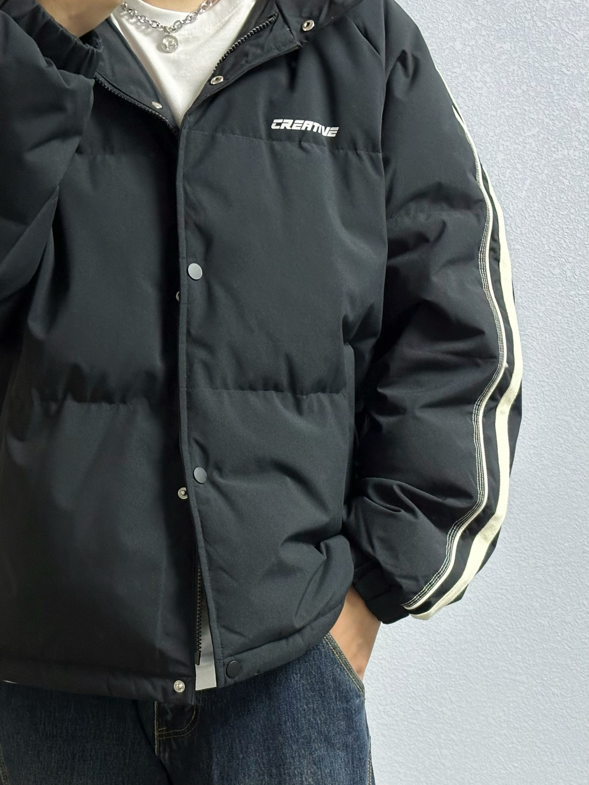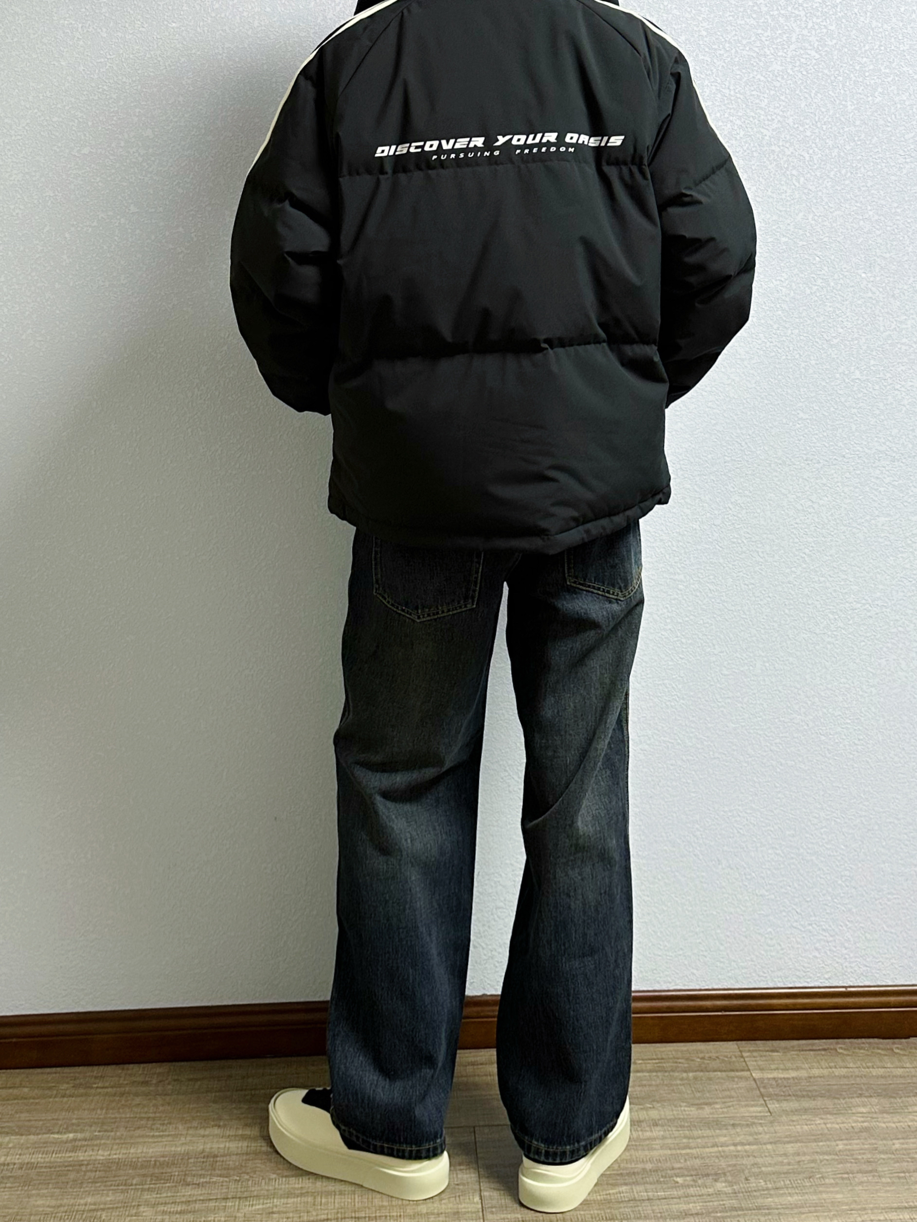 🐳:185 65 宝子们好呀, 天气越来越冷了, 入冬装备也要安排啦, 今天是冬季羽绒服穿搭, 衣服是森马的黑色条纹羽绒服, 经典黑白撞色百搭不挑人, 上身宽松但不臃肿, 搭配简单白T和蓝色做旧牛仔裤, 鞋子是EQLZ的黑白配色板鞋, 秋冬氛围感拿捏啦~