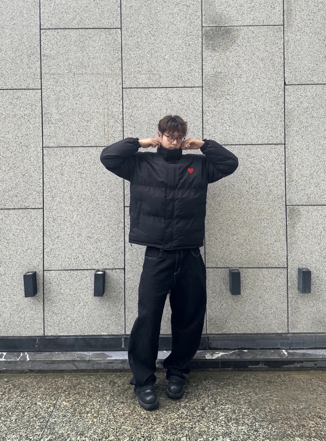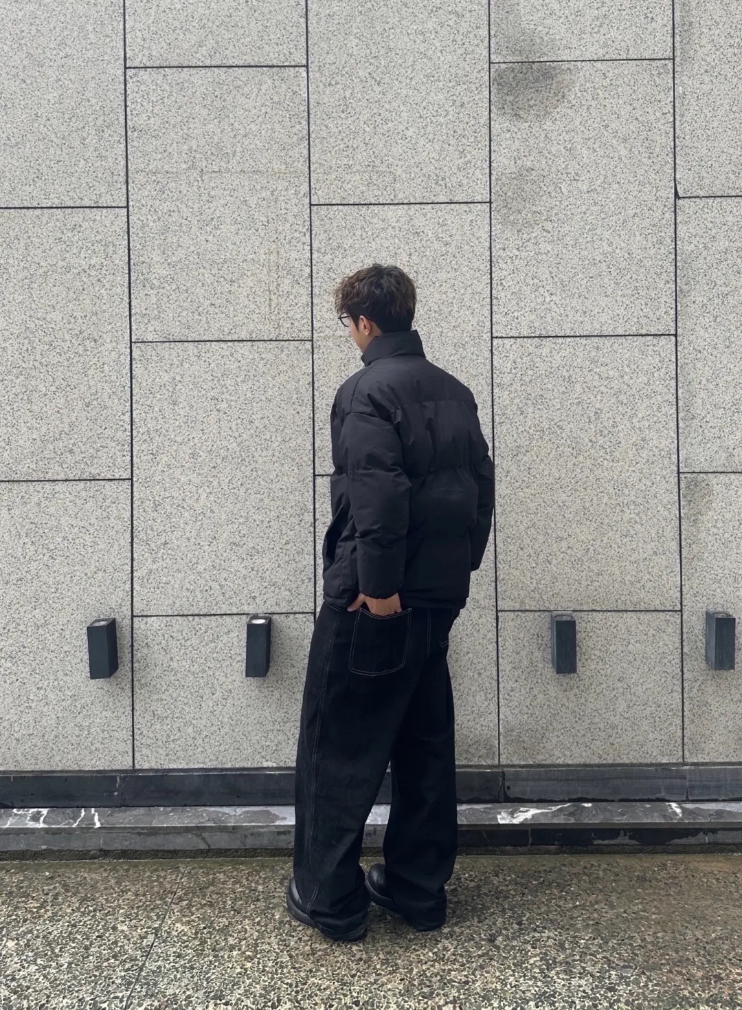 今天一见黑色短款棉服搭配一条黑色阔腿牛仔裤,保暖的同时,看起来高级而且有调性,内搭选择了白色,整体看着不仅保暖舒适而还简约帅气!