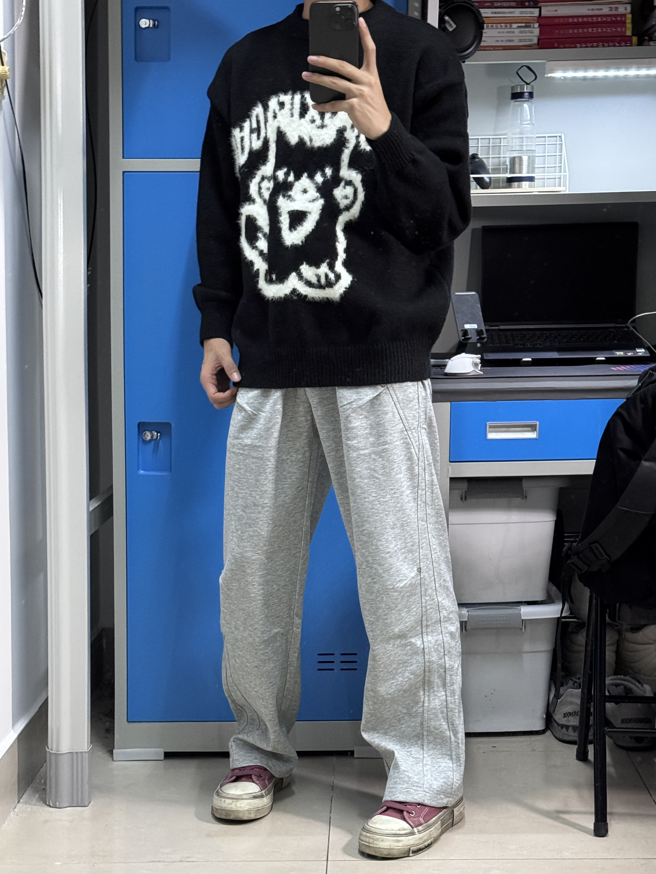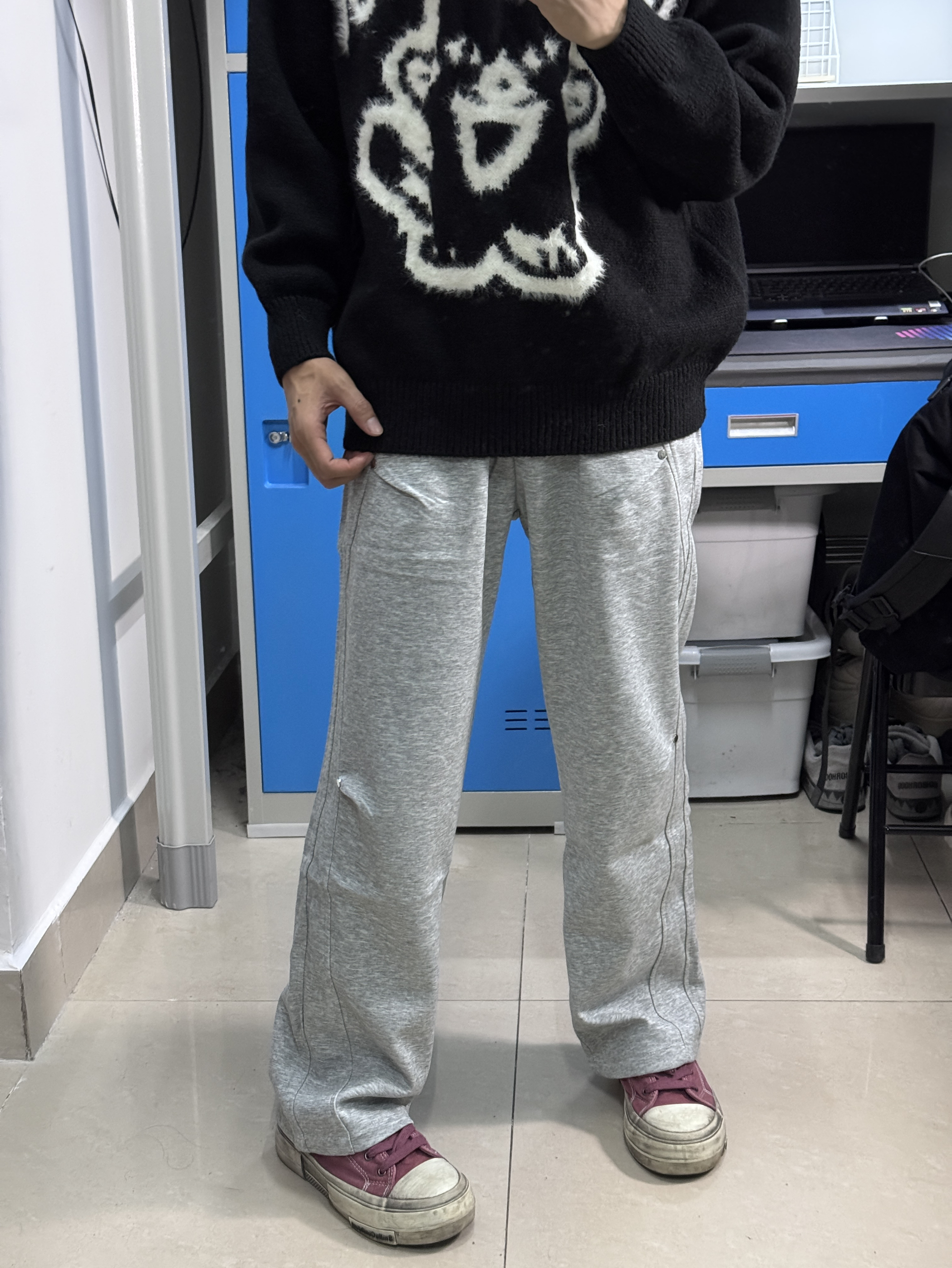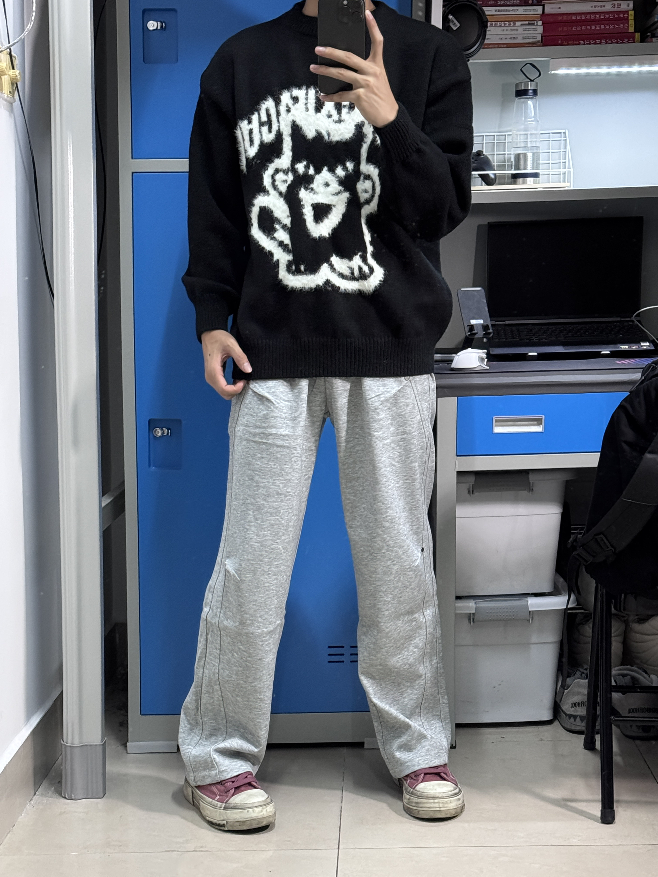 👔我上身的是一件宽松圆领毛衣,衣服上身慵懒松弛很舒服,卡通图案很好看,文艺潮流。 👖裤子搭配一件宽松直筒版型的休闲裤,灰色裤子跟黑色上衣很搭,校园生活这样穿很有氛围感。