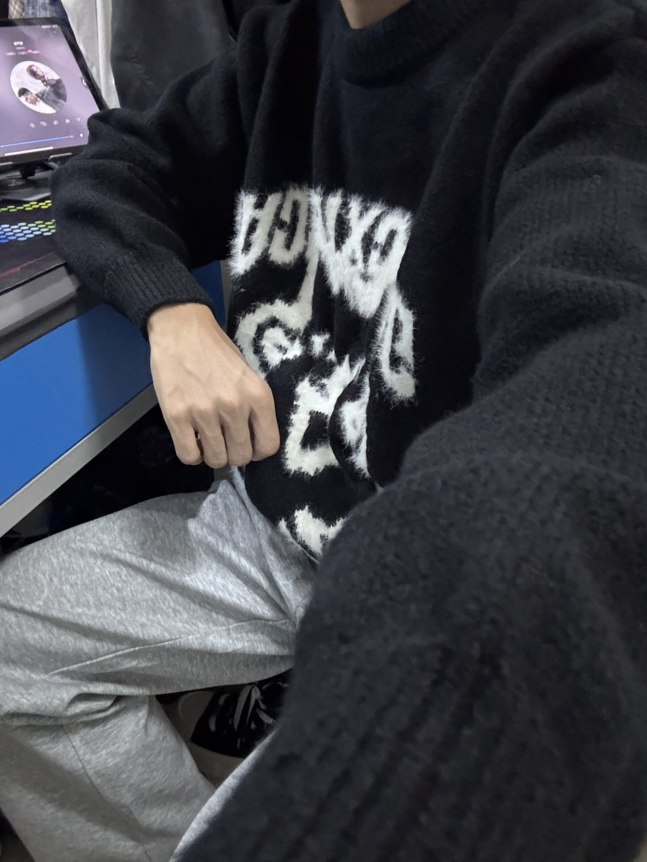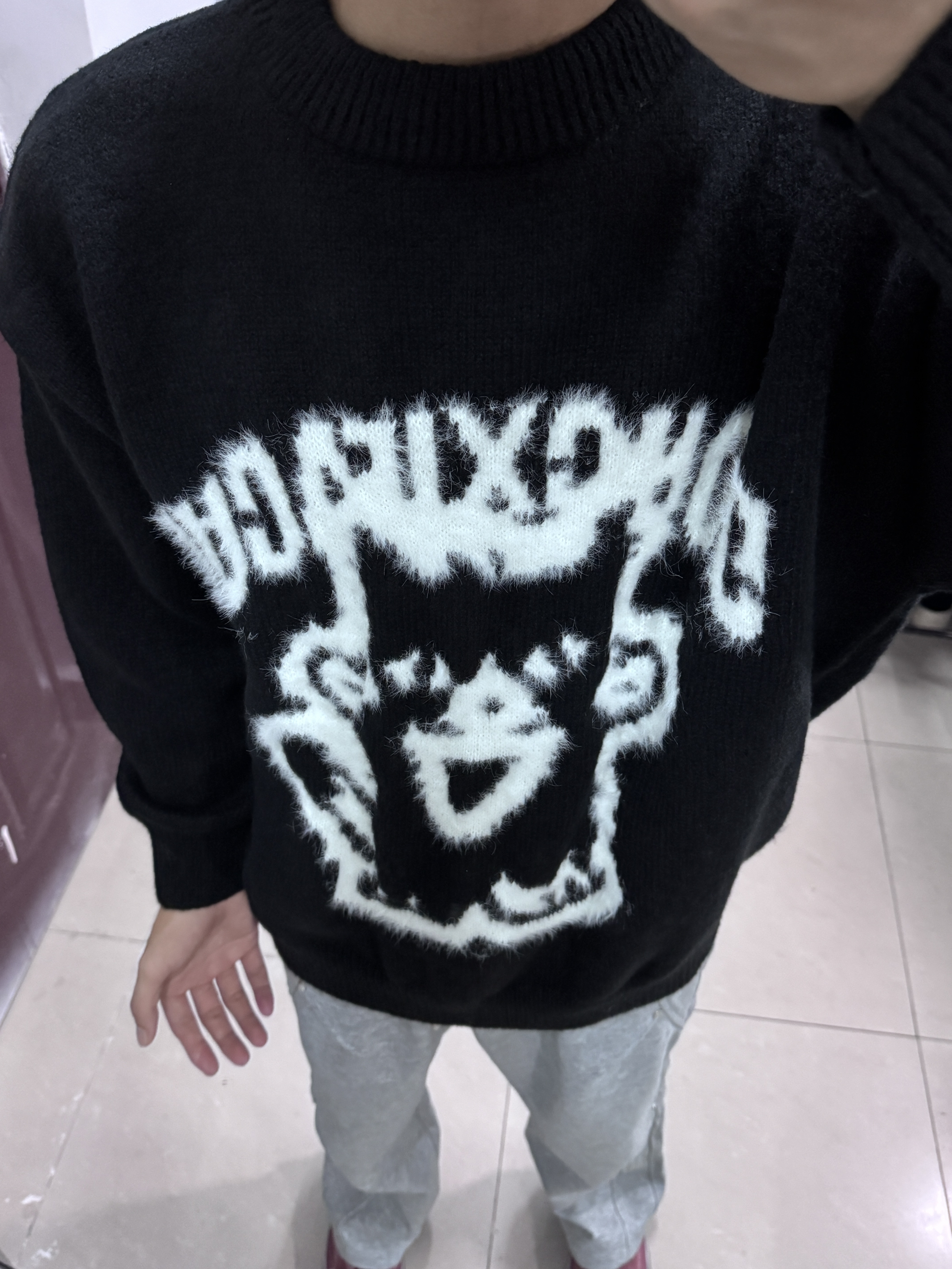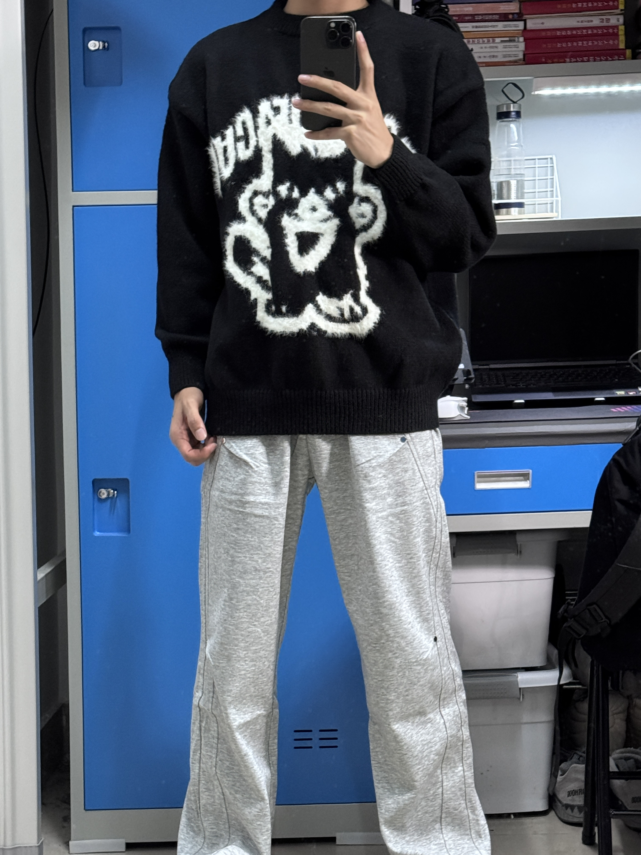 👔我上身的是一件宽松圆领毛衣,衣服上身慵懒松弛很舒服,卡通图案很好看,文艺潮流。 👖裤子搭配一件宽松直筒版型的休闲裤,灰色裤子跟黑色上衣很搭,校园生活这样穿很有氛围感。