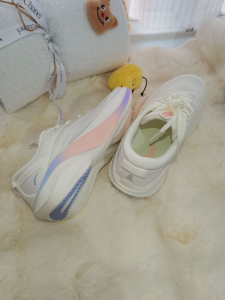 这双鞋主打白色,鞋底的粉色、紫色、蓝色渐变让这双👟充满青春活力💗。鞋面采用网状构造,确保了卓越的透气性,让运动中的双脚也能享受清新与舒适💐。鞋底柔软且富有弹性,无论是长时间的漫步还是高强度的运动,都能提供出色的缓震效果🌟。 总的来说,这双鞋不仅轻盈如羽、透气性佳,穿上它既显青春活力又轻盈舒适。✨
