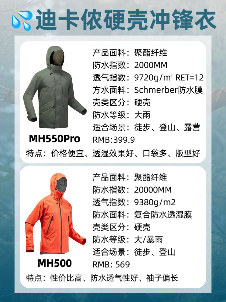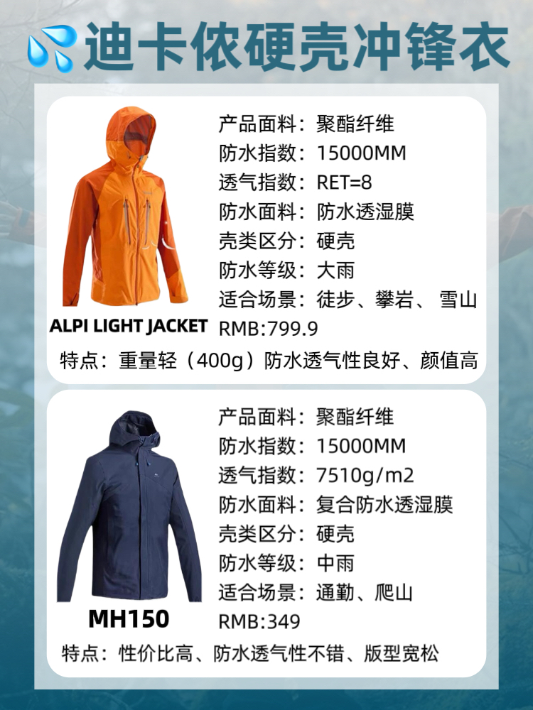 Hey小伙伴们~今天要跟大家聊聊我这个户外小白是如何秒变迪卡侬战士的!如果你是户外小白,又想get一件靠谱又实用的冲锋衣,答应我,直接冲迪卡侬好吗?虽然价格逐年攀升,但品质依然杠杠滴! 以下是我精心整理的4款迪卡侬硬壳冲锋衣,帮你精准定位,少走弯路! 1️⃣ MH150 适合日常通勤与低海拔徒步,都市与自然间自由切换!无论是城市街头还是三山五岳,它都能hold住!但别指望它陪你征服雪山或高速骑行...