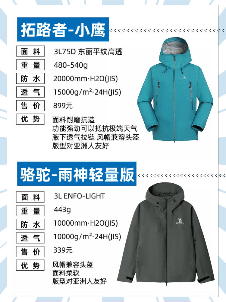 本篇笔记关联了【Angelababy同款】Camel/骆驼 雨神系列进藏暴雨级防暴雨防紫外线防风防水三合一透汽轻量化连帽单冲硬壳羽绒内胆冲锋衣 A13CATR157 枪灰/单冲、【林更新同款】拓路者 小鹰 暴雨防风防水腋下拉链压胶东丽硬壳单冲冲锋衣 XHW301100 松石蓝、【王一博同款】Patagonia/巴塔哥尼亚 Torrentshell 3L H2No尼龙面料日潮黑曜石梅户外远足软壳防水抗风防风雨防寒防紫外线拼色拉链连帽硬壳轻量冲锋衣 男女同款 85241 潮汐蓝等商品,为用户提供真实的使用体验和购买参考。