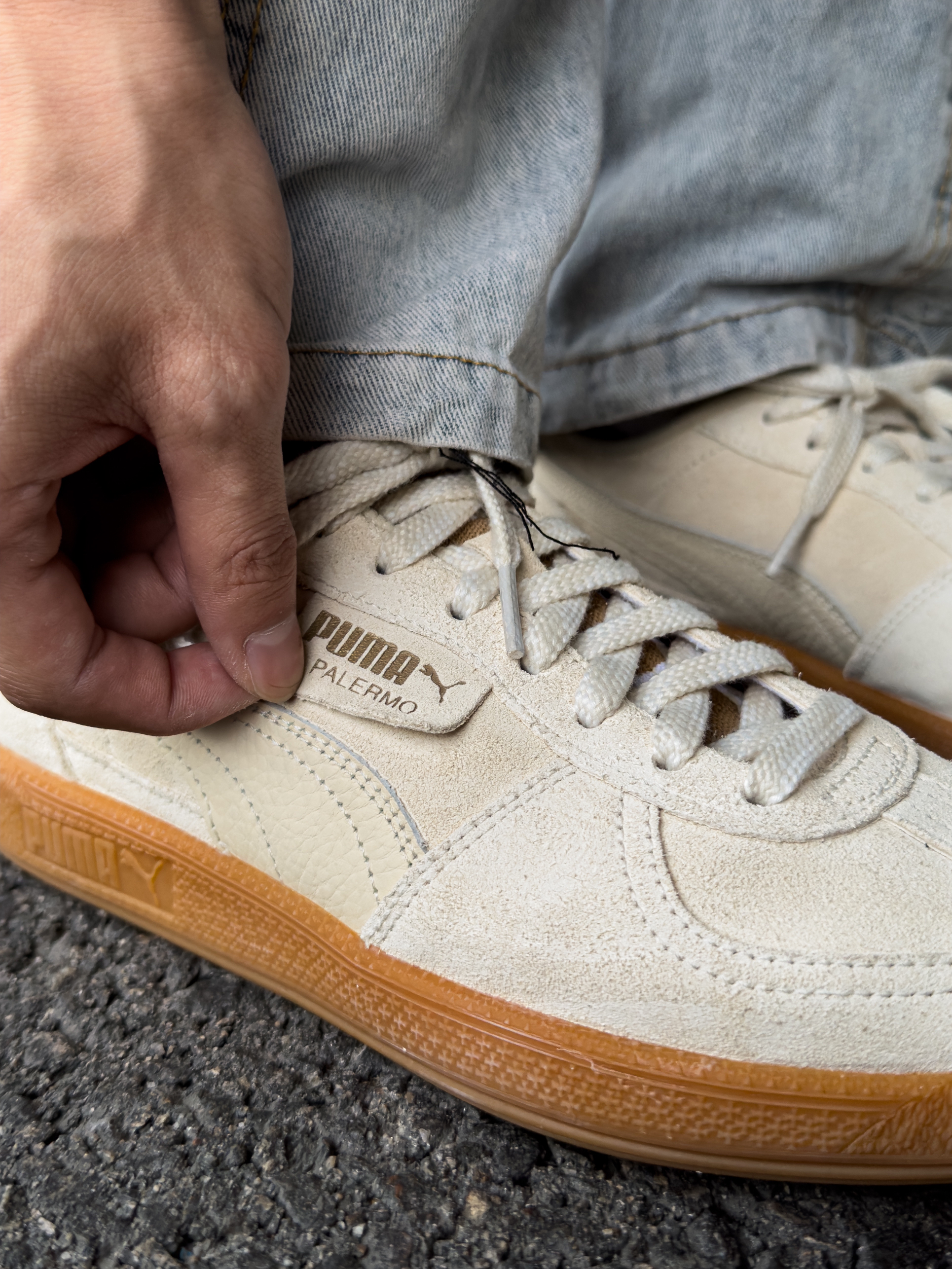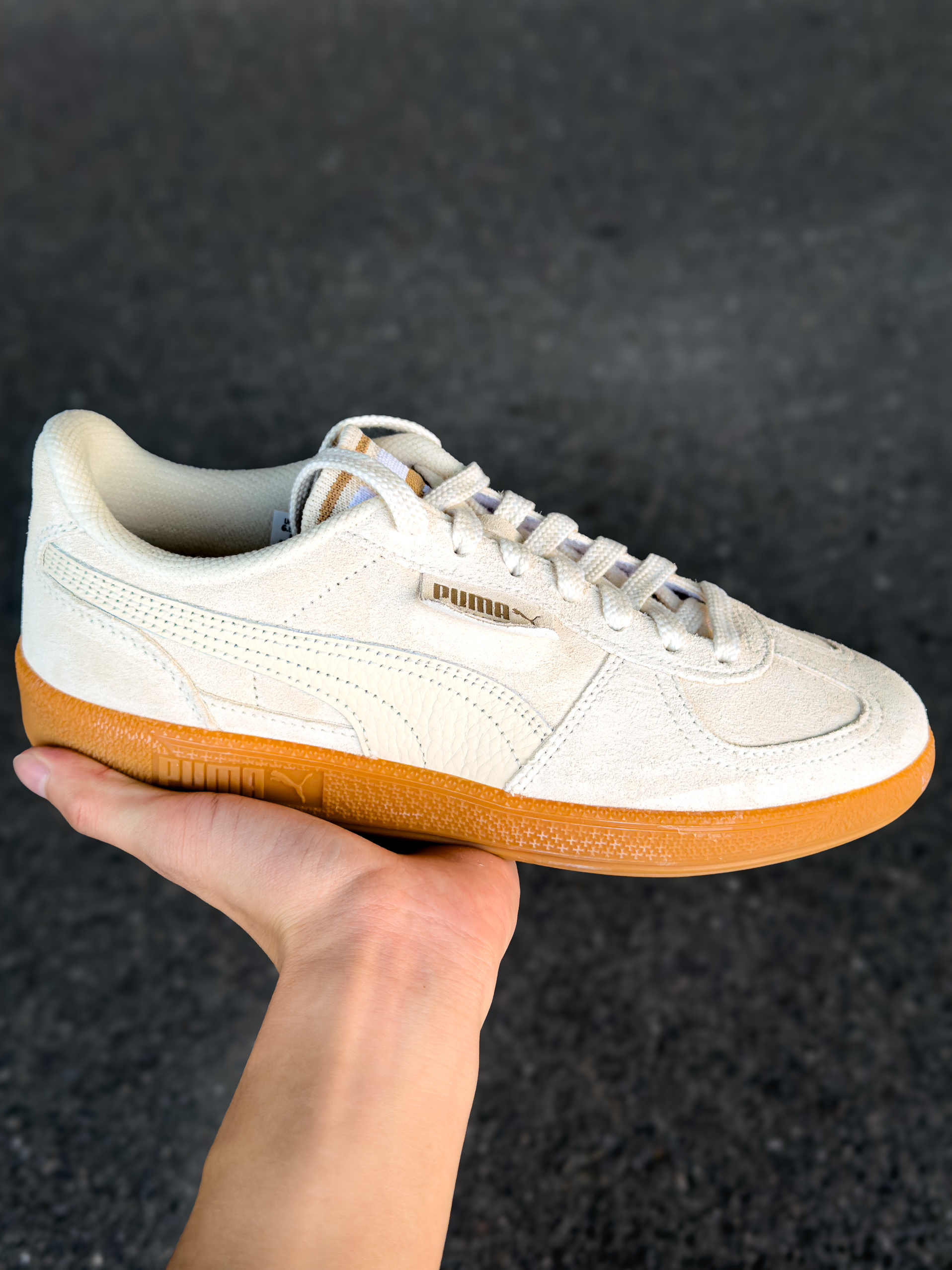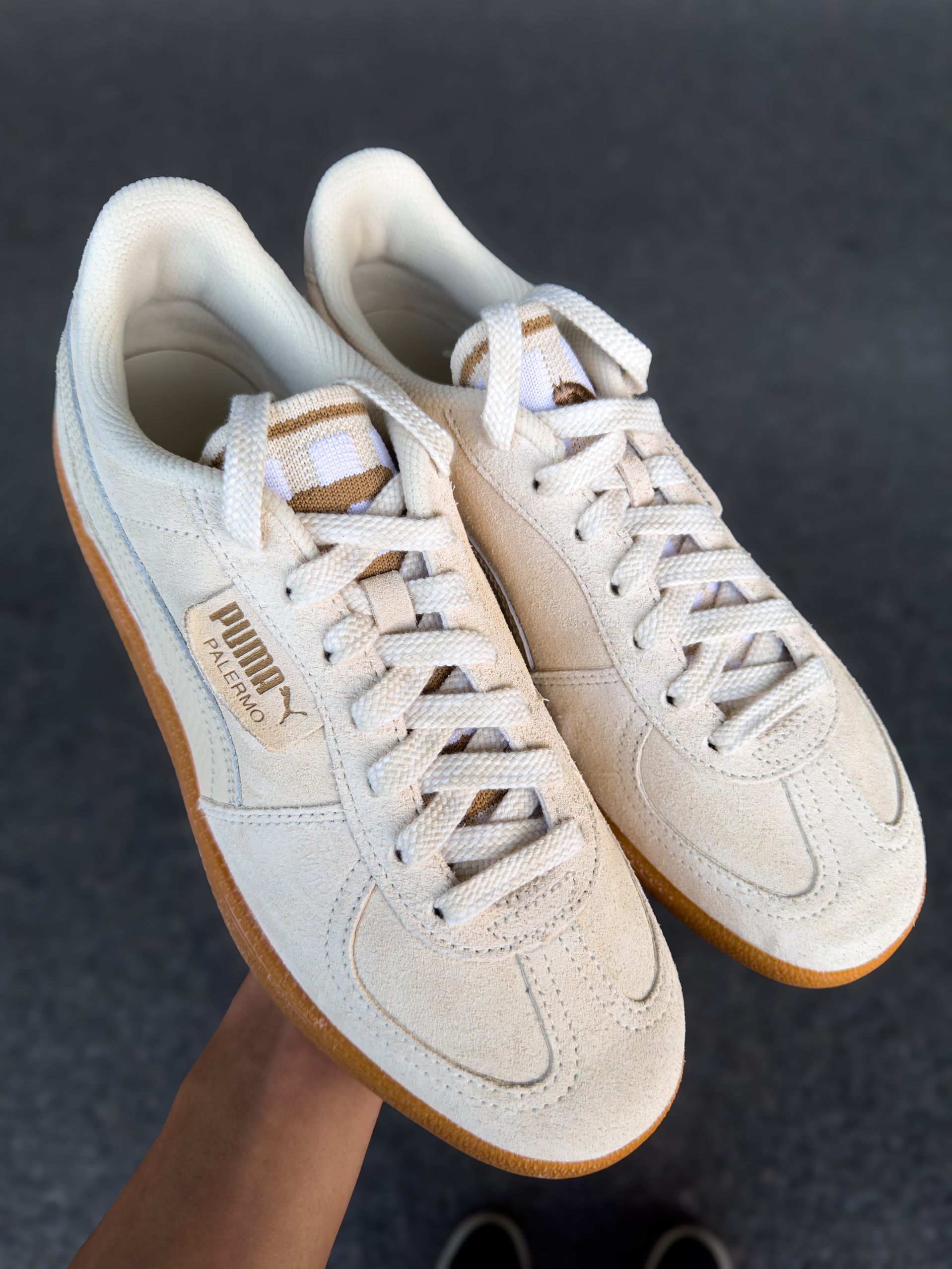 Puma palermo 是当季新品的德训板鞋 杏色德训经典 简约又百搭 鞋面两种皮革质感 T字头 鞋侧设计了一个突出品牌调格设计 鞋底采用了硅胶底 防滑耐磨 穿上脚也不会觉得很硬 鞋垫很有软 穿起来会很舒服