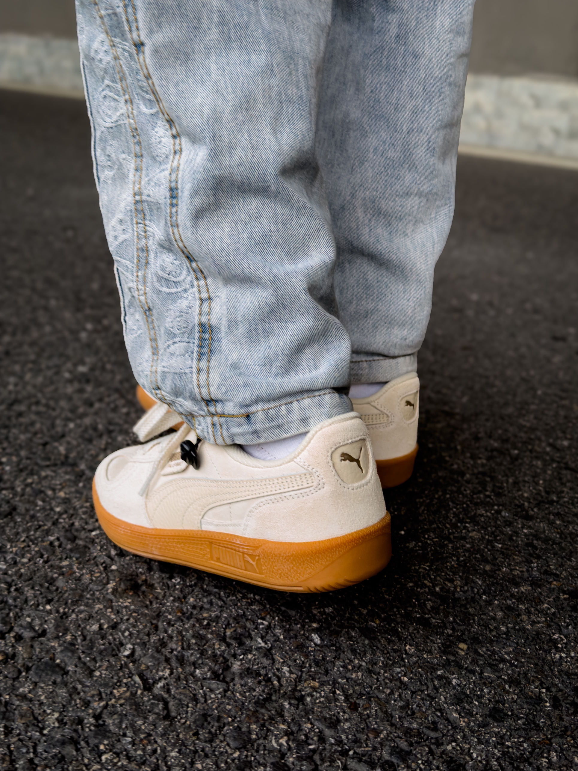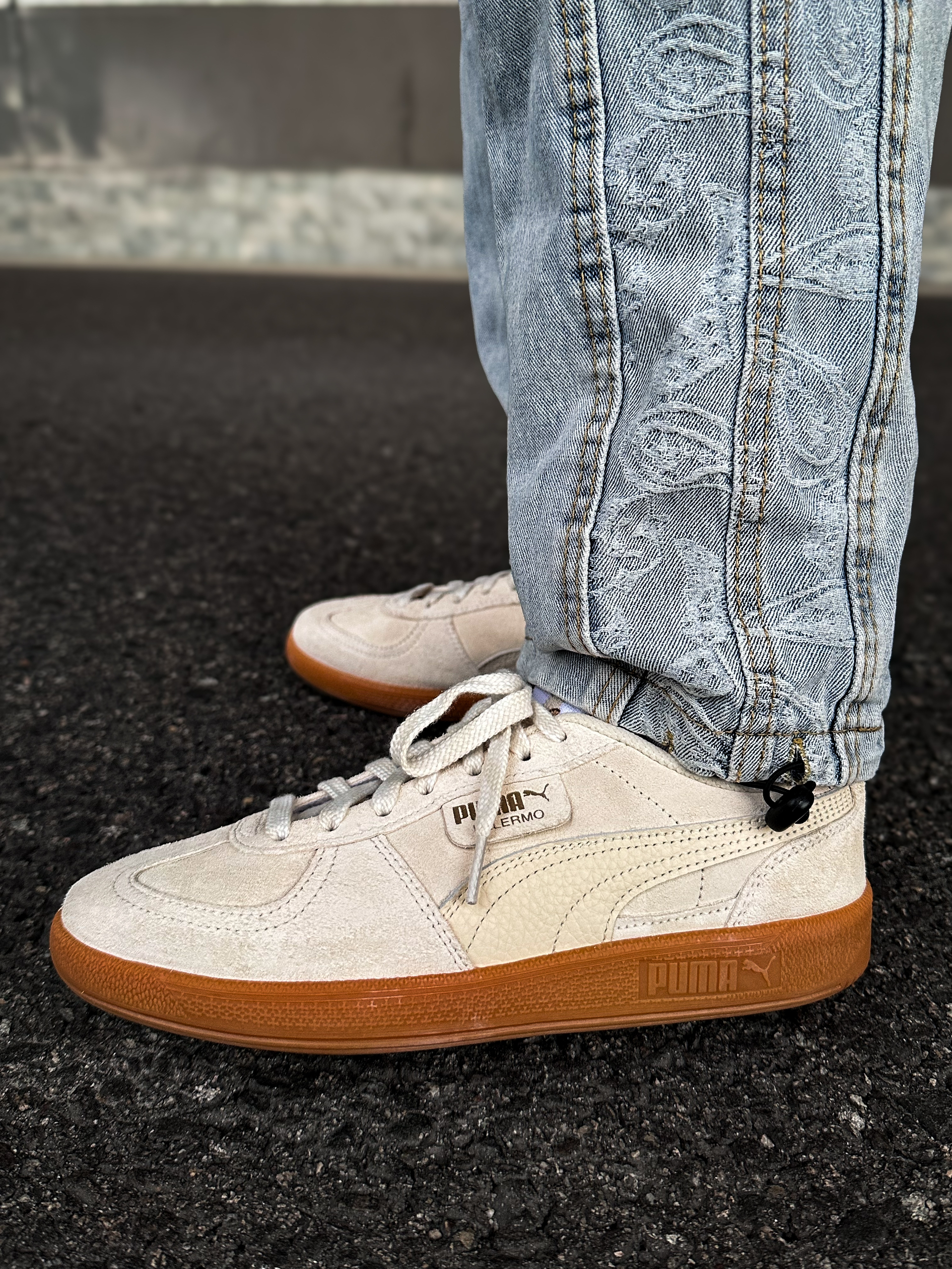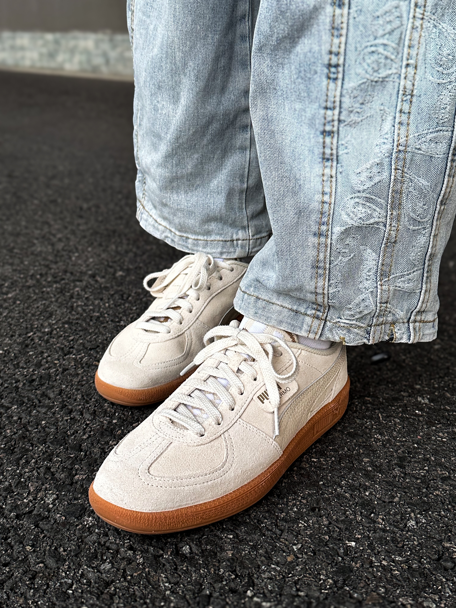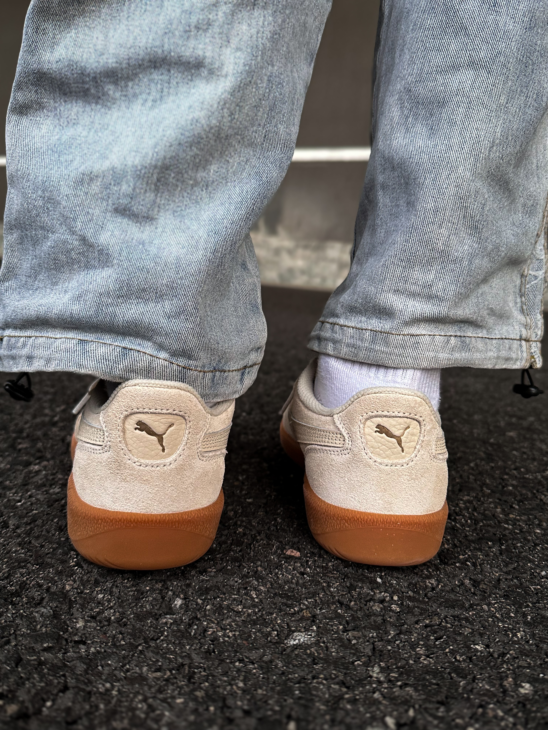 Puma palermo 是当季新品的德训板鞋 杏色德训经典 简约又百搭 鞋面两种皮革质感 T字头 鞋侧设计了一个突出品牌调格设计 鞋底采用了硅胶底 防滑耐磨 穿上脚也不会觉得很硬 鞋垫很有软 穿起来会很舒服