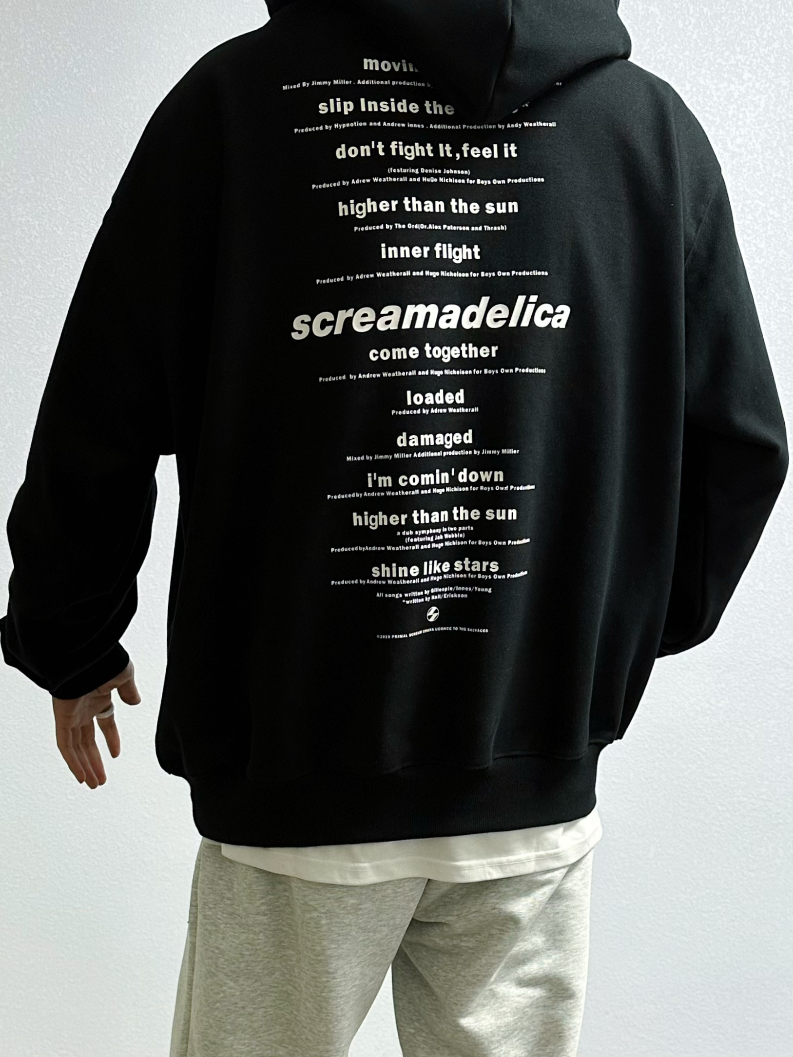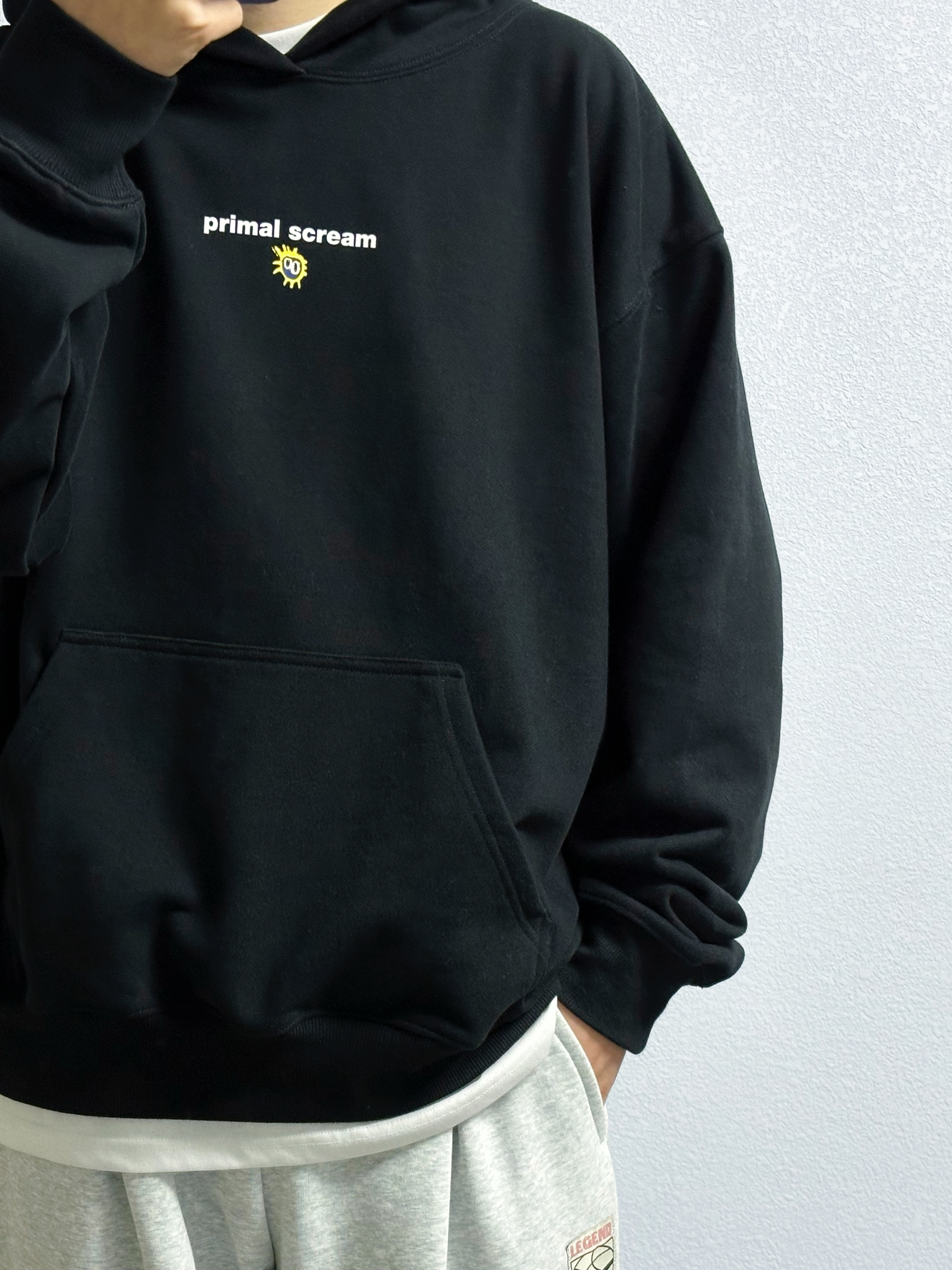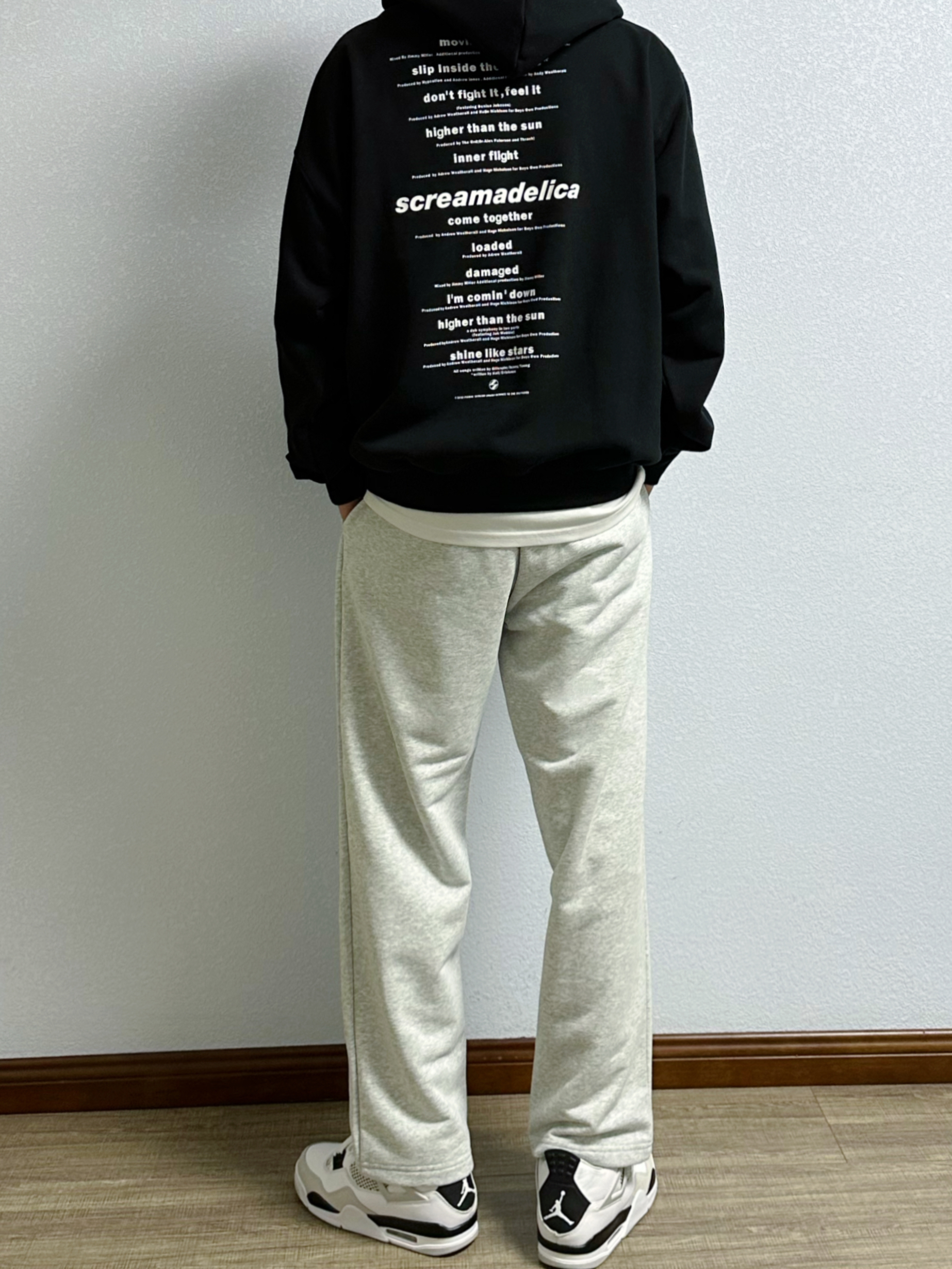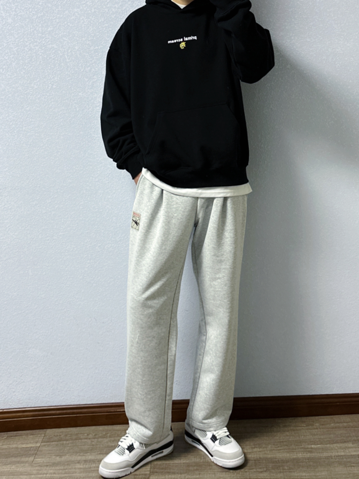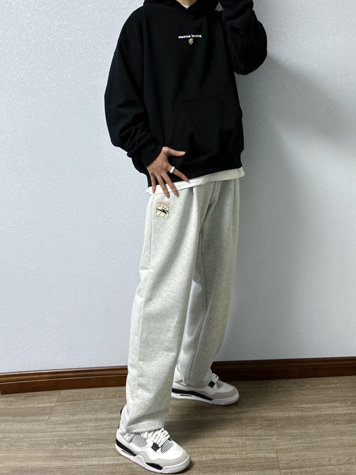 🐳:185 65 宝子们好呀, 每当出门不知道穿什么颜色的时候, 黑白灰怎么都不会出错, 今天是秋冬休闲风穿搭, 衣服是THE SALVAGES FASHION CLUB的黑色连帽卫衣, 版型宽松百搭不挑人, 简约字母印花高级感满满, 搭配uzis的浅灰色直筒卫裤, 白色运动长袜搭配黑白配色球鞋, 对简单干净的穿搭没有抵抗力~
