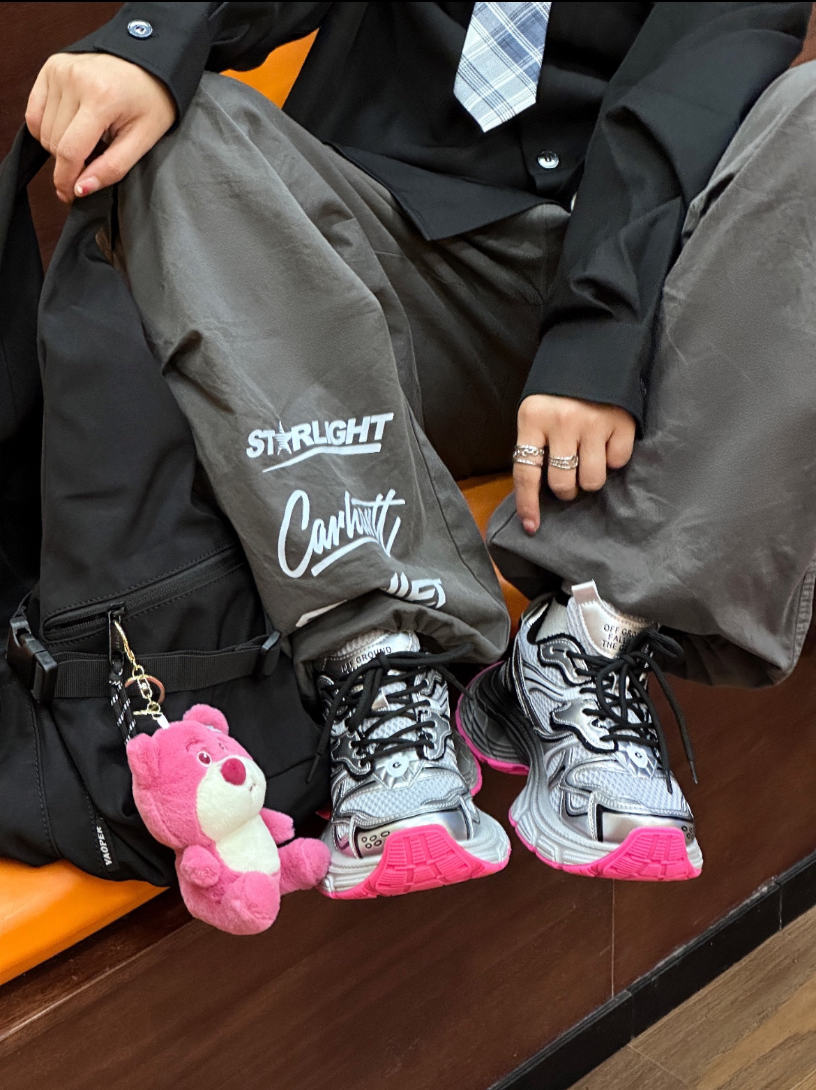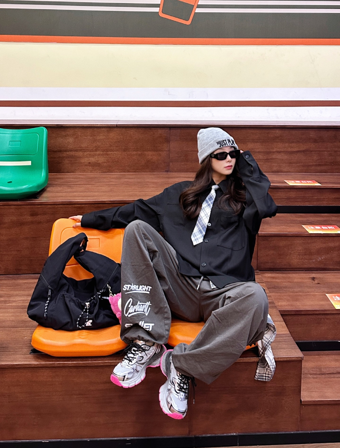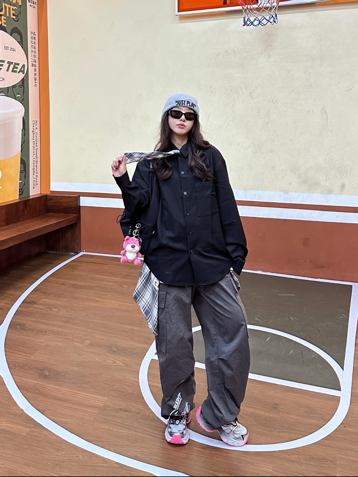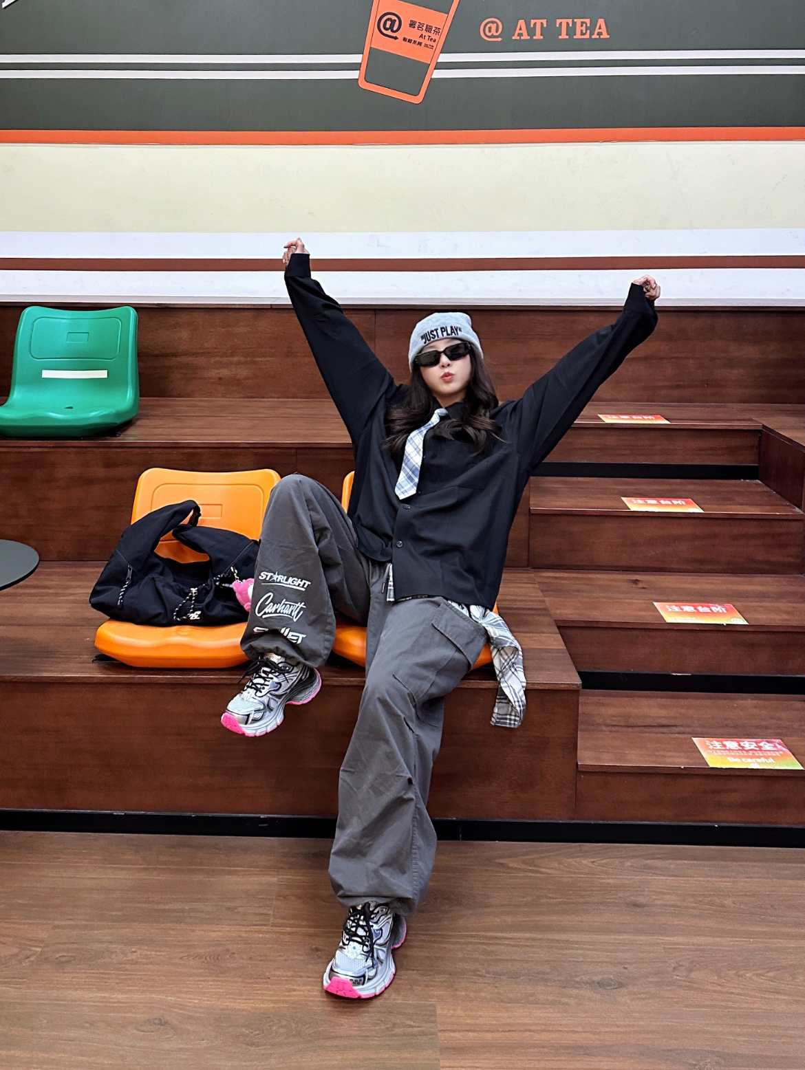 简约设计的宽松黑衬衣太帅了 很中性风!!日常通勤都能驾驭的风格 搭配一条领带时尚又有型 潮酷的 当外套或当内搭叠穿毛衣都好看 搭配工装裤和老爹鞋更酷飒0时髦出街 穿的银色和粉色鞋底拼接的老爹鞋 流畅的鞋面和独特的厚实鞋底设计 很有时尚张力上脚显腿长又好看 无论是运动还是日常出街都百搭