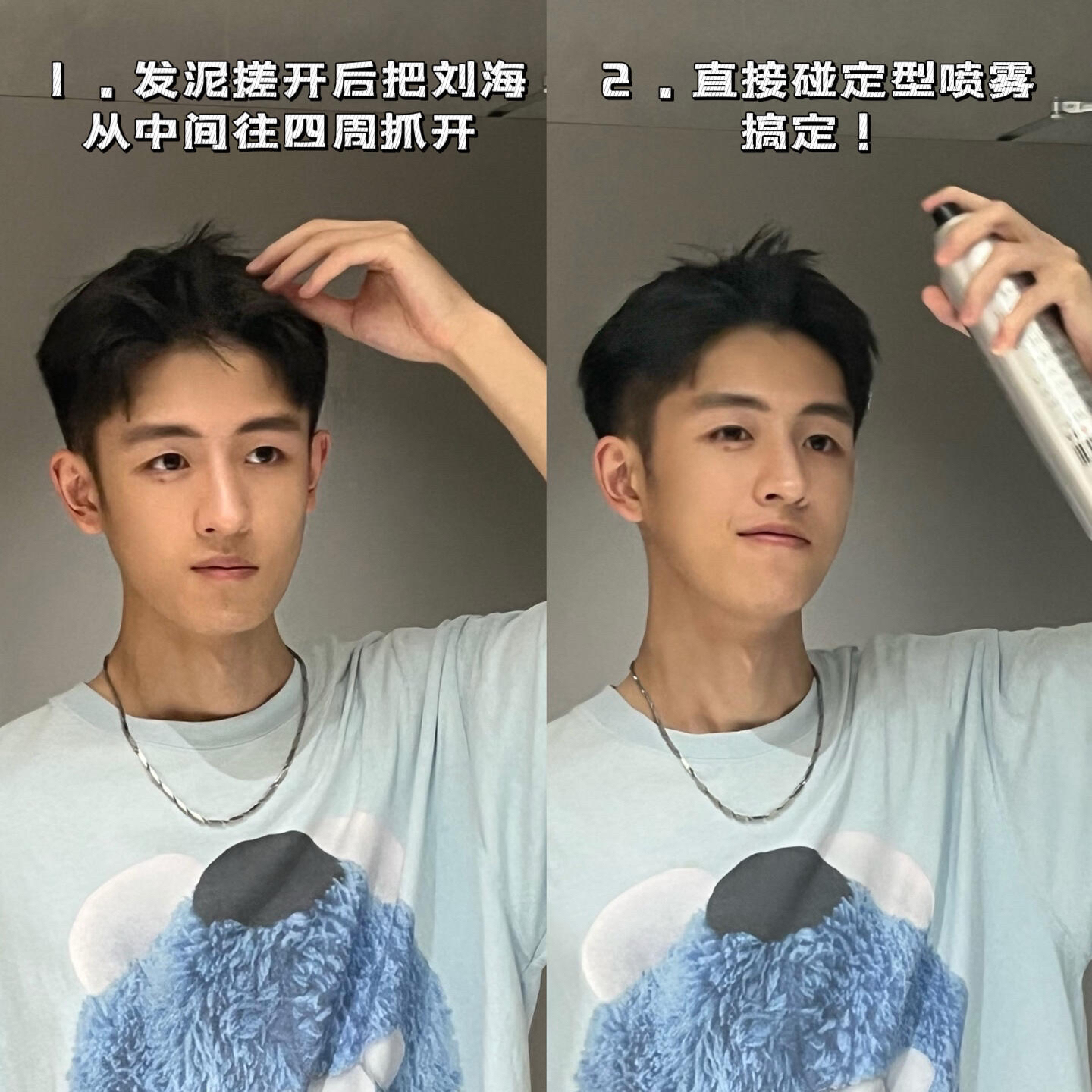 如果你还是觉得太难了,别划走!刚说完迈出第一步做出尝试才会有改变!其实我日常通勤也不会每天花5-10分钟打理头发,下面教大家一个1分钟极速出门的男生简易造型(偷懒版)💤