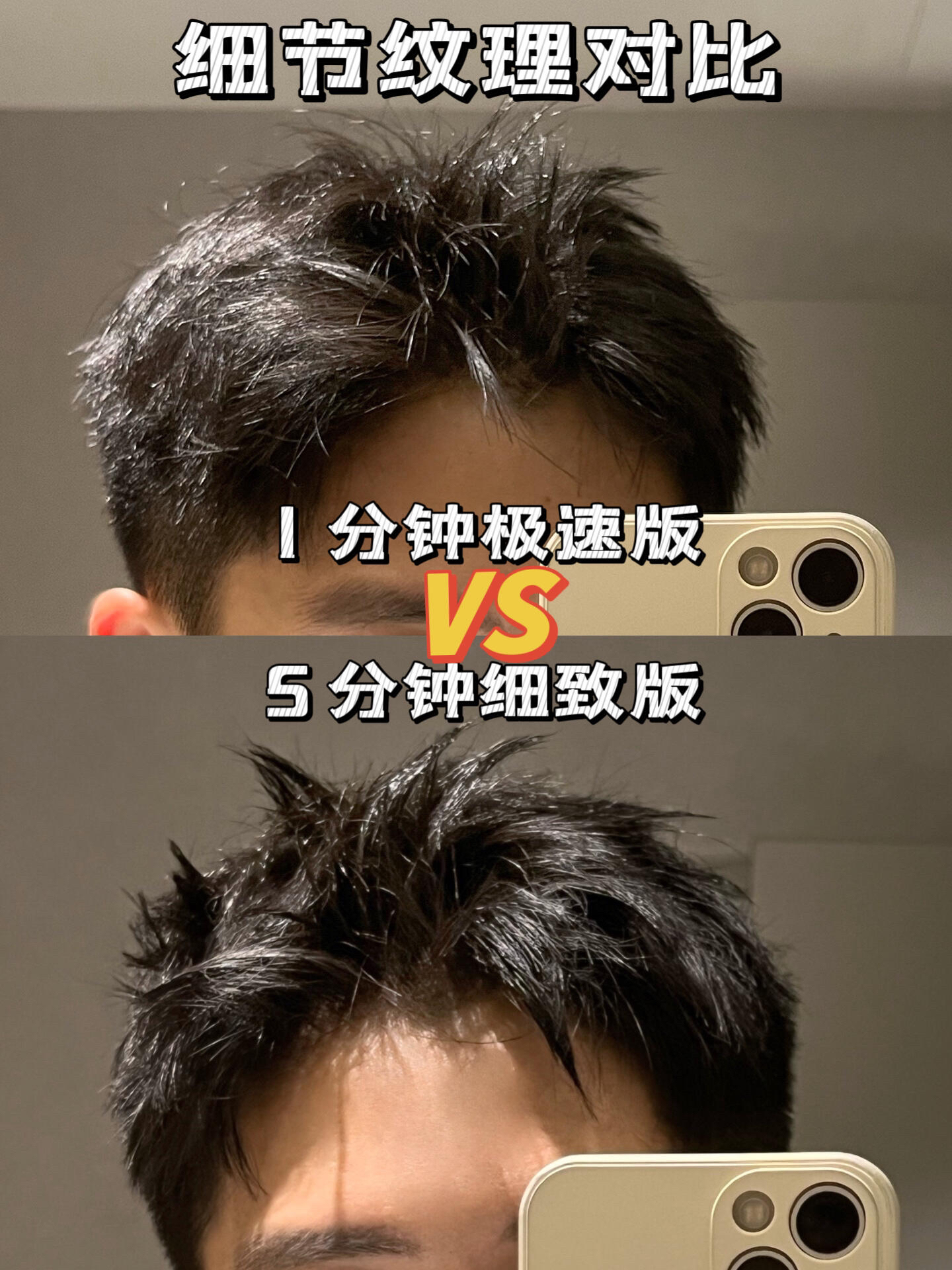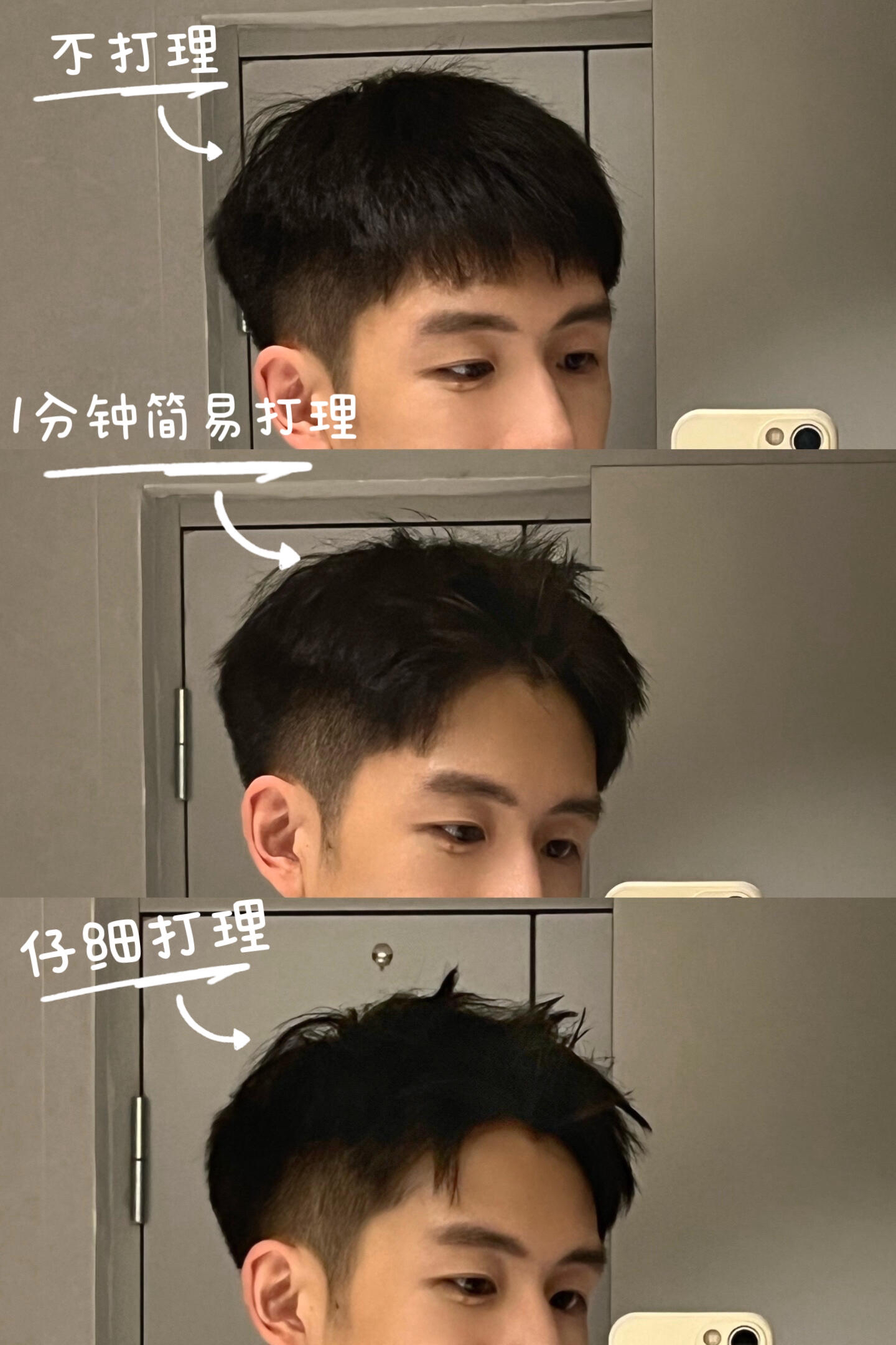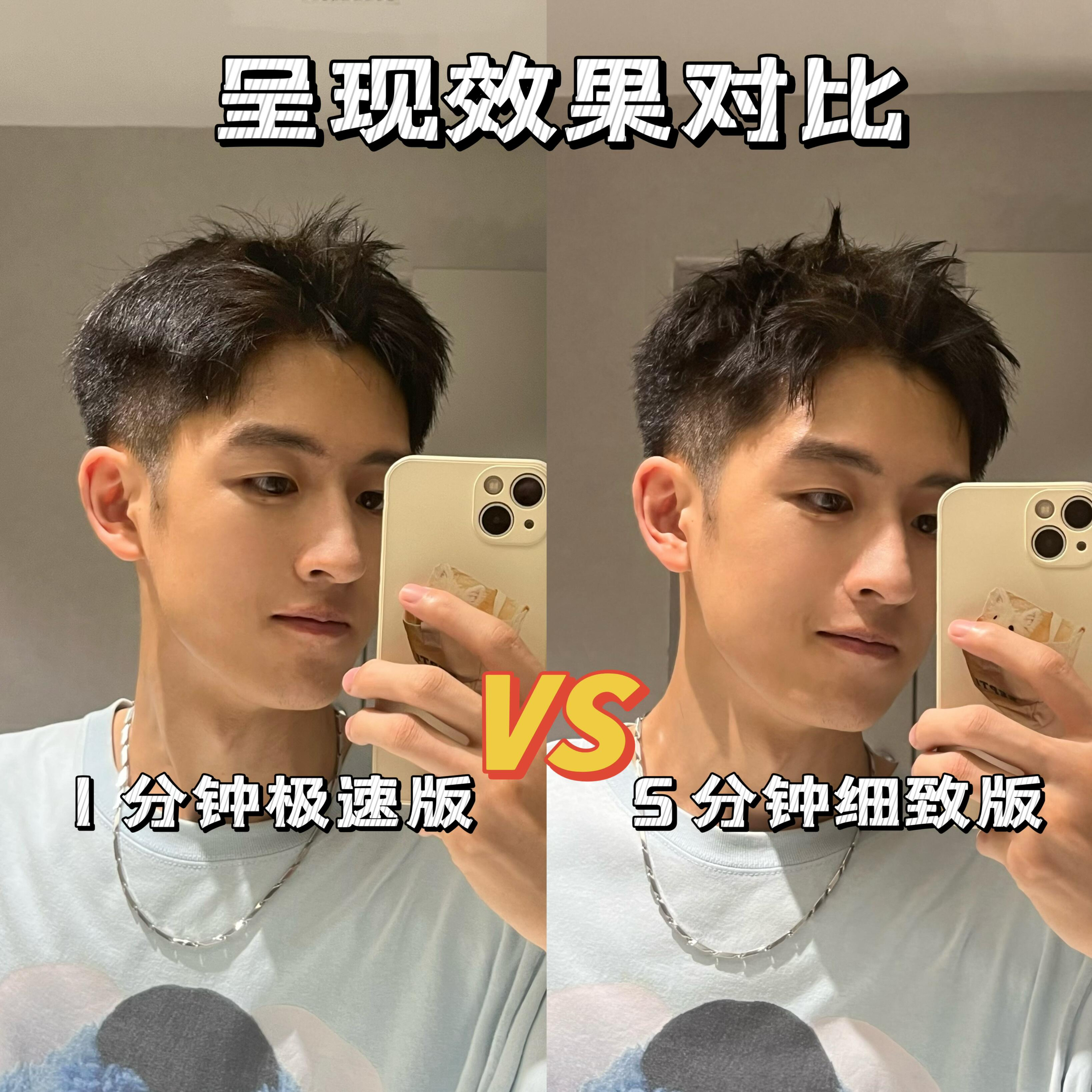 不用考虑每一根发丝的走向同样也可以获得清爽的造型,对比下来其实没有很大的差距,但是和不打理相比整个状态就会有精神很多,对比路人已经是next level了!甚至比正常打理的造型反而多了一些随性和松弛,能看出有打理过的痕迹以及拒绝邋遢才是这个造型的最终要义!