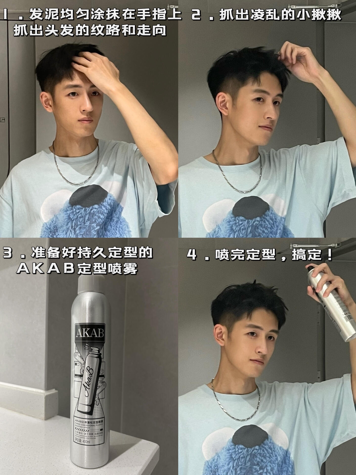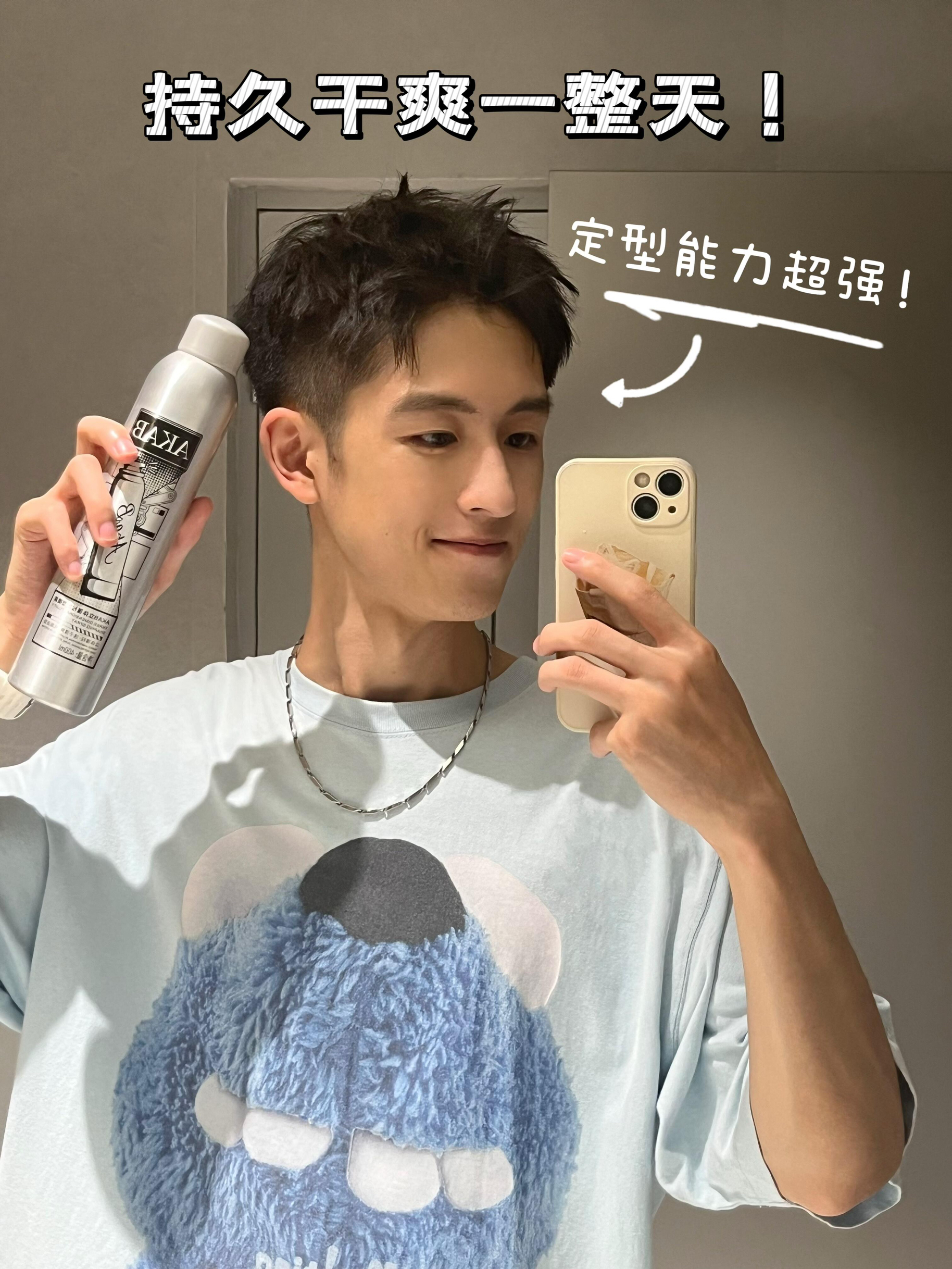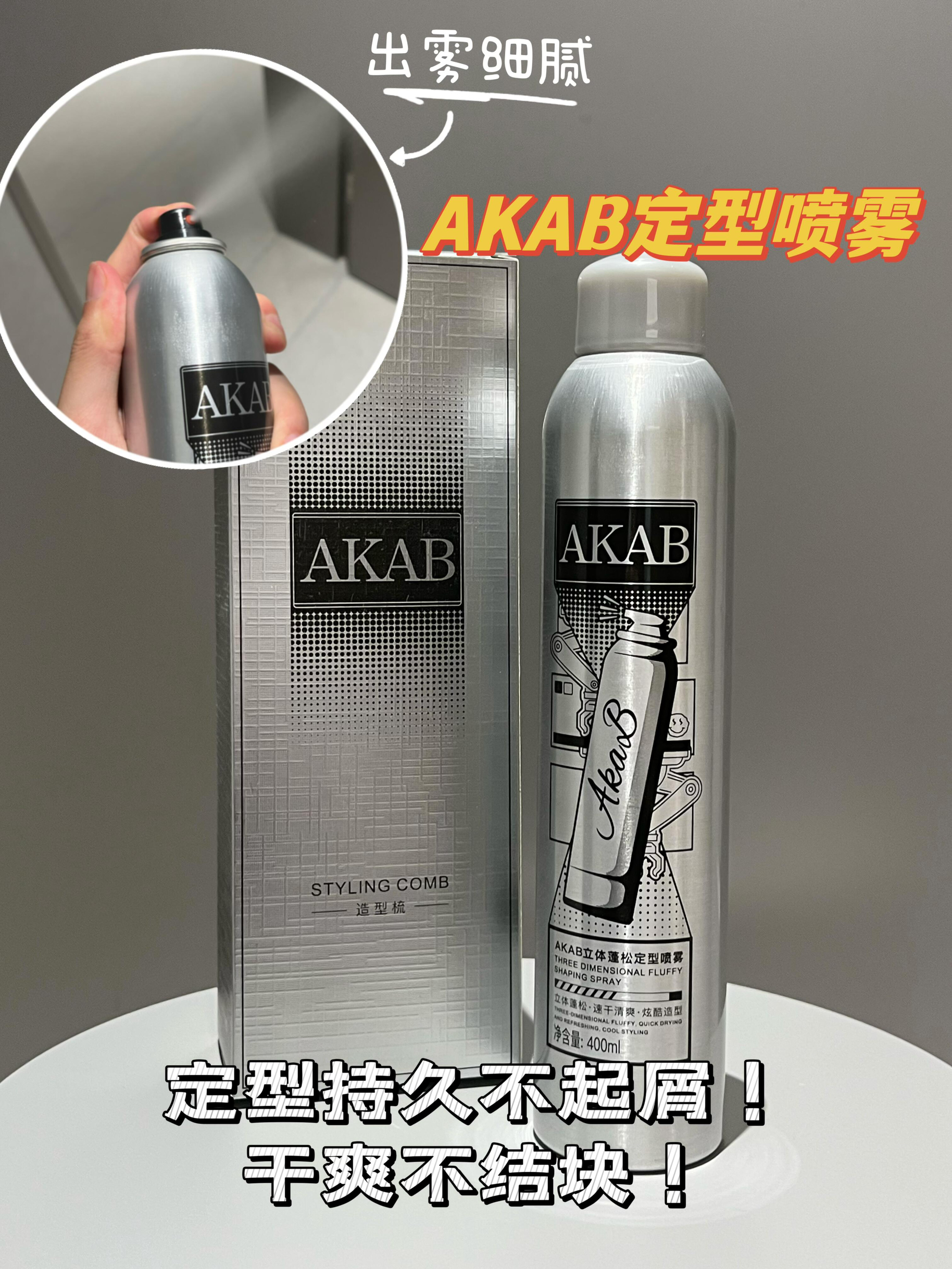 定型喷雾一定要选AKAB定型喷雾这种造型能力强的噢,在离头发20-30cm左右喷洒更均匀,这款定型喷雾喷头出雾细腻,干爽不粘腻,造型能持久一整天,完全不用担心一些定型喷雾有的会结块起白屑的问题!