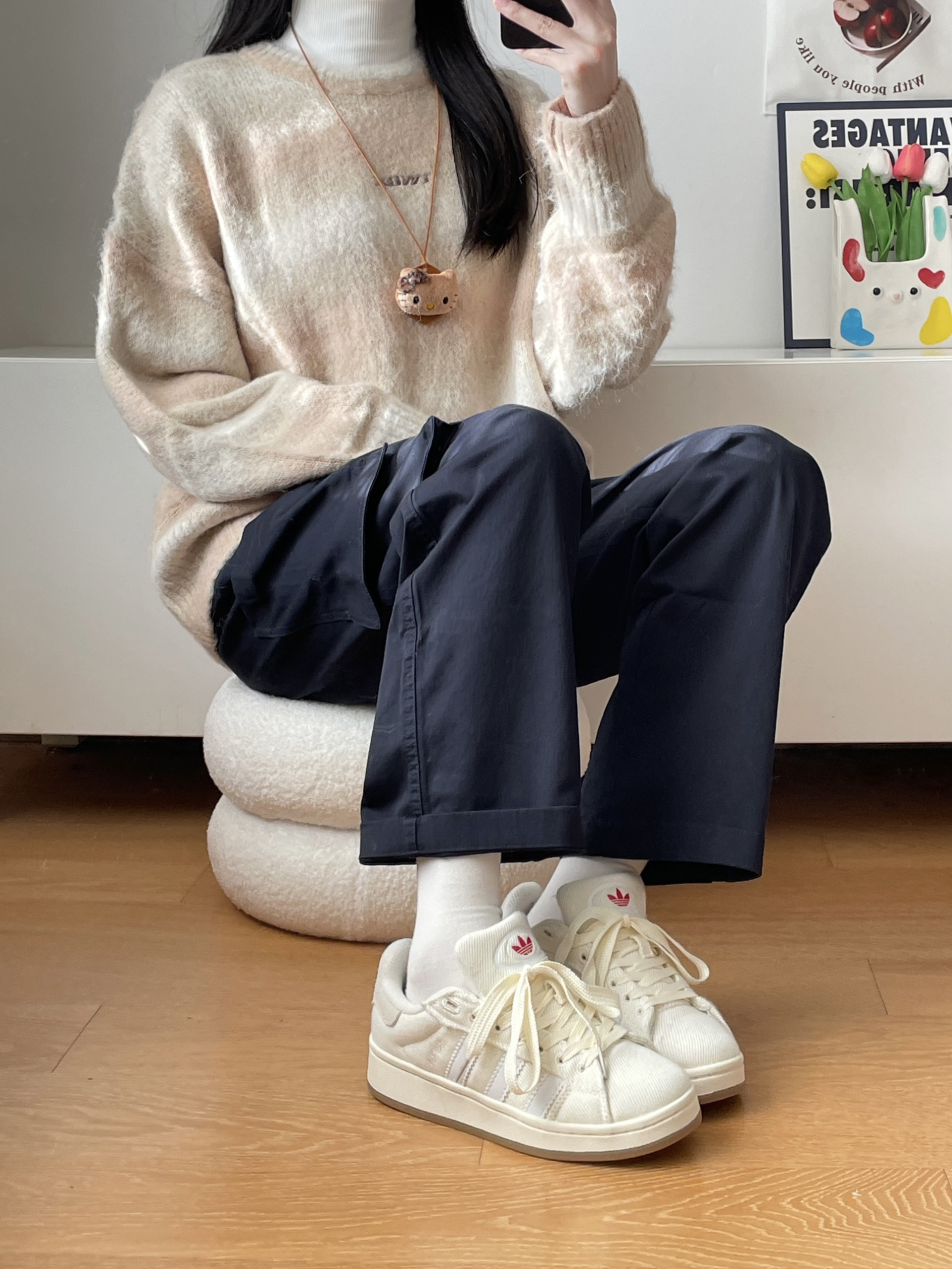 秋冬就要穿软糯糯的毛衣呀 搭配奶fufu的小白鞋 鞋底很软 走路好舒服呀 圆圆的鞋头也很可爱🥰 不愧是国潮 两位数就能get啦✌️
