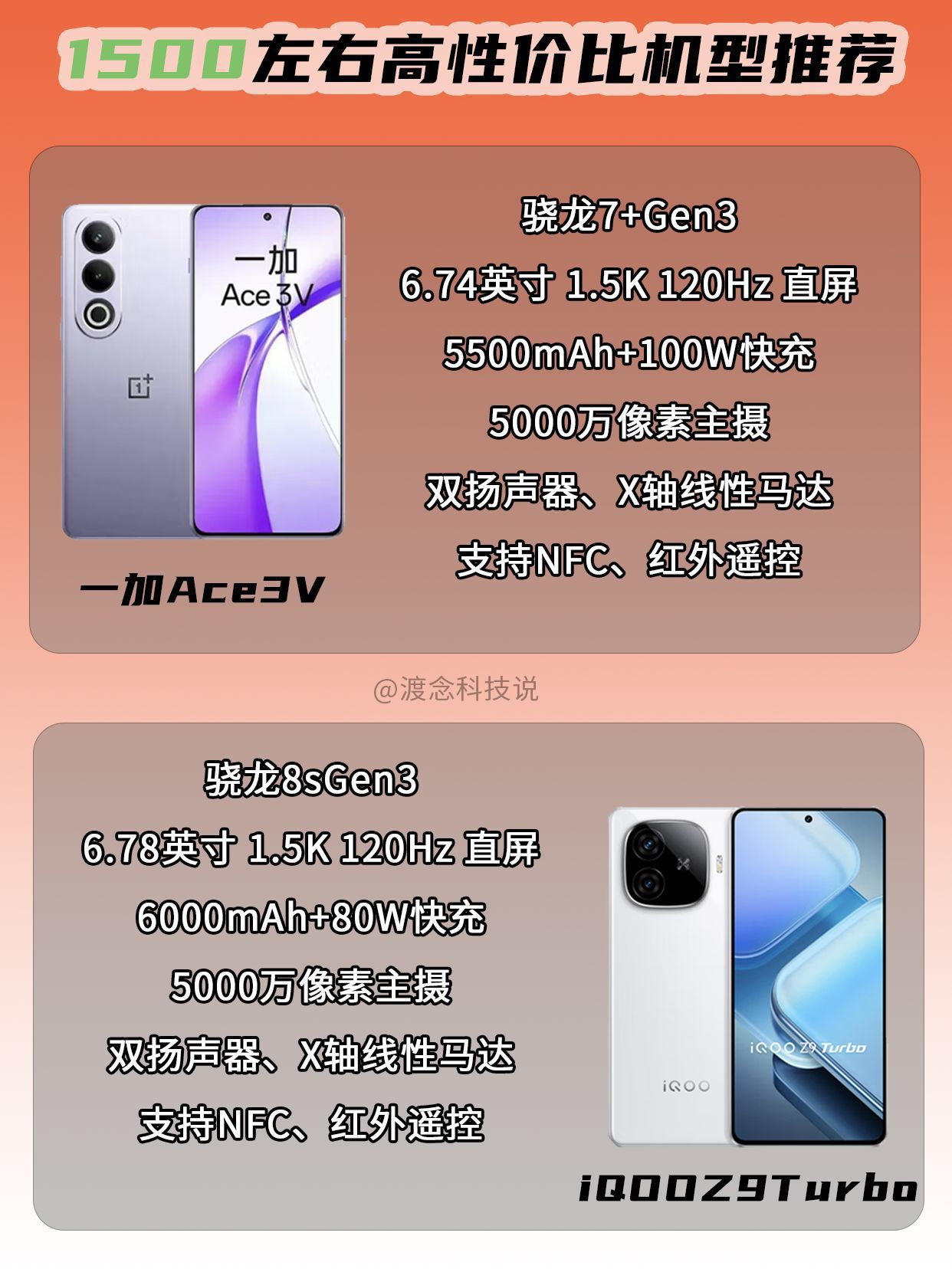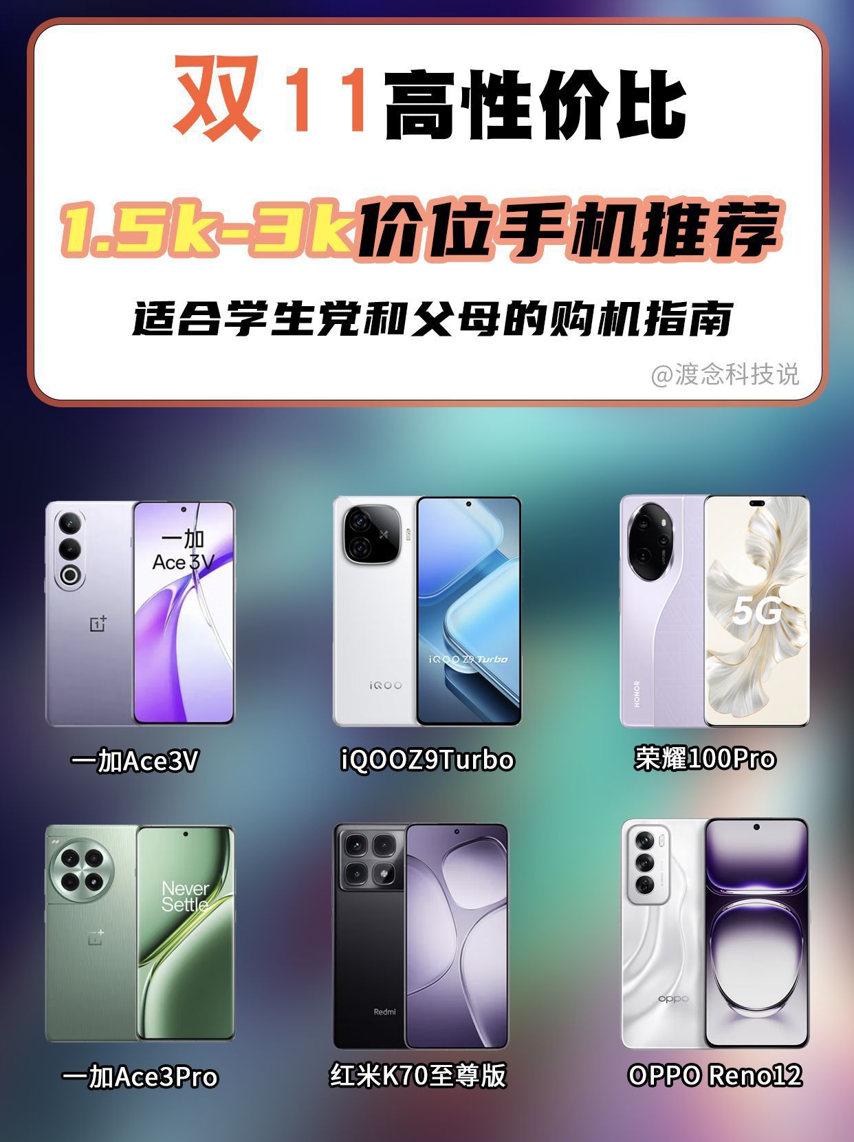 双十一到了,很多学生党朋友有换机的需求或者是想给家中长辈选一台合适的、性价比高的手机,并且大部分人的购机预算都在1500-3000这个价位段中,那我们就一起来看看本期内容所推荐的9款机型吧。 首先是1500左右 一加Ace3V从发布开始到现在都是热门的千元神机。同档中罕见的玻璃后盖,质感领先。不仅颜值较高,性能表现也非常出色,骁龙7+Gen3性能不输同级骁龙8sGen3,搭配OPPO旗舰级的潮汐...