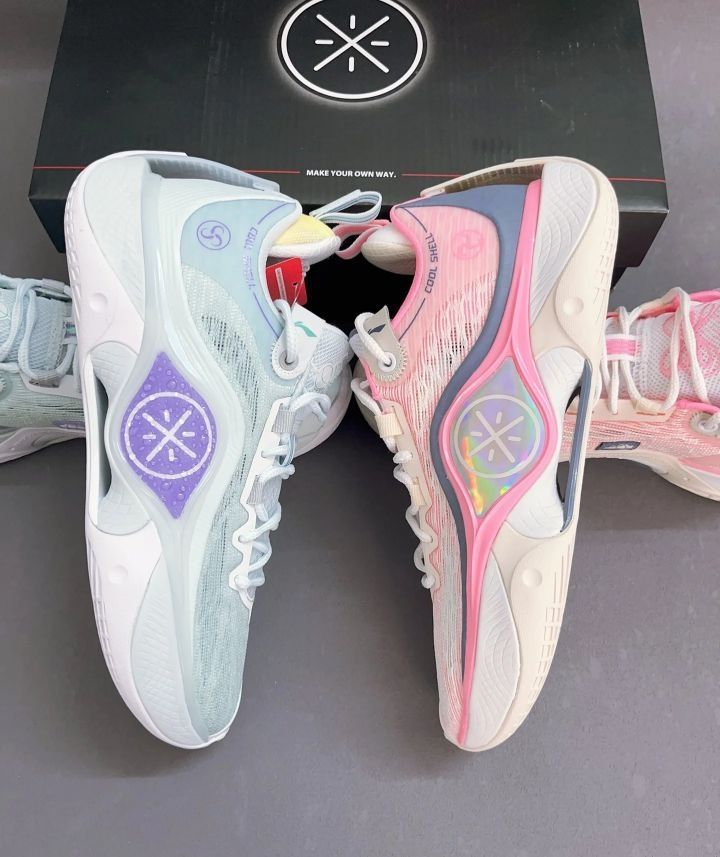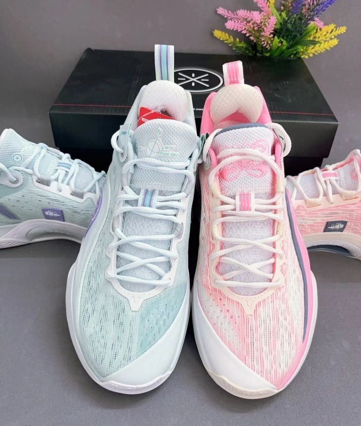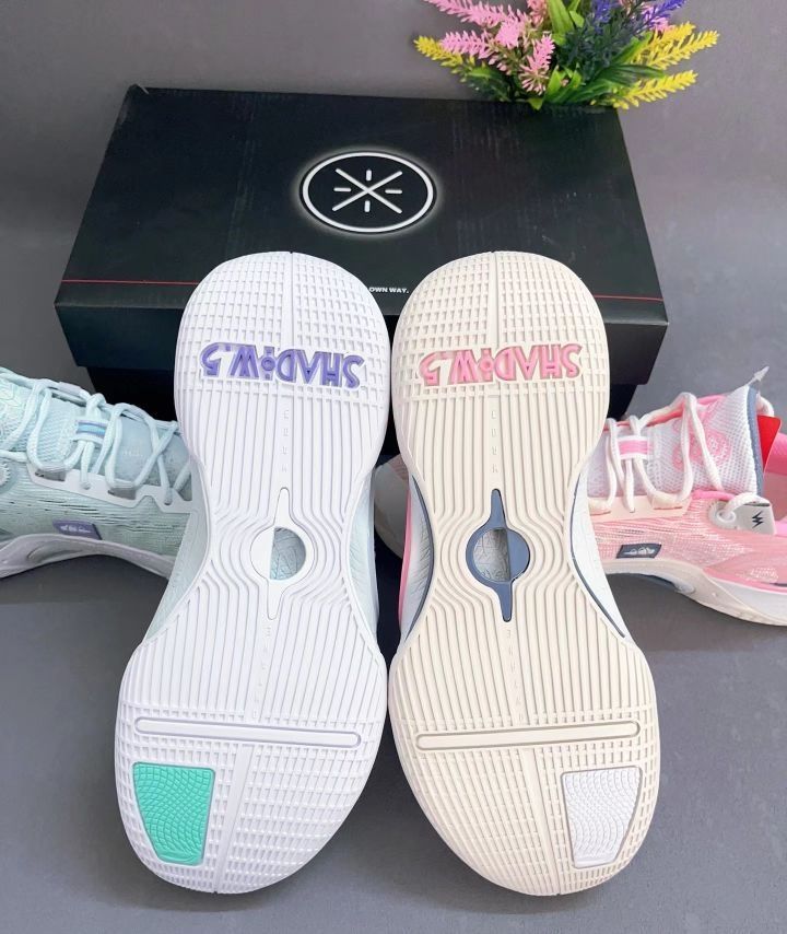 幻影5V2的颜值就是高 蓝白色配色清新脱俗 桃粉色配色张扬热烈 蓝白色款韦德logo水滴设计栩栩如生 粉色款韦德logo镭射设计惹人眼球 在性能方面 缓震回弹防滑耐磨 我才不要二选一 都拿下就可以搭配鸳鸯