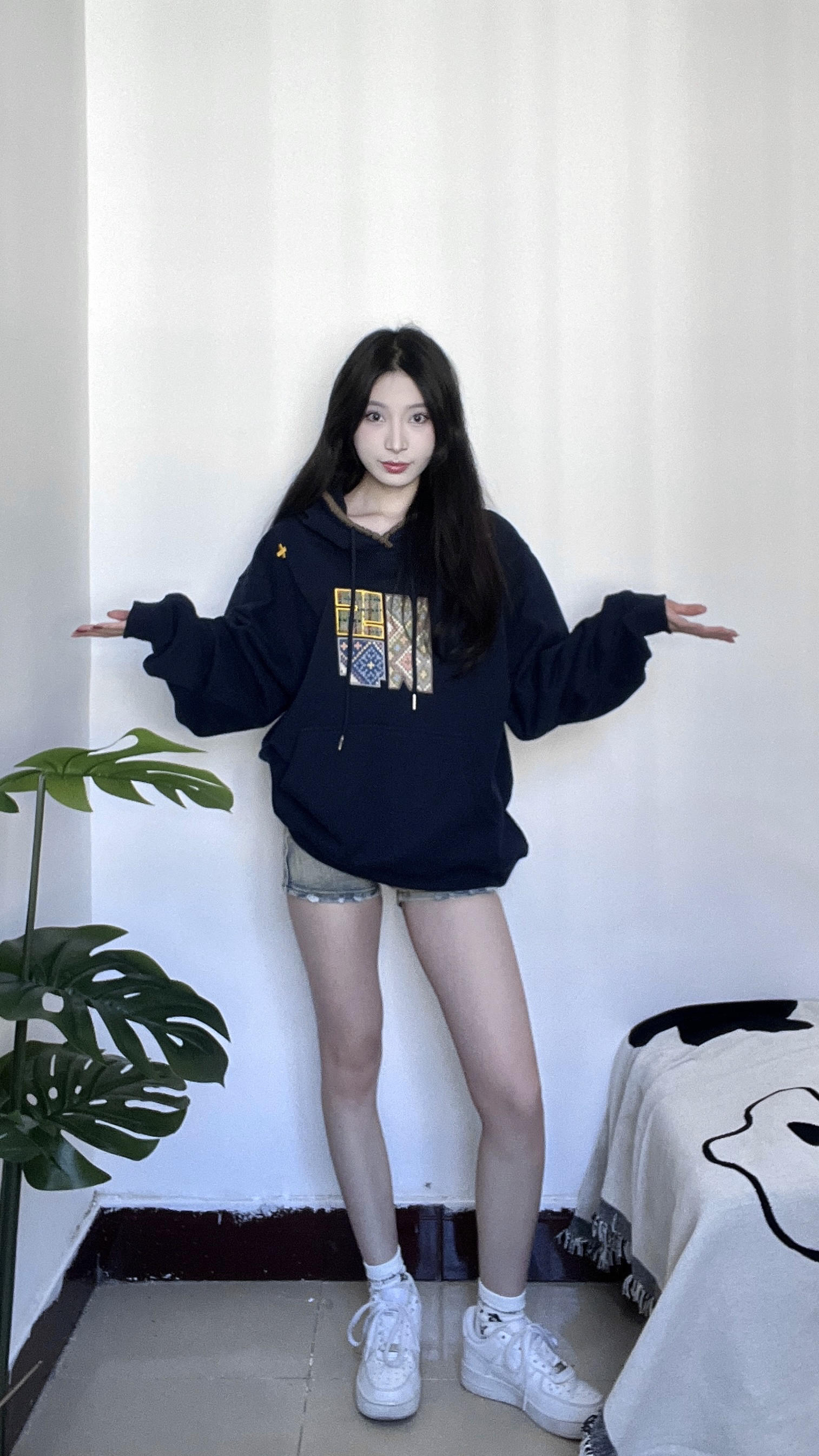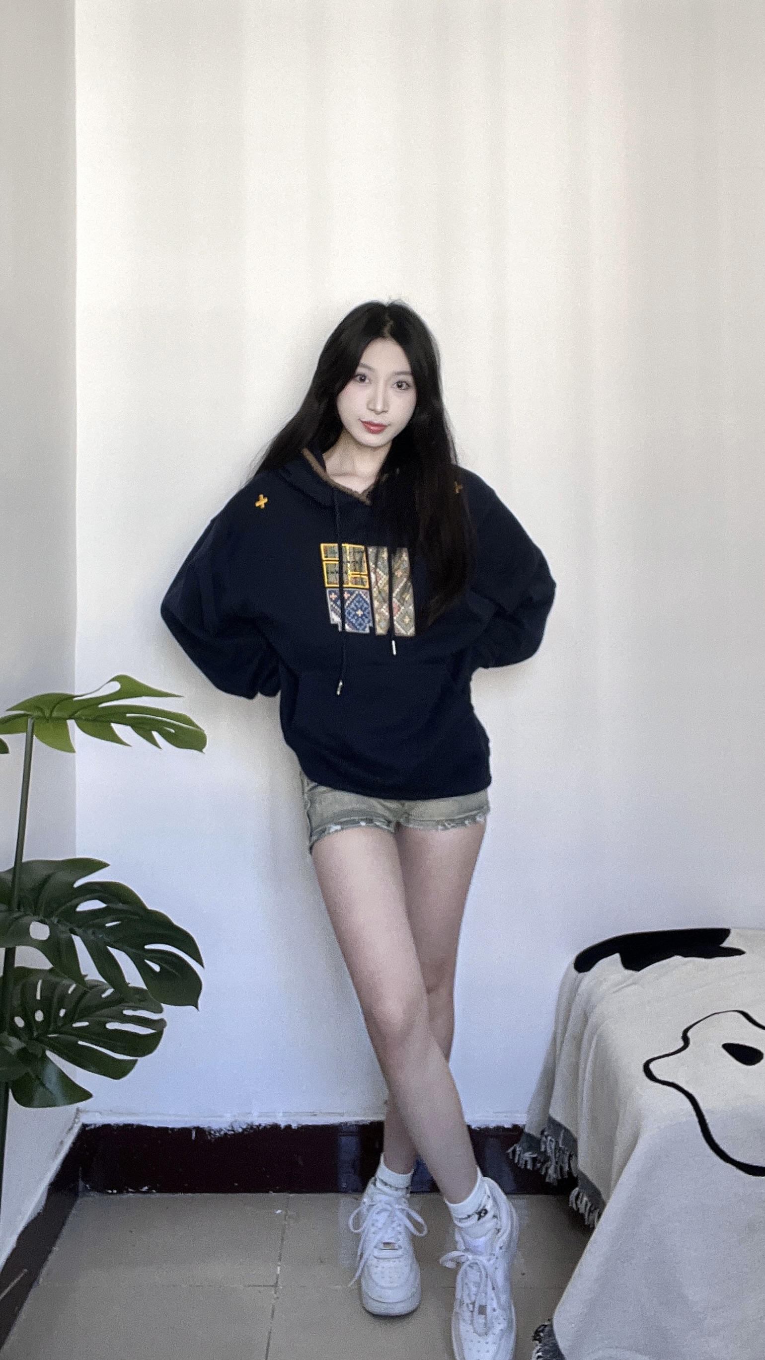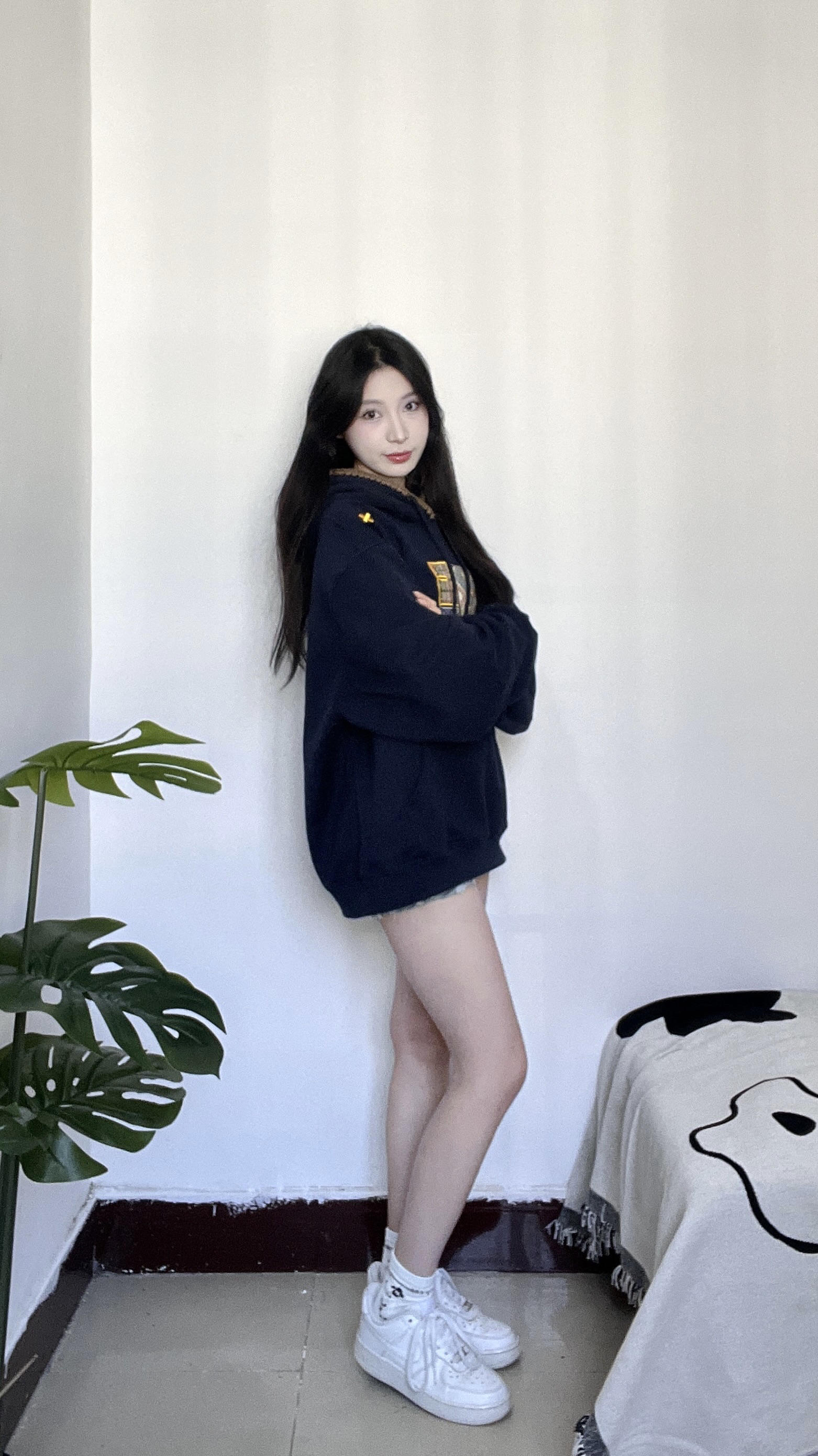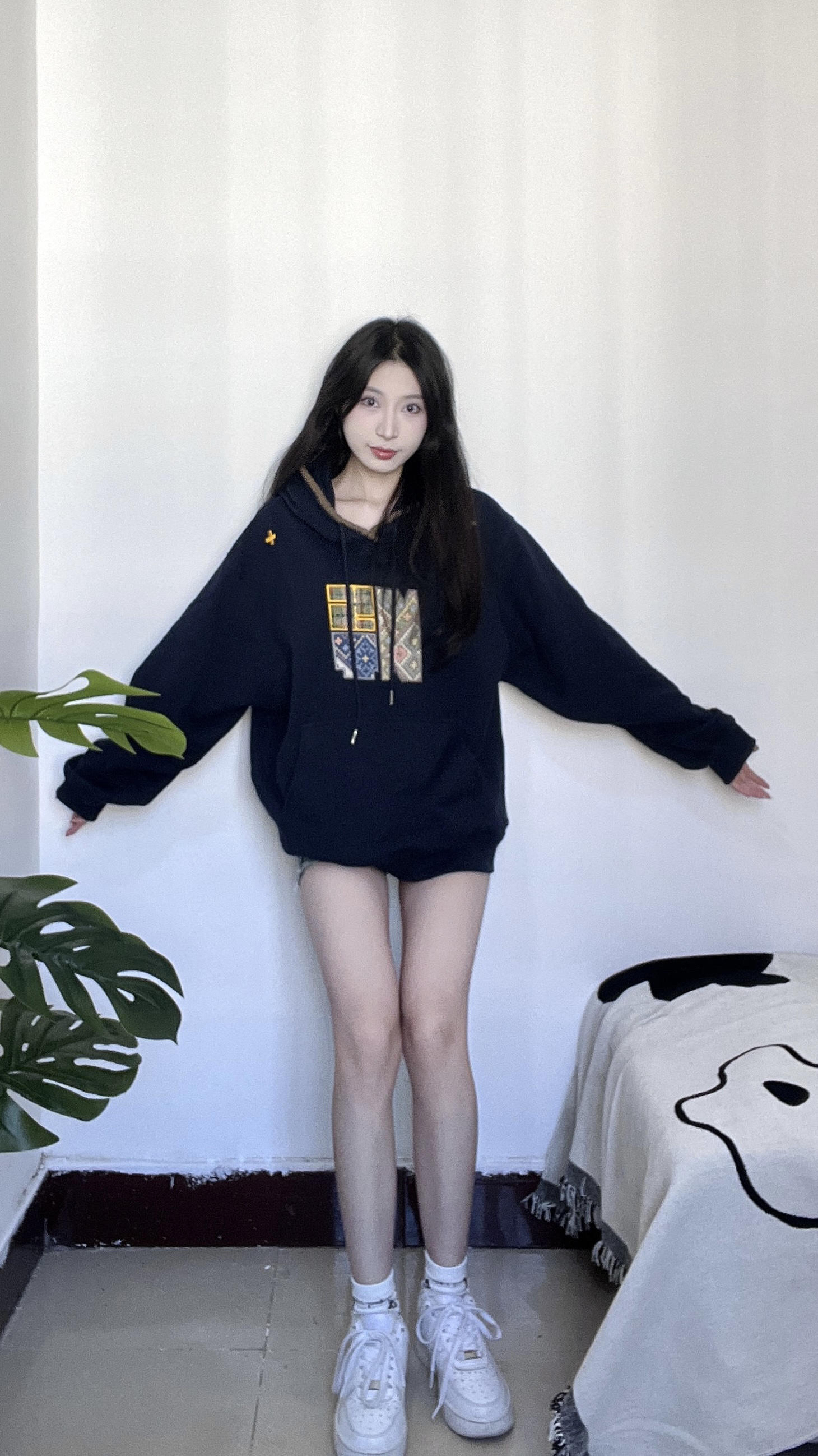 藏蓝色卫衣加上针织的图案真的hen时尚 帽子边边上针织的一圈感觉设计感满满 很适合秋冬的一件卫衣 衣服上的图案也是布料的不是烙上去的那种 是衣服看起来更有质感 衣服很厚实很有重量单穿出去一点都不冷 很青春活力的感觉